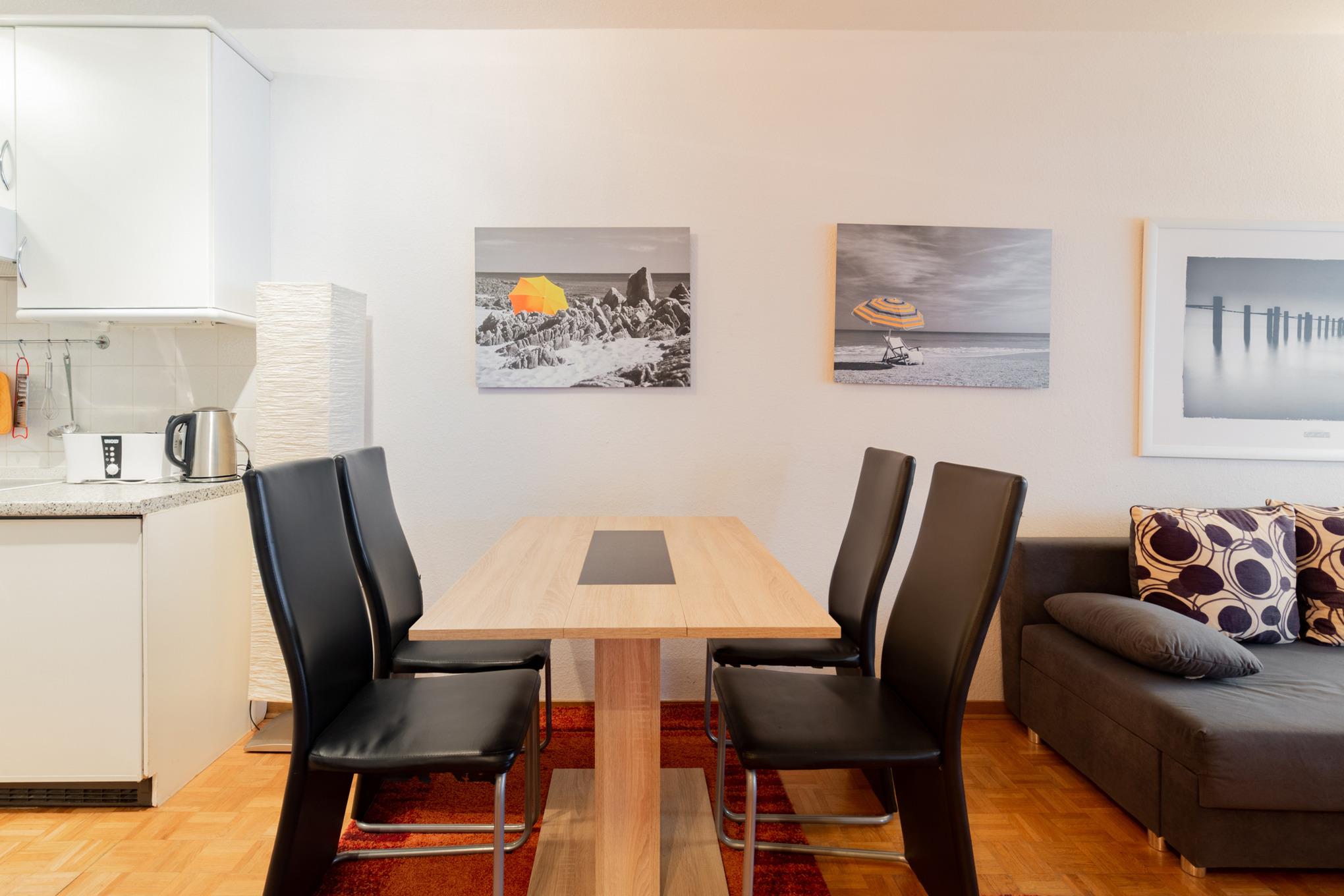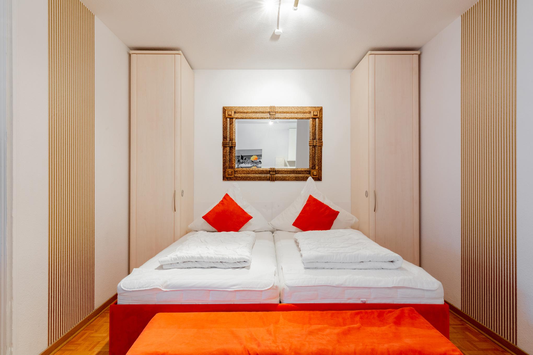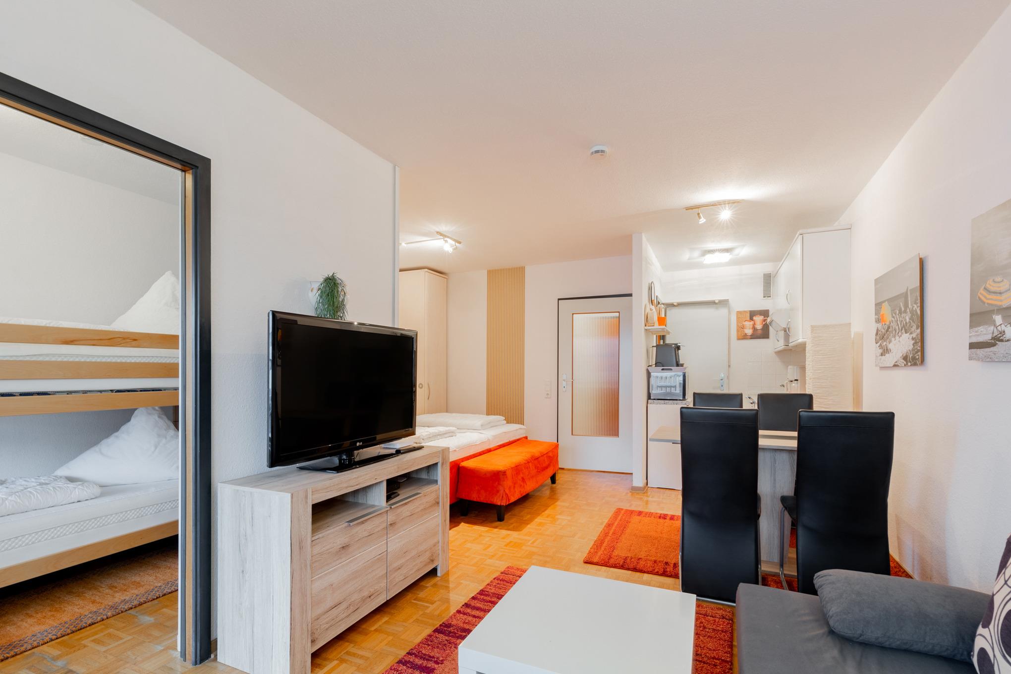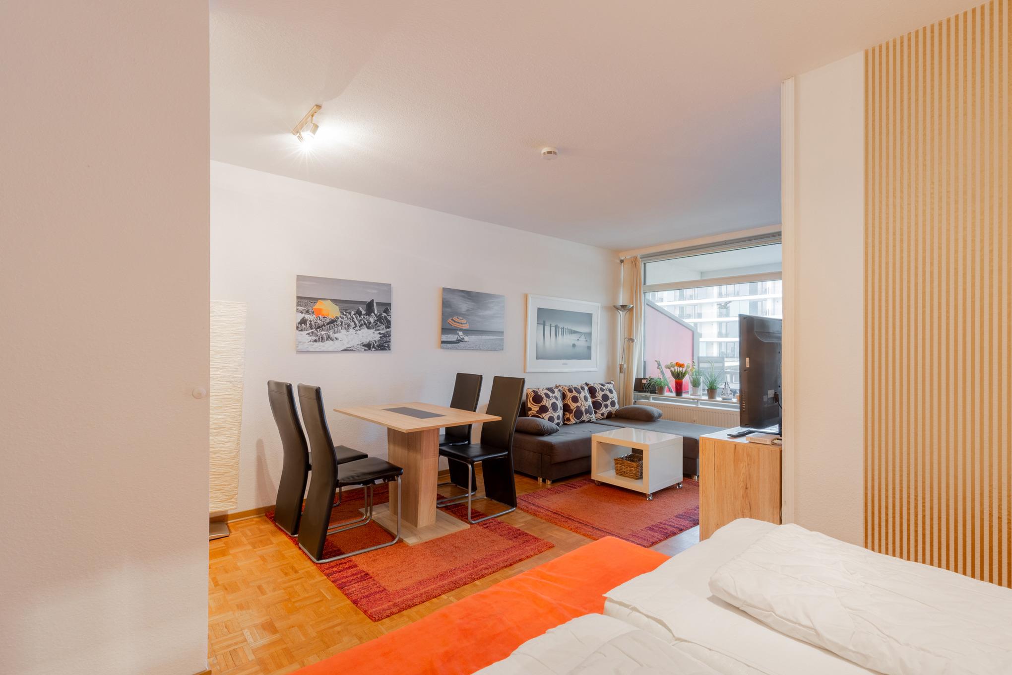 Freundliches Wohn- und Schlafzimmer mit direktem Zugang zum Balkon in östliche Richtung. Das Wohn- und Schlafzimmer ist mit einer Couch, einem Essplatz für 4 Personen, einem Doppelbett (2x 90x200cm) und einem Kleiderschrank ausgestattet. Zur Unterhaltung stehen ein Flachbildschirm, ein DVD-Player und eine Mini-Stereoanlage mit CD-Player zur Verfügung. Das Zimmer ist mit Parkettboden ausgelegt. Das Fenster lässt sich durch einen Vorhang und ein Rollo etwas verdunkeln.