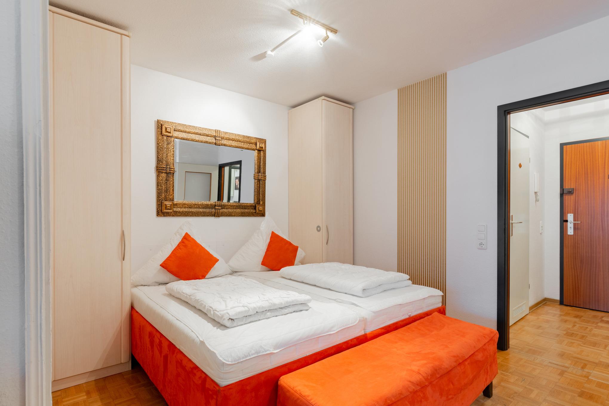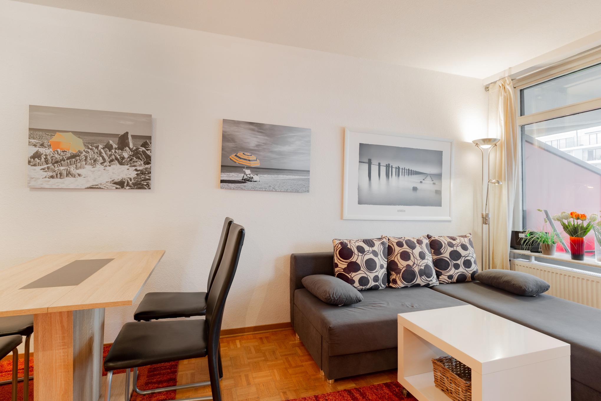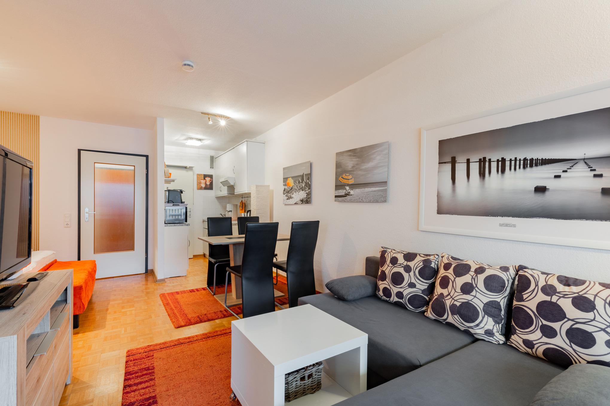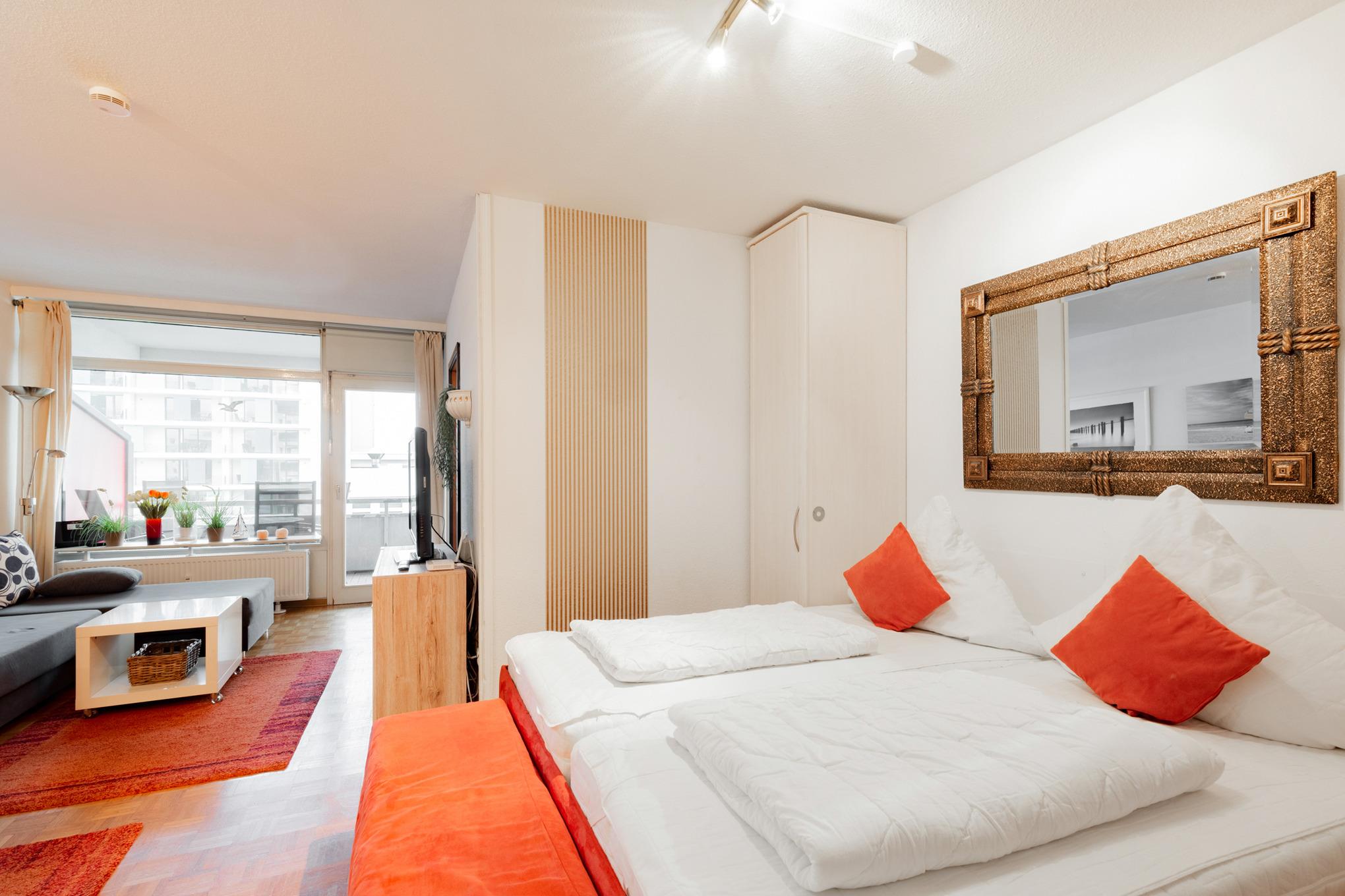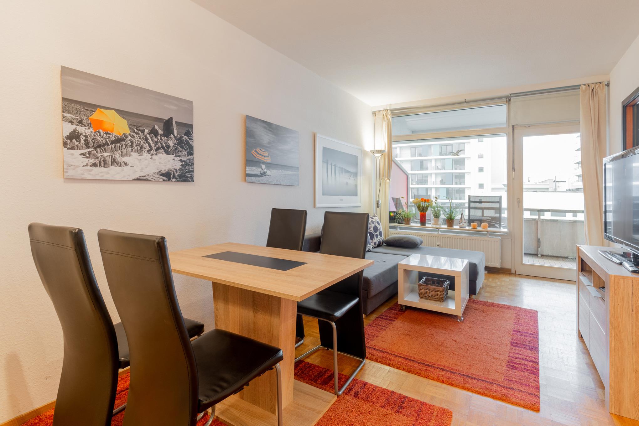 Freundliches Wohn- und Schlafzimmer mit direktem Zugang zum Balkon in östliche Richtung. Das Wohn- und Schlafzimmer ist mit einer Couch, einem Essplatz für 4 Personen, einem Doppelbett (2x 90x200cm) und einem Kleiderschrank ausgestattet. Zur Unterhaltung stehen ein Flachbildschirm, ein DVD-Player und eine Mini-Stereoanlage mit CD-Player zur Verfügung. Das Zimmer ist mit Parkettboden ausgelegt. Das Fenster lässt sich durch einen Vorhang und ein Rollo etwas verdunkeln.