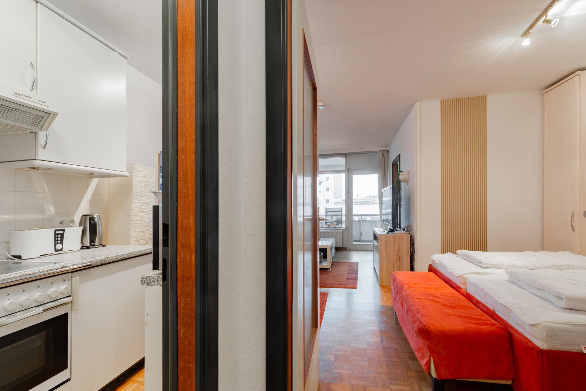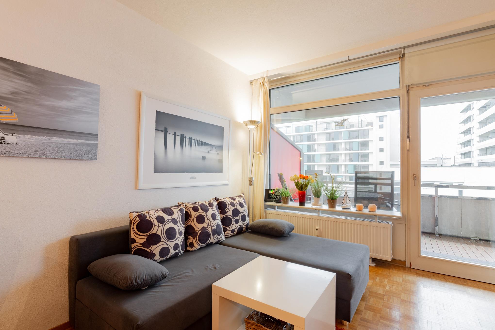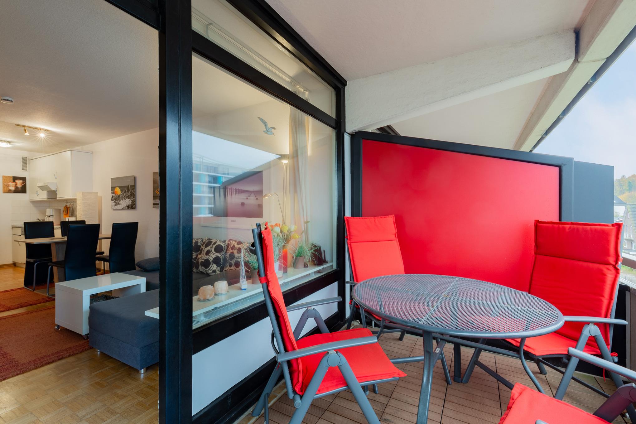 Balkon in östliche Richtung mit Teilseeblick. Eine begrenzte Parkmöglichkeit steht am Haus zur Verfügung, Münzwaschmaschinen und Trockner sowie ein Fahrradraum im Haus. Aufzug.