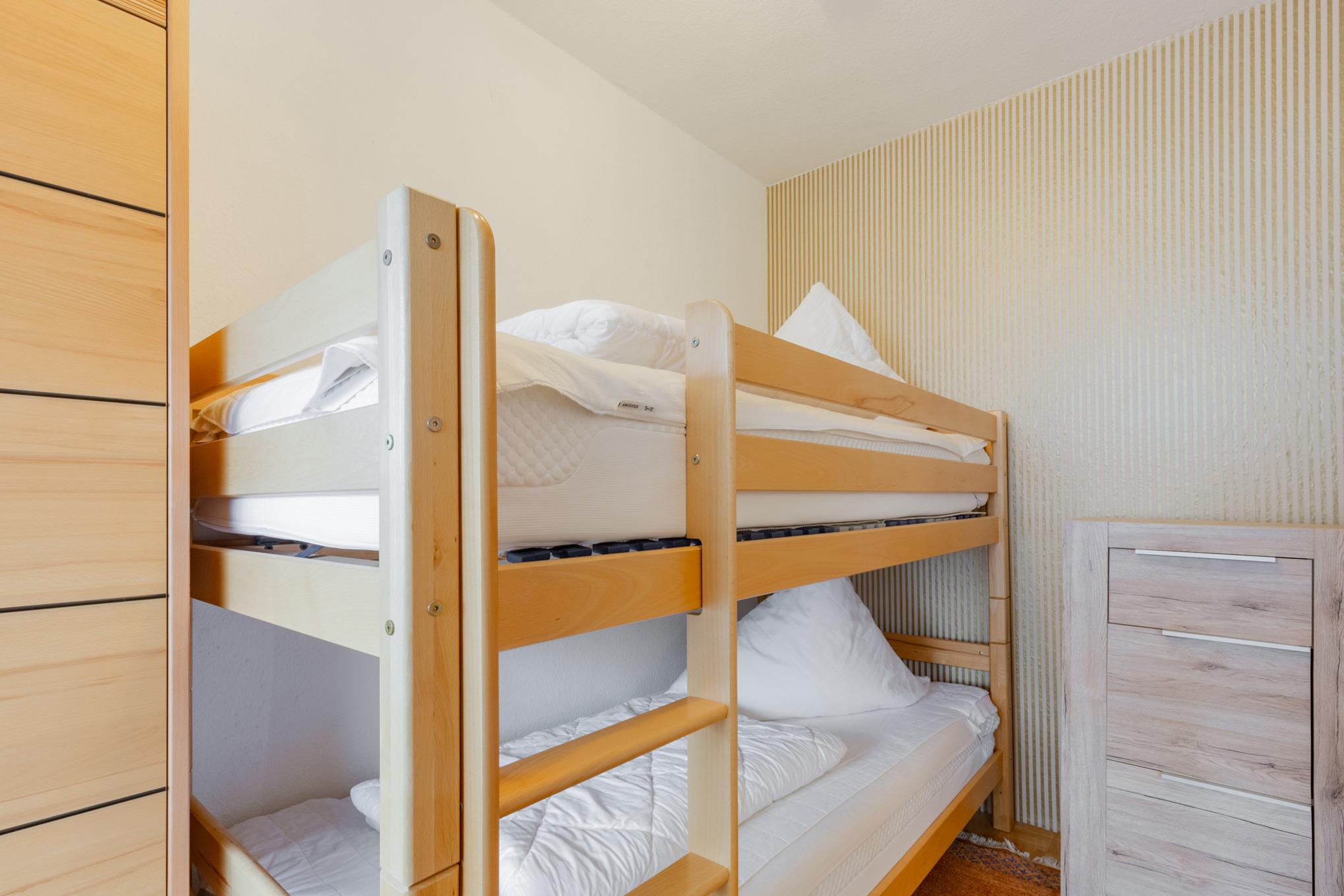 Separates, freundliches Zimmer mit Parkettboden einem Etagenbett extra für Erwachsene geeignet (90x200 cm) und einem Kleiderschrank. Das Fenster lässt sich durch einen Vorhang etwas verdunkeln.