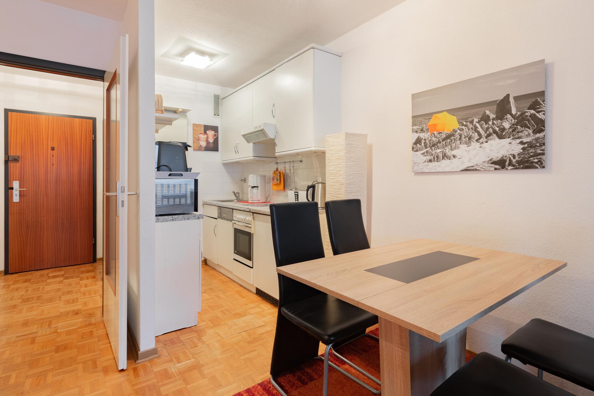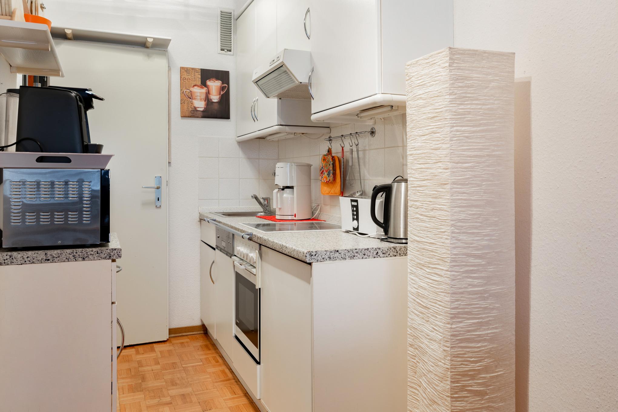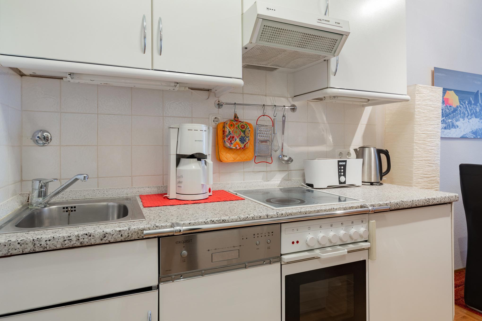 Komplett eingerichtete, zum Wohnbereich offene Küche mit 4 Platten E-Herd, Backofen, Spülmaschine, Kühlschrank mit kleinem 3-Sterne Gefrierfach, Mikrowelle, Kaffeemaschine, Toaster und Wasserkocher.
