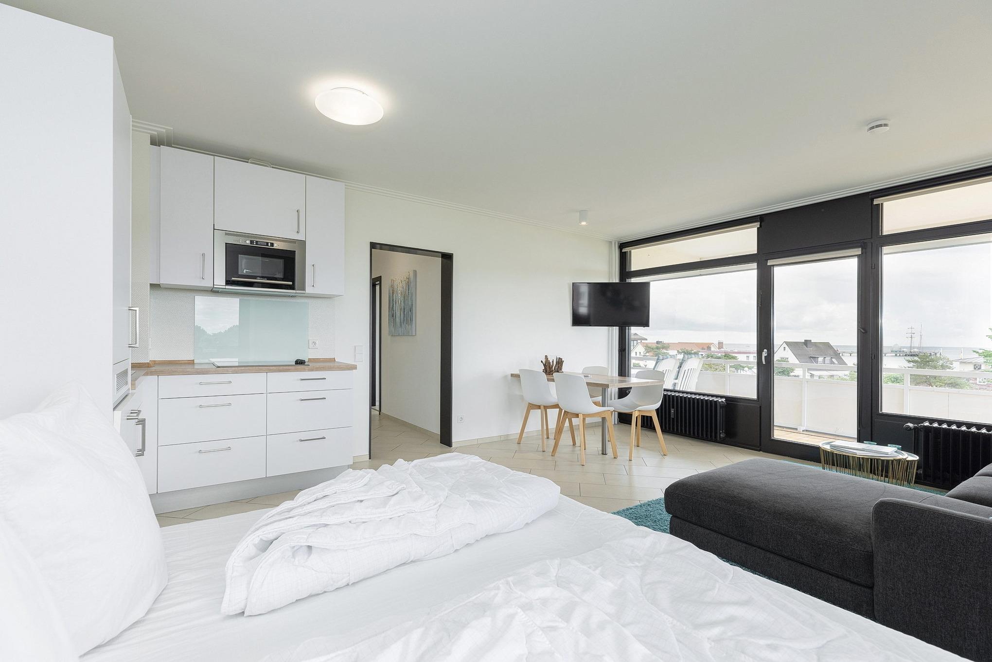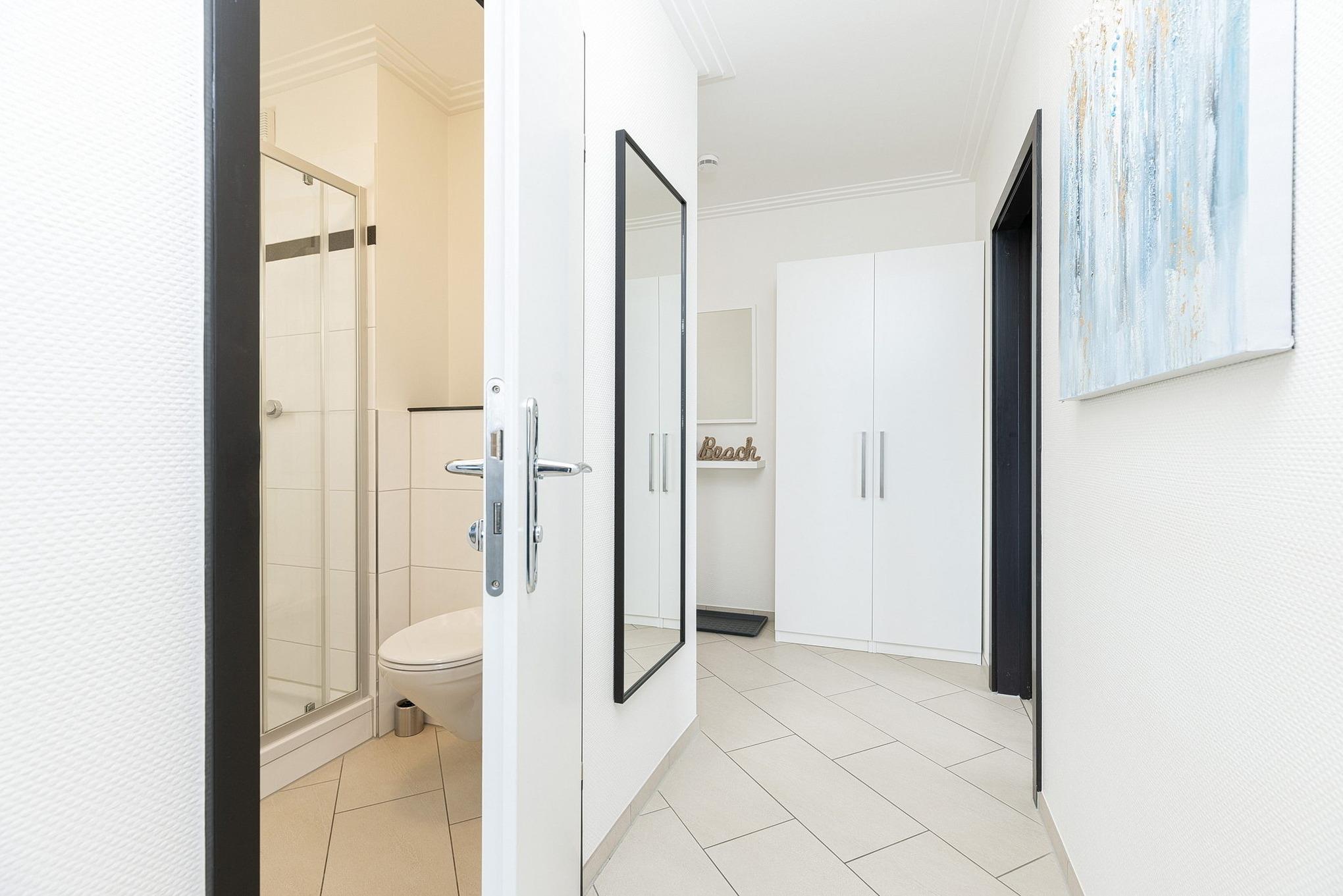 Eine begrenzte Parkmöglichkeit steht am Haus zur Verfügung, Münzwaschmaschinen, Trockner, Aufzug sowie ein Fahrradraum im Haus. Großer, sonniger Eckbalkon in südliche und westliche Richtung mit Blick auf die Ostsee. Kostenloses WLAN.