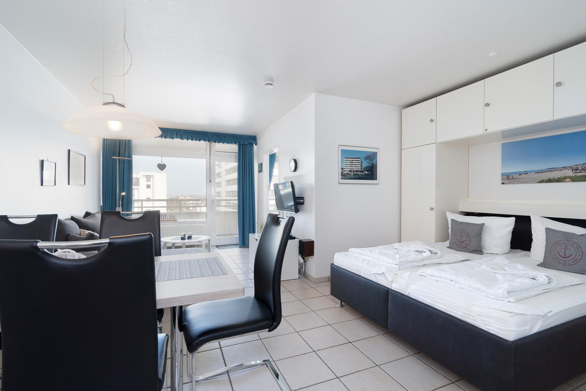 Moderner Wohn- und Schlafbereich mit Essplatz für 4 Personen. Der Wohn- und Schlafbereich ist mit einem Doppelbett (2x 80x200cm), 2 kleinen Kleiderschränken, einer Eckcouch und einem Couchtisch ausgestattet. Vom Wohnbereich besteht ein direkter Zugang zum Balkon. Zur Unterhaltung stehen ein Flachbild-Fernseher, ein DVD-Player und eine Mini-Stereoanlage mit CD-Player zur Verfügung. Der Wohn- und Schlafbereich ist gefliest. Die Fenster und die Tür lassen sich durch einen Vorhang blickdicht verdunkeln.