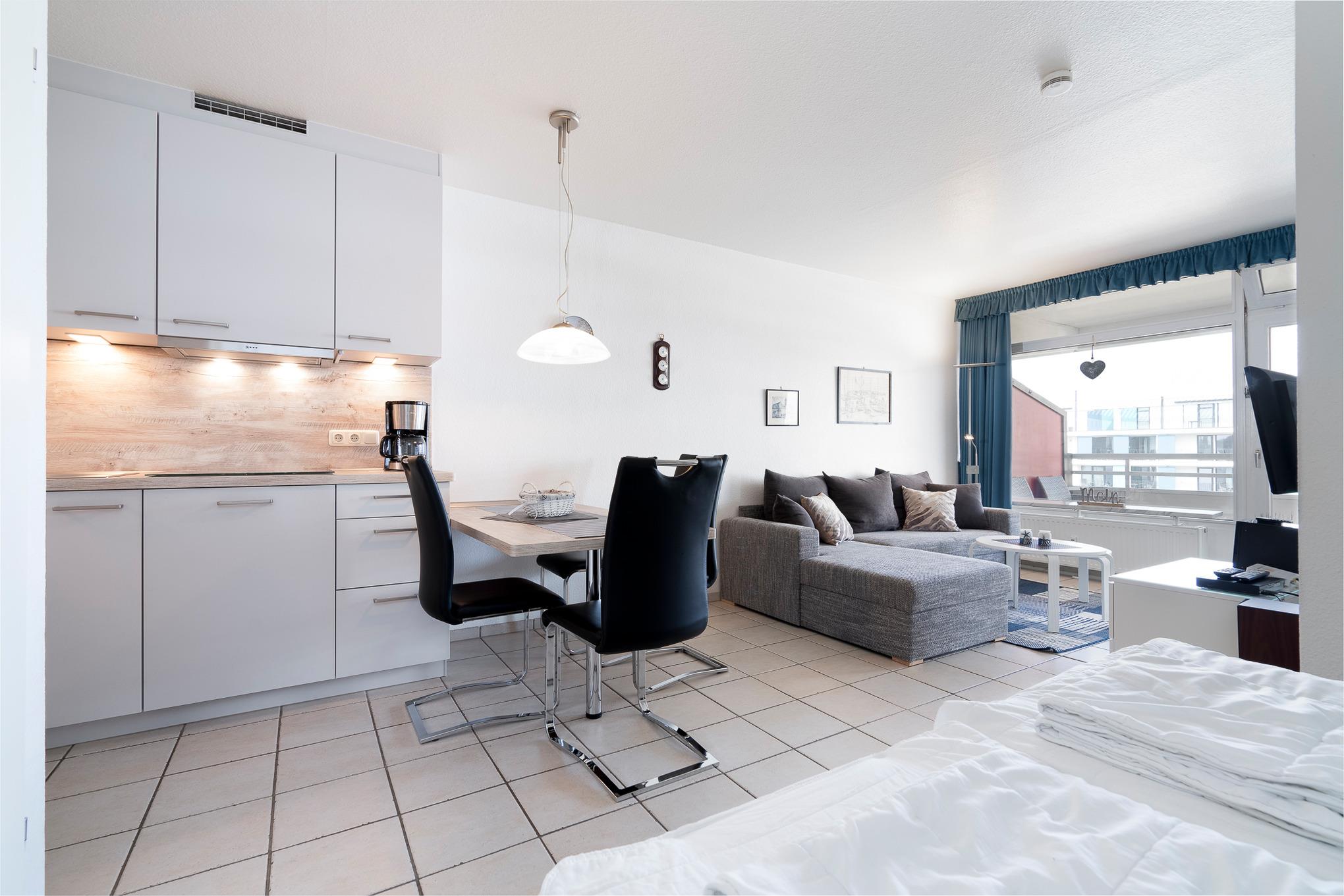 Moderne, neue, komplett eingerichtete, zum Wohnbereich offene Küche mit einem 4-Platten Cerankochfeld, einer Spülmaschine, Backofen, Kühlschrank mit kleinem 3-Sterne Gefrierfach, Mikrowelle, Kaffeemaschine, Toaster und Wasserkocher.