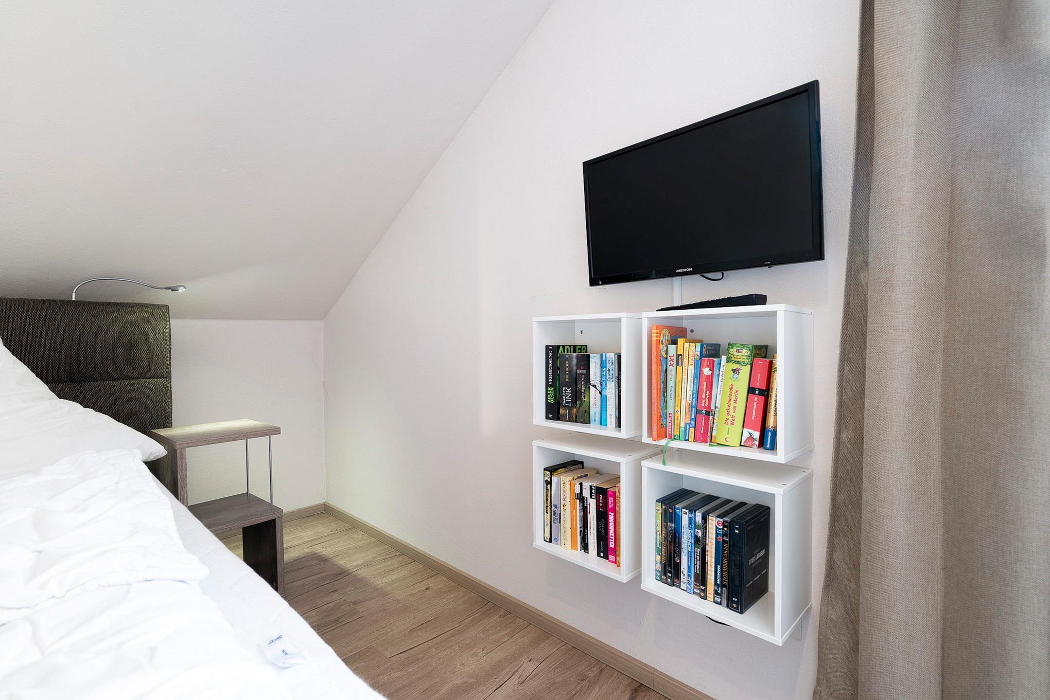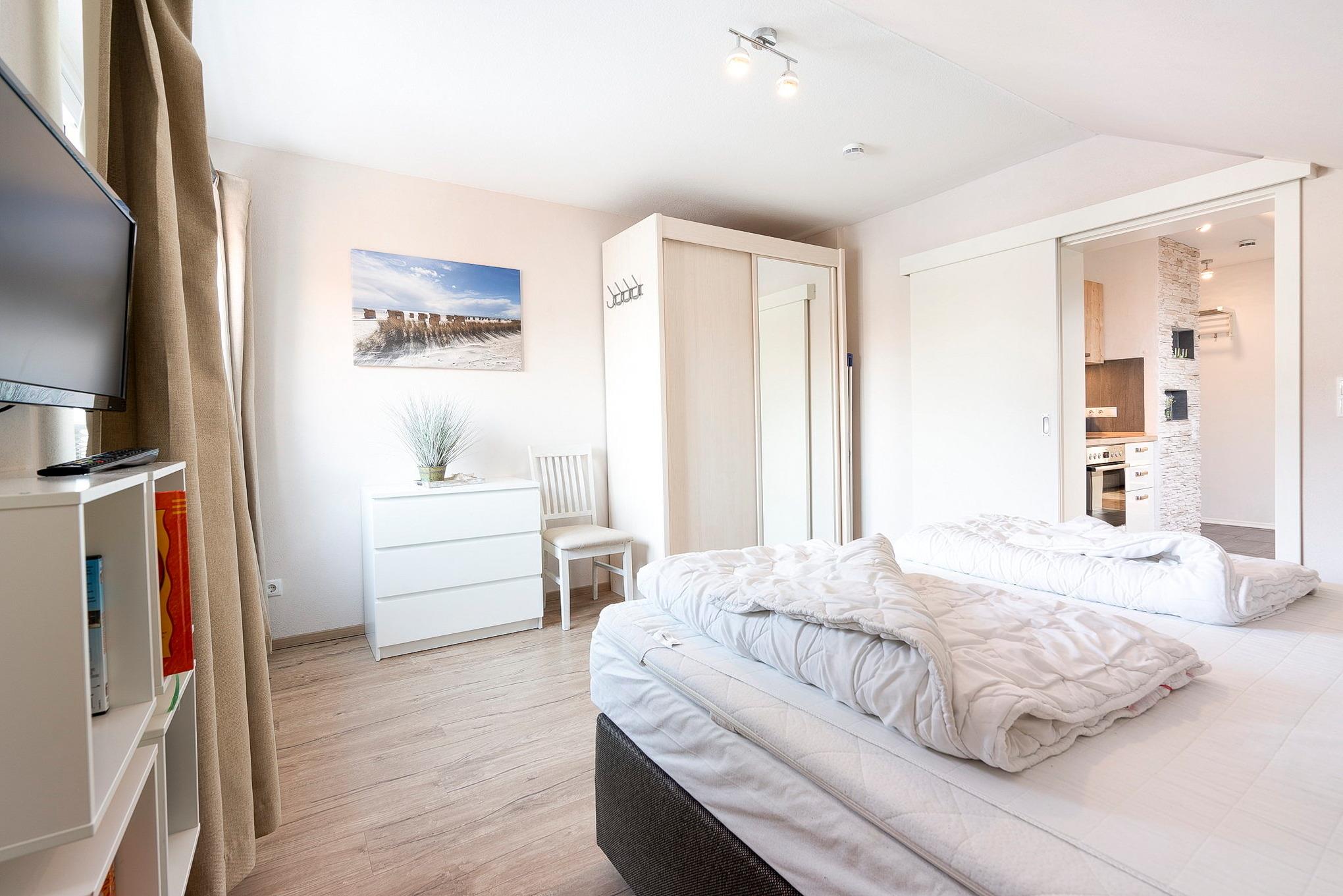 Modernes, freundliches, separates Schlafzimmer mit einem Boxspringbett (180 x 200cm), Nachtschränken, einem 2-türigen Kleiderschrank und einer Kommode. Zur Unterhaltung steht ein Flachbildfernseher (SAT) mit DVD-Player zur Verfügung. Das Zimmer ist mit Laminatboden ausgelegt, das Fenster lässt sich durch eine Innenjalousie etwas verdunkeln.