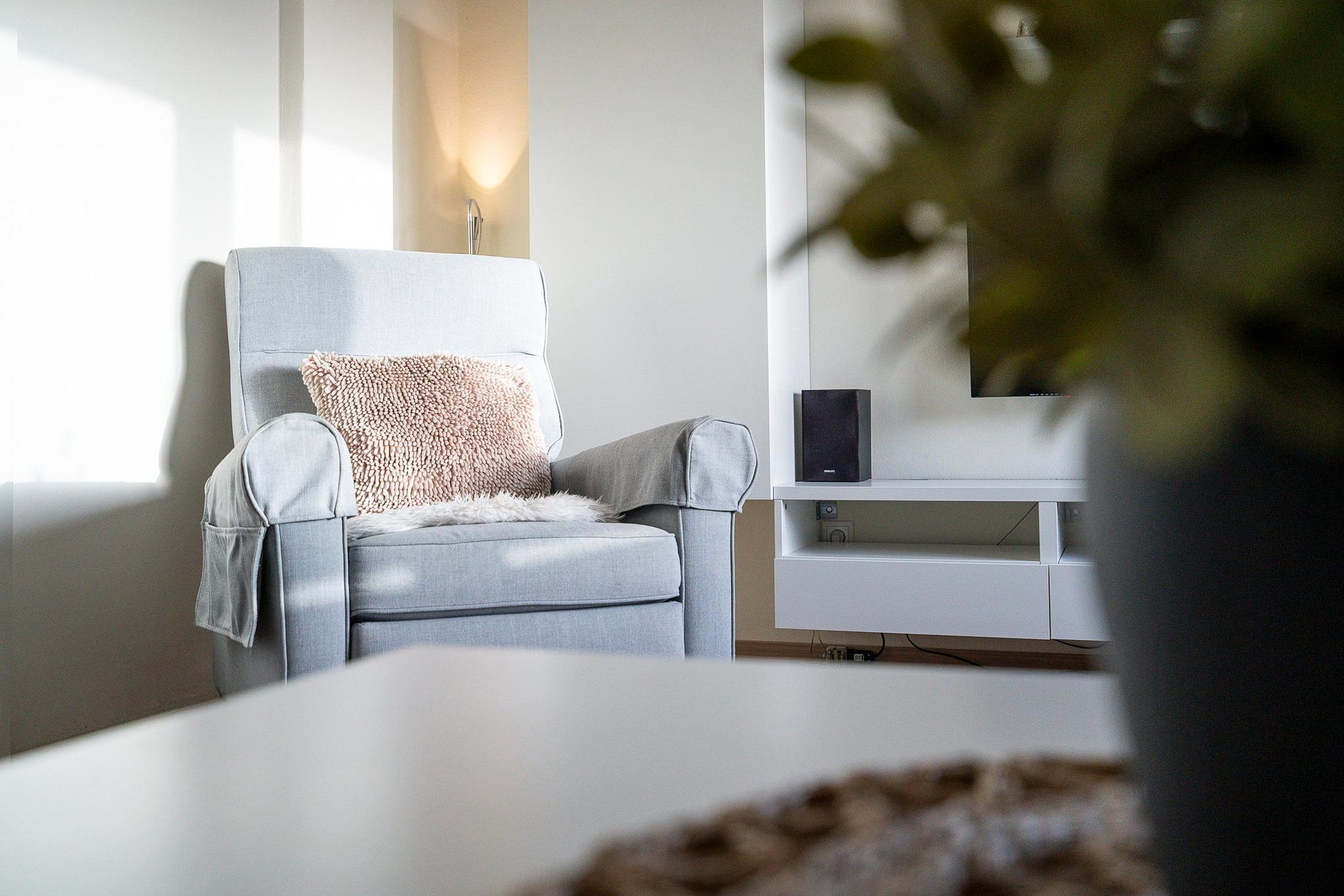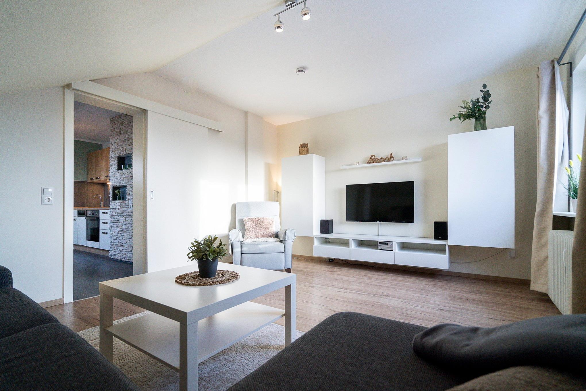 Modernes, helles, freundliches Wohnzimmer mit einer Schlafcouch (140x200cm mit Lattenrost), einem Couchtisch und einem Wohnzimmerelement. Zur Unterhaltung steht ein Flachbildfernseher (SAT) zur Verfügung. Das Wohnzimmer ist mit Designer-Planken ausgelegt, das Fenster lässt sich durch eine Innenjalousie etwas verdunkeln.