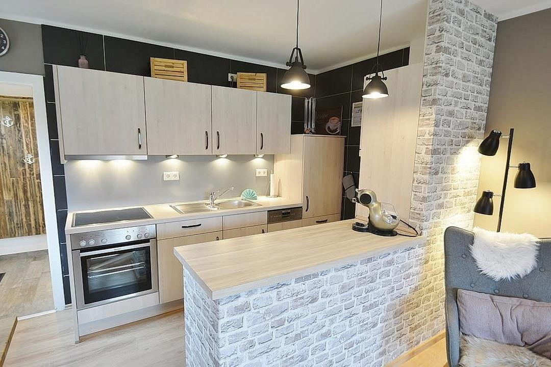 Zum Wohn-Schlafbereich offene moderne Küchenzeile mit 4- Platten-Cerankochfeld, Backofen, Spülmaschine und Kühlschrank mit kleinem 3-Sterne-Gefrierfach. Des Weiteren stehen eine Kaffeemaschine, eine Mikrowelle, ein Wasserkocher, ein Toaster und ein Eierkocher zur Verfügung.
