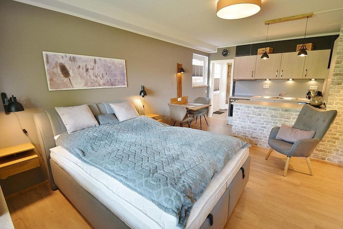 Kombinierter Wohn-Schlafbereich mit Zugang zur gemütlichen Terrasse. Der Raum ist ausgestattet mit einem Boxspringbett (160x200cm), einem Kleiderschrank, einem Sessel sowie einem Essplatz für 2 Personen. Zur Unterhaltung steht ein Flachbild-TV zur Verfügung. Der Boden ist mit Designer-Planken ausgelegt. Die Fenster lassen sich durch Plissees verdunkeln.