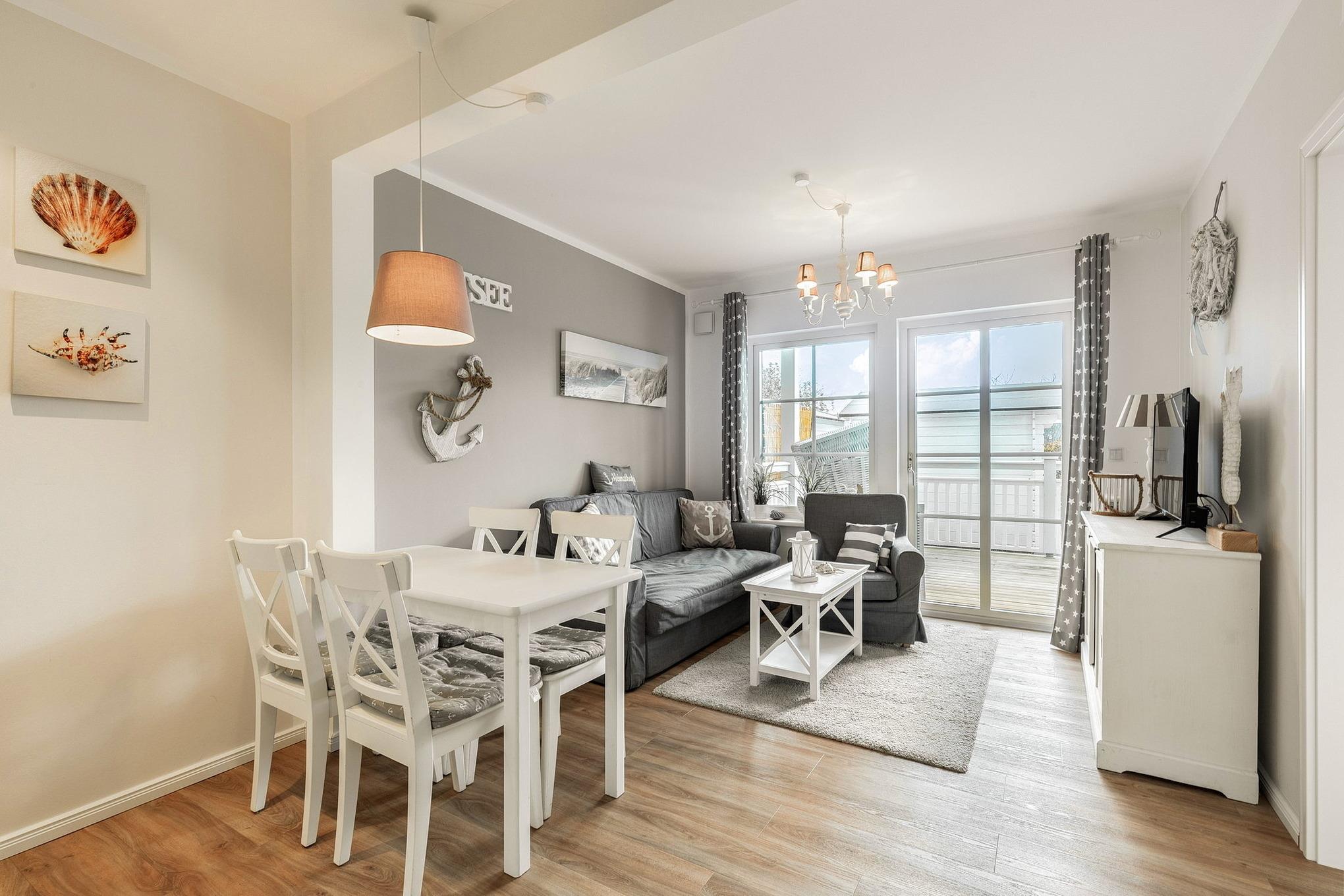 Modernes, geschmackvoll eingerichtetes Wohn- und Esszimmer mit Terrassenzugang. Das Wohn- und Esszimmer ist mit einem Sofa, einem Sessel, einer Kommode und einem Essplatz für 4 Personen ausgestattet. Das Zimmer ist mit Vinylboden ausgelegt. Zur Unterhaltung steht ein Sat-Fernseher zur Verfügung.