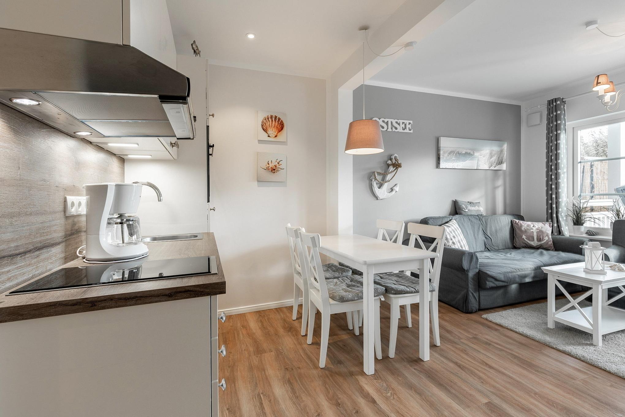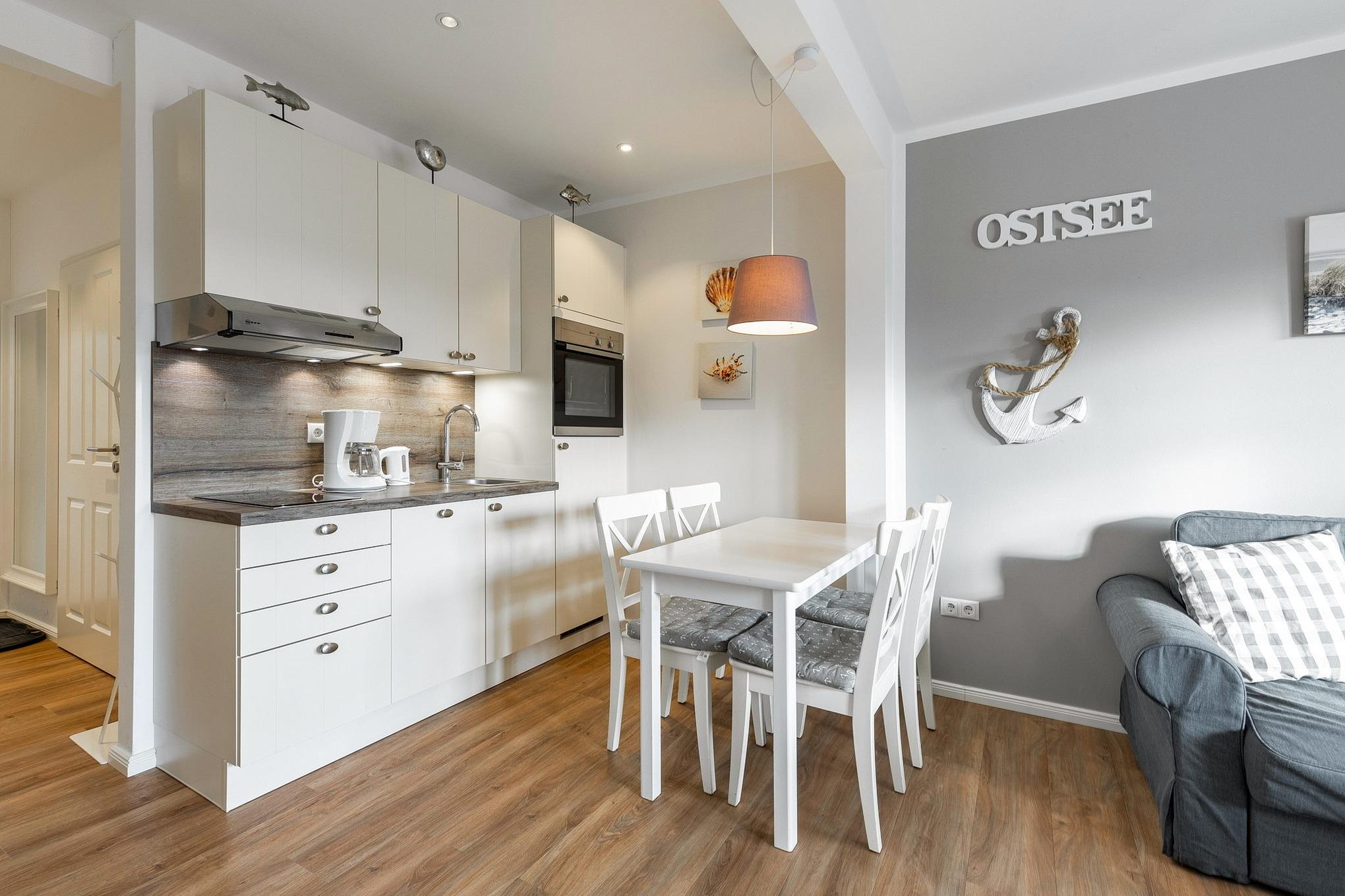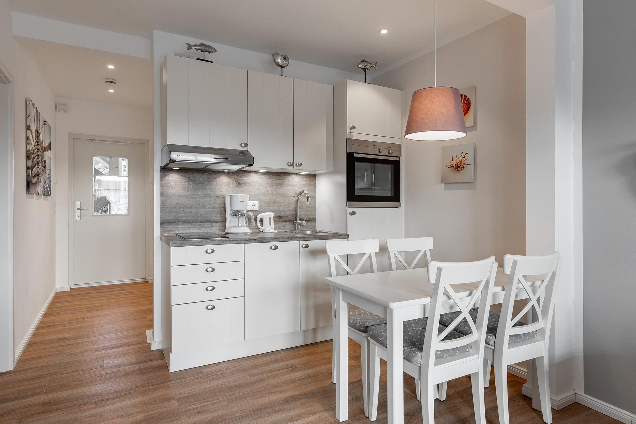 Moderne, zum Wohn- und Esszimmer offene Küche mit 2 Platten Cerankochfeld, Spülmaschine, Backofen, Kühlschrank mit kleinem 3-Sterne Gefrierfach, Kaffeemaschine, Toaster und Wasserkocher.