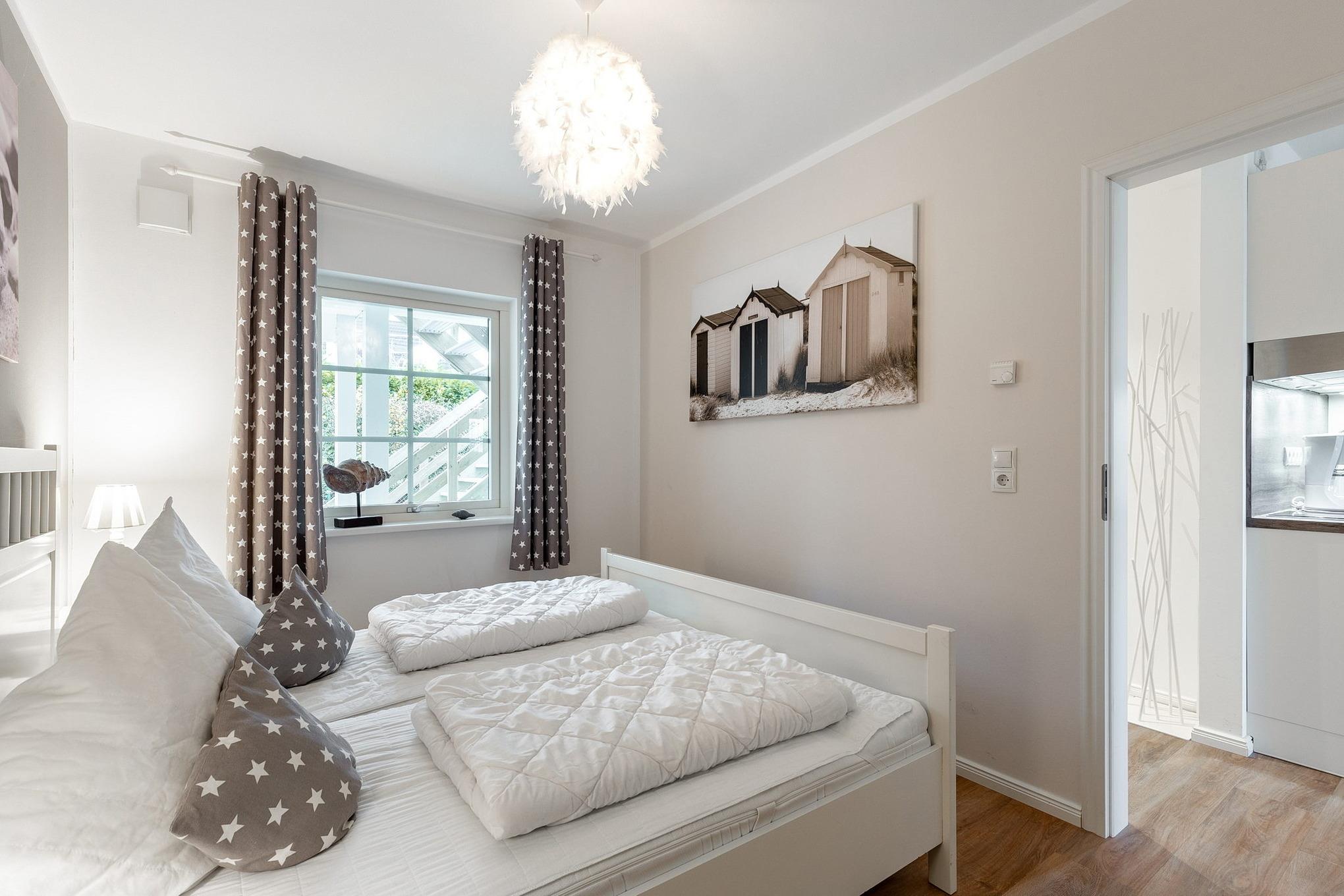 Modernes, geschmackvoll eingerichtetes Schlafzimmer. Das Schlafzimmer ist mit einem Doppelbett (2x 80x200cm), 2 Nachttischen und einem offenen Kleiderschrank ausgestattet. Das Schlafzimmer ist mit Vinylboden ausgelegt, das Fenster zum Laubengang lässt sich durch einen Vorhang etwas verdunkeln.