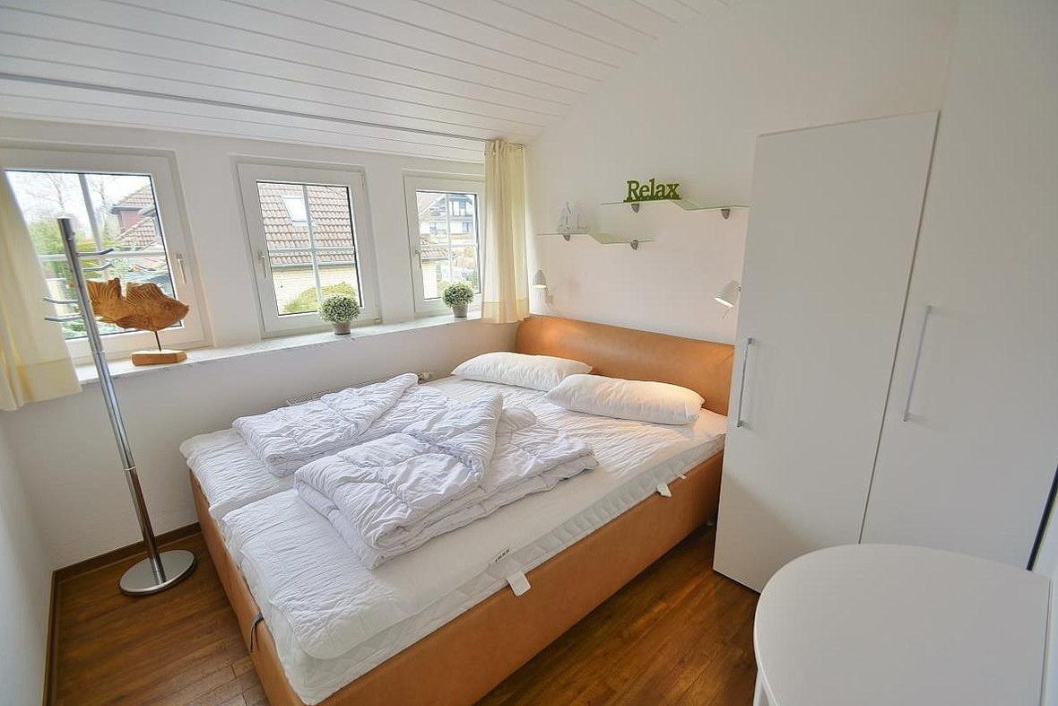 Modern eingerichtetes, kleines, separates Schlafzimmer mit einem Doppelbett (160x200cm) und einem Kleiderschrank. Das Schlafzimmer ist mit Designer-Planken ausgelegt. Das Fenster lässt sich durch einen Außenrolladen vollständig verdunkeln.