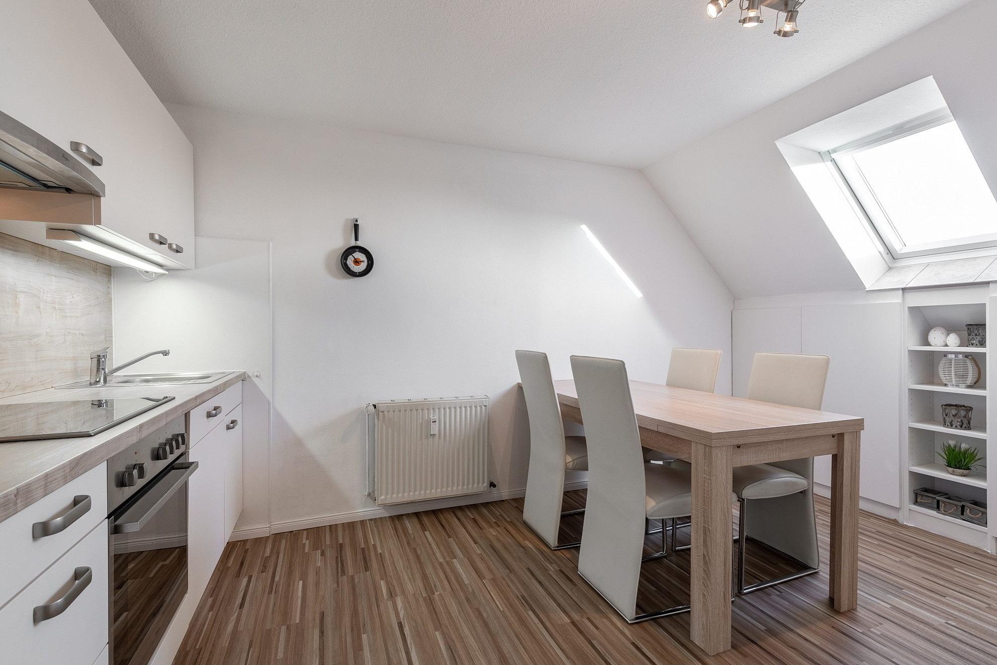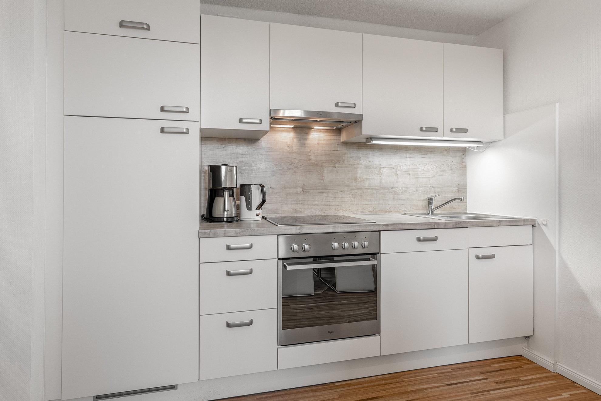 Moderne, komplett ausgestattete Wohnküche mit einem Essplatz für 4 Personen. Die Küche ist mit einem 4-Platten Cerankochfeld, einem Backofen, einer Spülmaschine, einem Kühlschrank mit kleinem 3-Sterne Gefrierfach, einem Toaster, einem Wasserkocher und einer Kaffeemaschine ausgestattet.