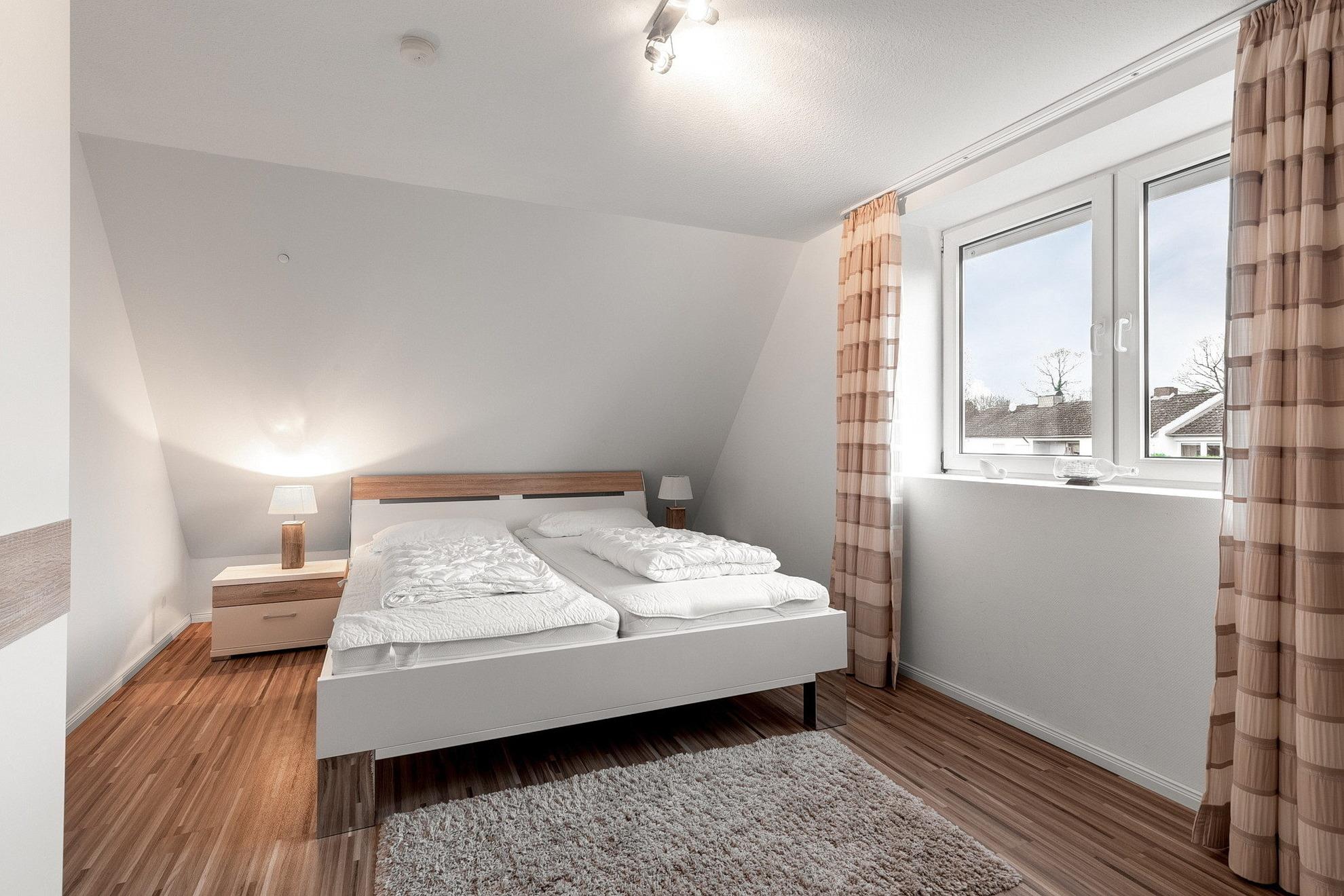 Separates, modern ausgestattetes Schlafzimmer in nördliche Richtung. Das Schlafzimmer ist mit einem Doppelbett (2x 90x200cm mit verstellbaren Lattenrosten), 2 Nachttischen, einem Smart-TV Fernseher (Empfang über Internet) und einem 3-türigen Kleiderschrank ausgestattet. Das Schlafzimmer ist mit Designerplanken ausgelegt. Das Fenster lässt sich durch einen Vorhang und einen elektrischen Außenrolladen blickdicht verdunkeln.