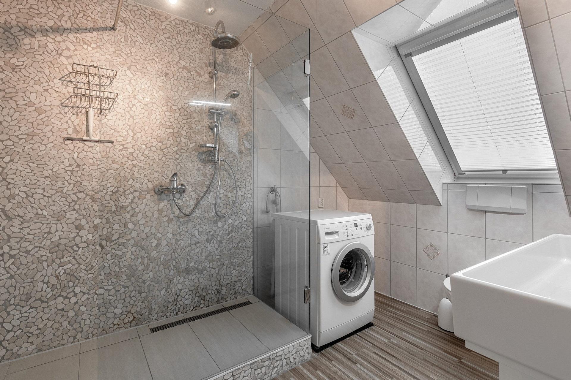Modernes, hell gefliestes Tageslichtbad mit Dusche, WC und Waschbecken. Eine Waschmaschine steht zur kostenlosen Nutzung bereit. Separate, zusätzliche Toilette mit Fenster.