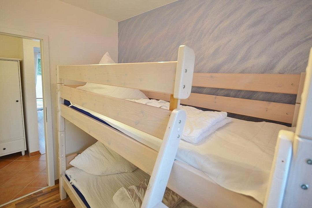 Kleines, separates Kinderzimmer mit Etagenbett (90x200cm). Das Kinderzimmer ist mit Laminatboden ausgelegt. Ein Kleiderschrank befindet sich im Flur. Das Fenster lässt sich durch ein Innenrollo verdunkeln.