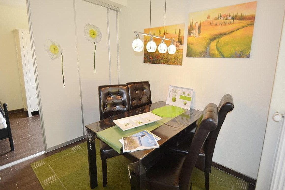 Modernes, großzügiges Wohn- und Esszimmer mit direktem Zugang zur Terrasse. Das geflieste Wohn- und Esszimmer ist mit einem Essplatz für 4 Personen, 2 Leder-Couchen, einem Couchtisch und einer Kommode ausgestattet. Zur Unterhaltung stehen ein Flachbildschirm und eine Mini-Stereoanlage zur Verfügung. Der moderne, geflieste Schlafbereich mit einem Boxspringbett (160x200cm) und einem Kleiderschrank ausgestattet, ist durch eine Vorhangsystem vom Wohnbereich getrennt. Das Fenster lässt sich durch ein Innenrollo etwas verdunkeln.