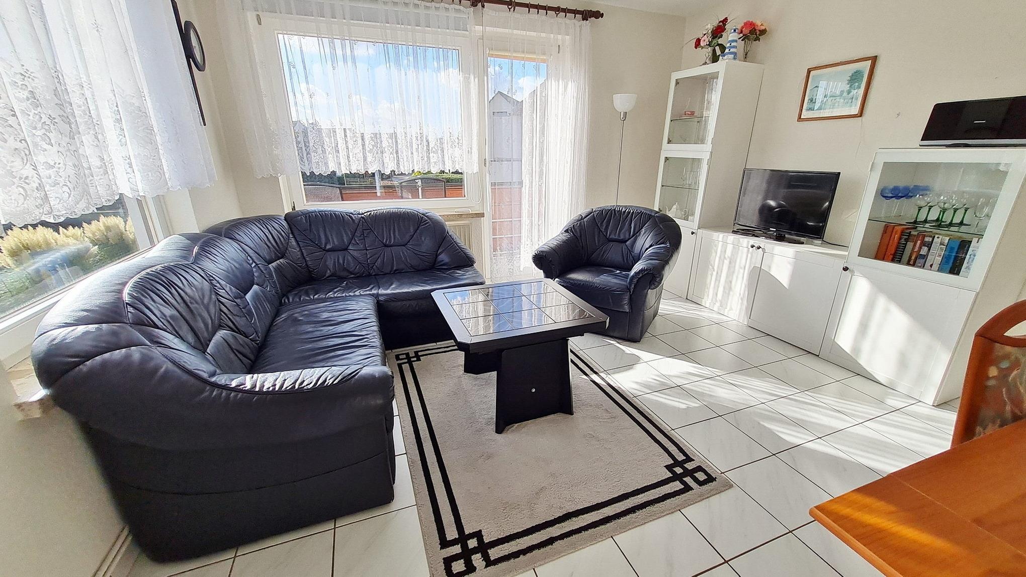 Gefliestes Wohn- und Esszimmer mit direktem Zugang zum Balkon. Das Wohn- und Esszimmer ist mit einem Essplatz für max. 3 Personen, einer Ledercouch (Schlafcouch 120x165cm), einem Sessel, einem Couchtisch und einem Wohnzimmerschrank ausgestattet. Zur Unterhaltung stehen ein Fernseher und ein Kofferradio zur Verfügung.