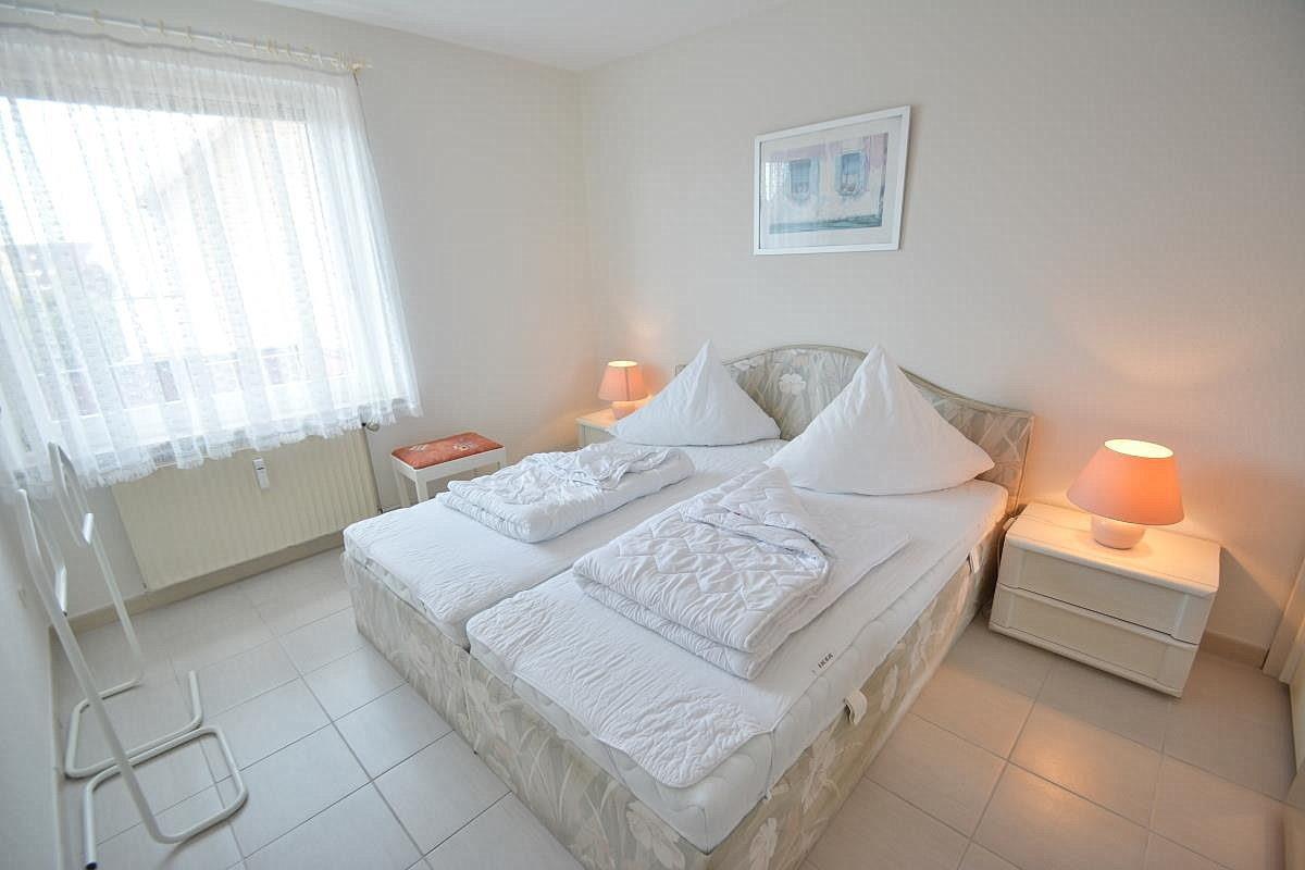 Das geflieste Schlafzimmer ist mit einem Doppelbett (2x 90x200cm) und einem Kleiderschrank ausgestattet. Das Fenster lässt sich durch ein Innenrollo blickdicht verdunkeln.