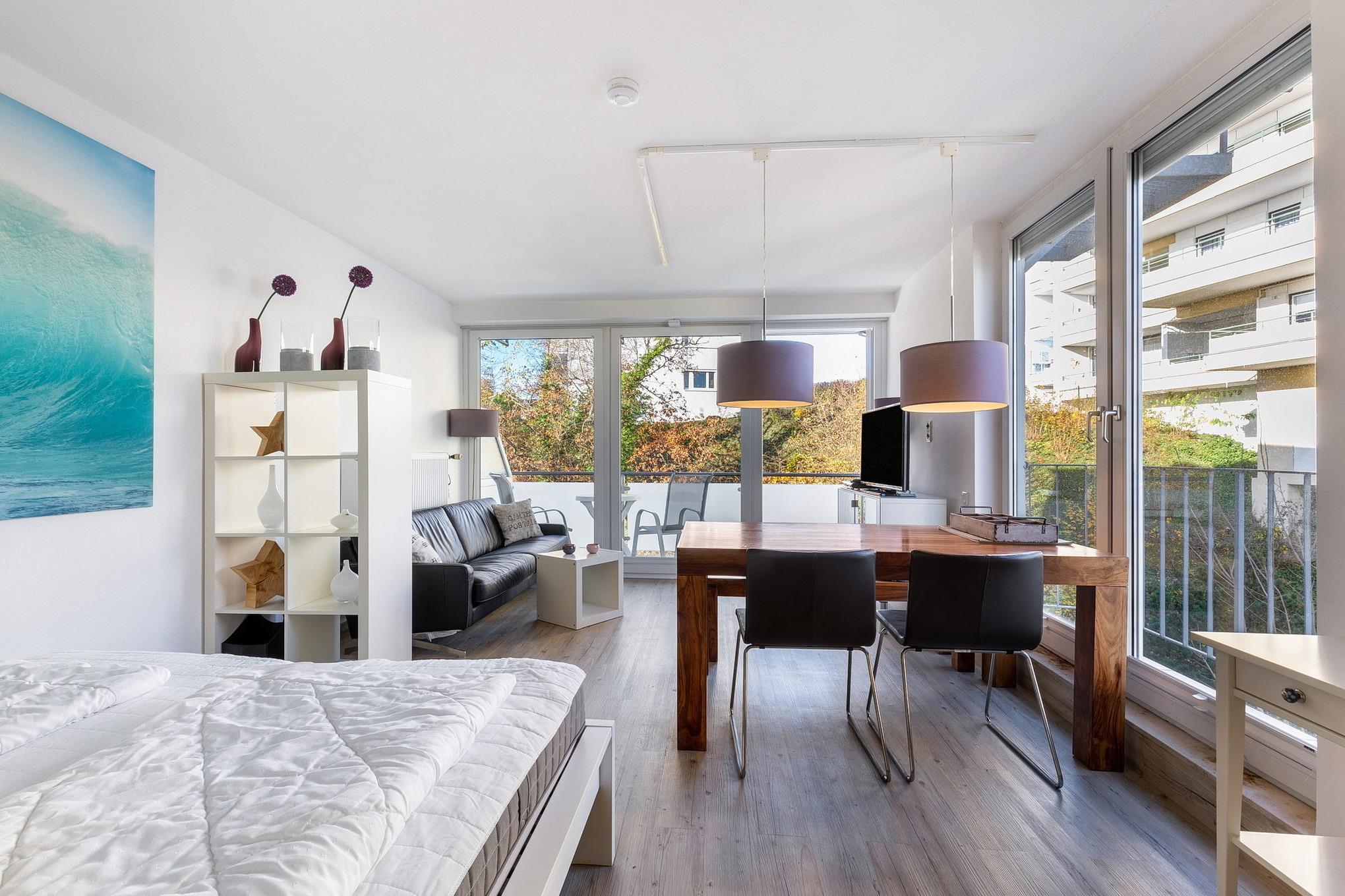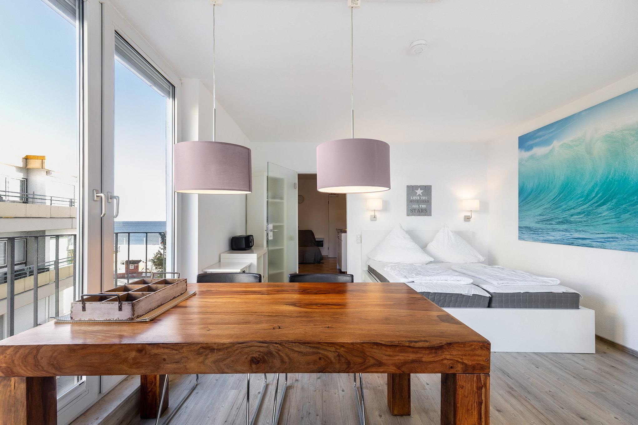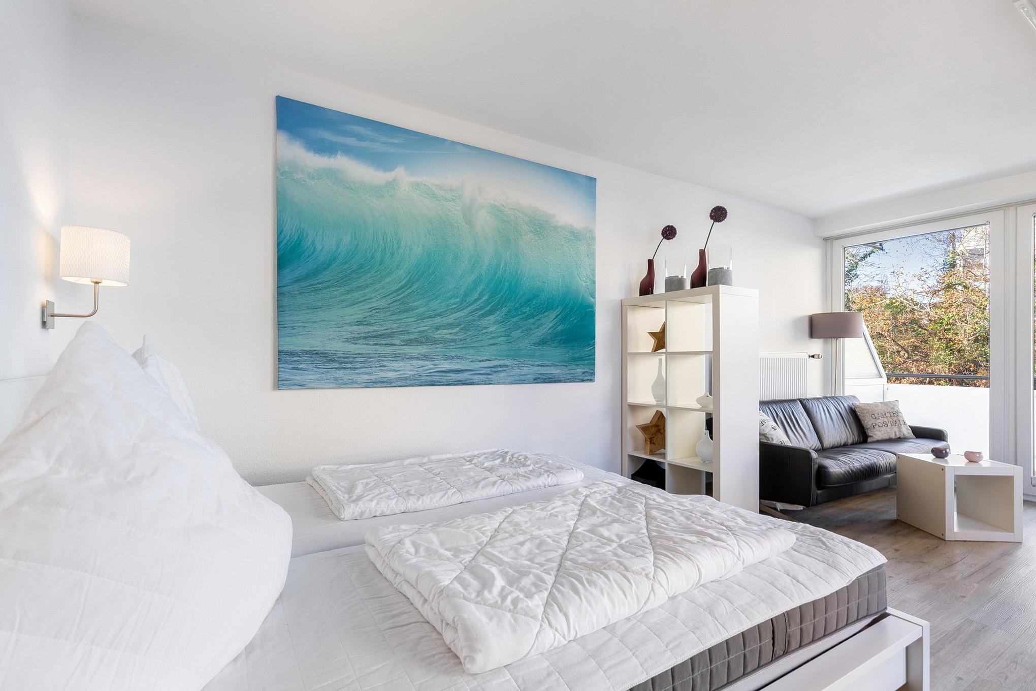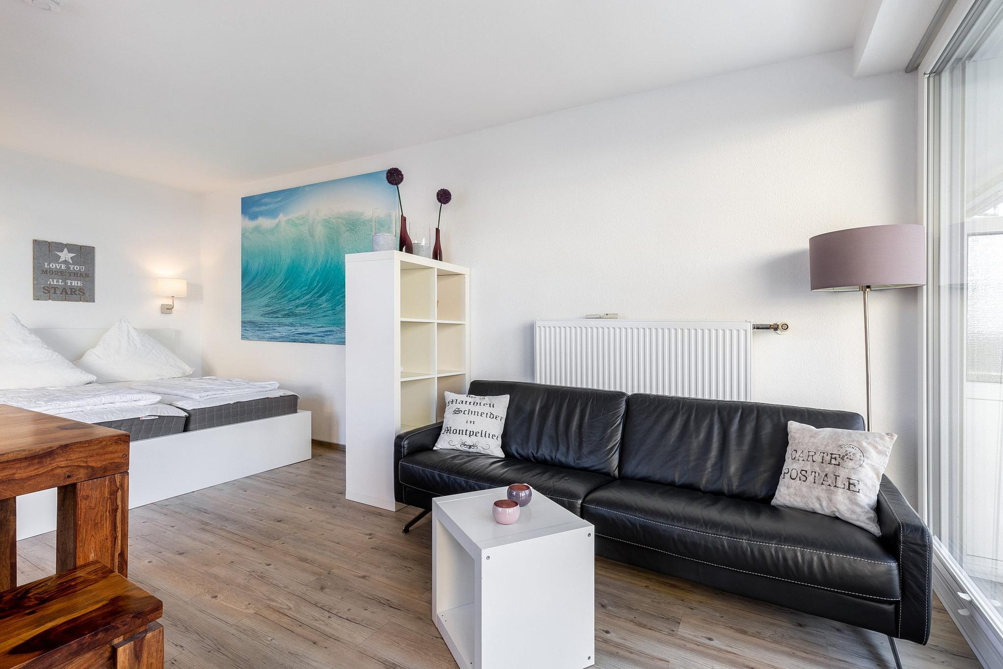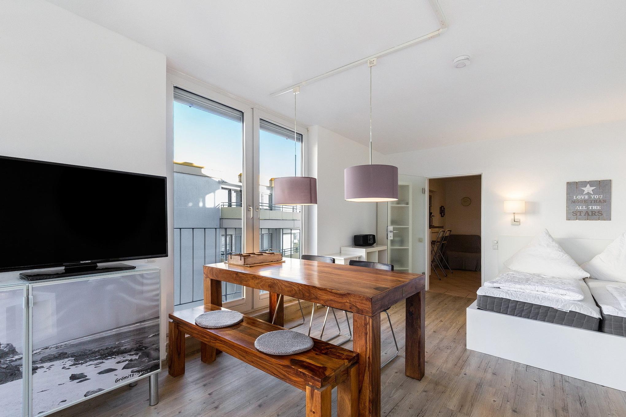 Modern eingerichtetes Wohn- und Schlafzimmer mit direktem Zugang zum Balkon. Das Wohn- und Schlafzimmer ist mit einem Essplatz für 4 Personen, einer Couch, einem Couchtisch, einem Regal und einem Doppelbett (2x 80x200cm) ausgestattet. Ein Schlafsessel (90x205cm), sowie ein Kleiderschrank befinden sich im Vorraum der Wohnung. Zur Unterhaltung stehen ein Flachbildfernseher, ein DVD-Player und ein Radiorecorder mit CD-Player zur Verfügung. Das Wohn- und Schlafzimmer ist mit Designer-Planken ausgelegt. Die Fenster lassen sich durch Vorhänge und einen Außenrolladen vollständig verdunkeln.