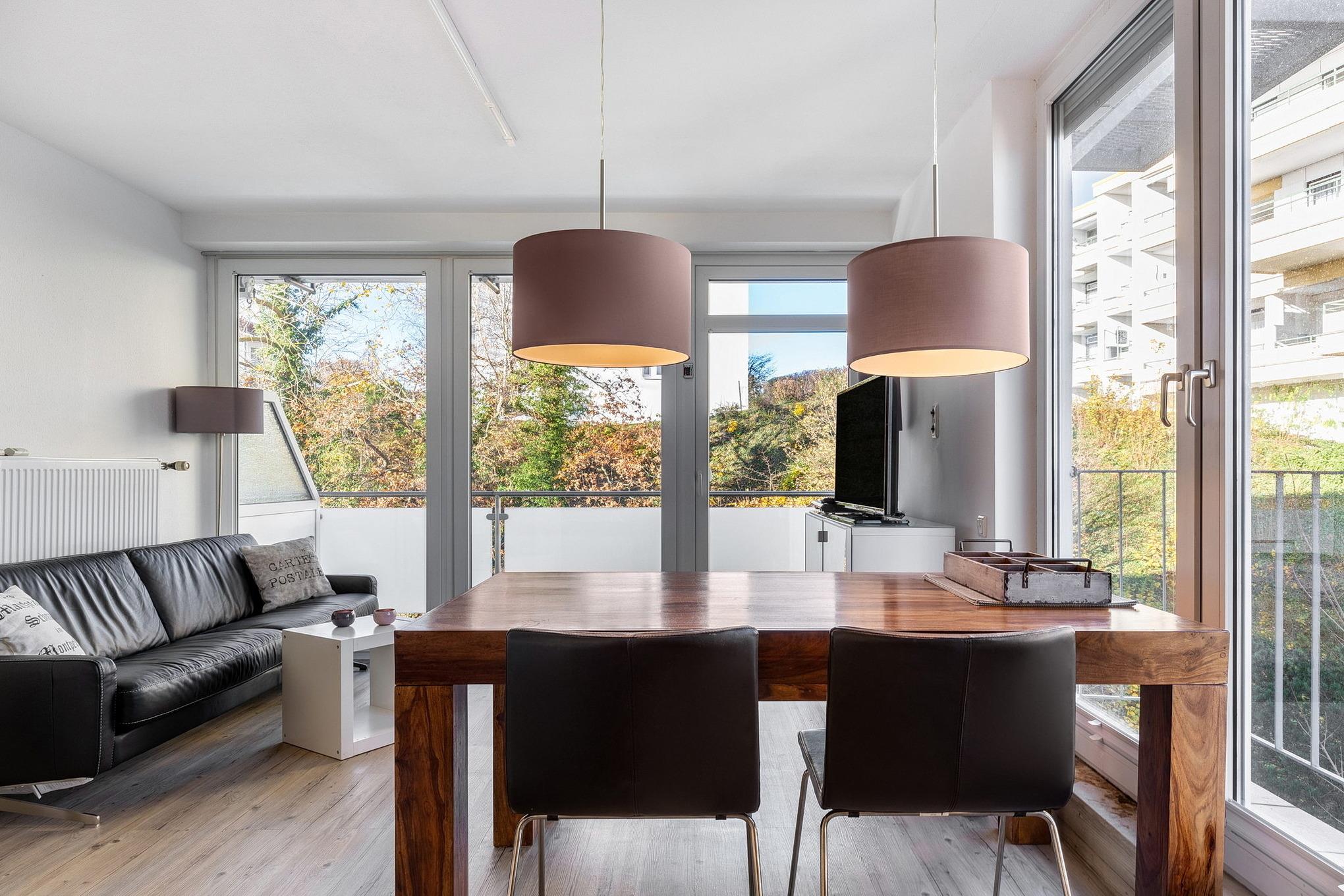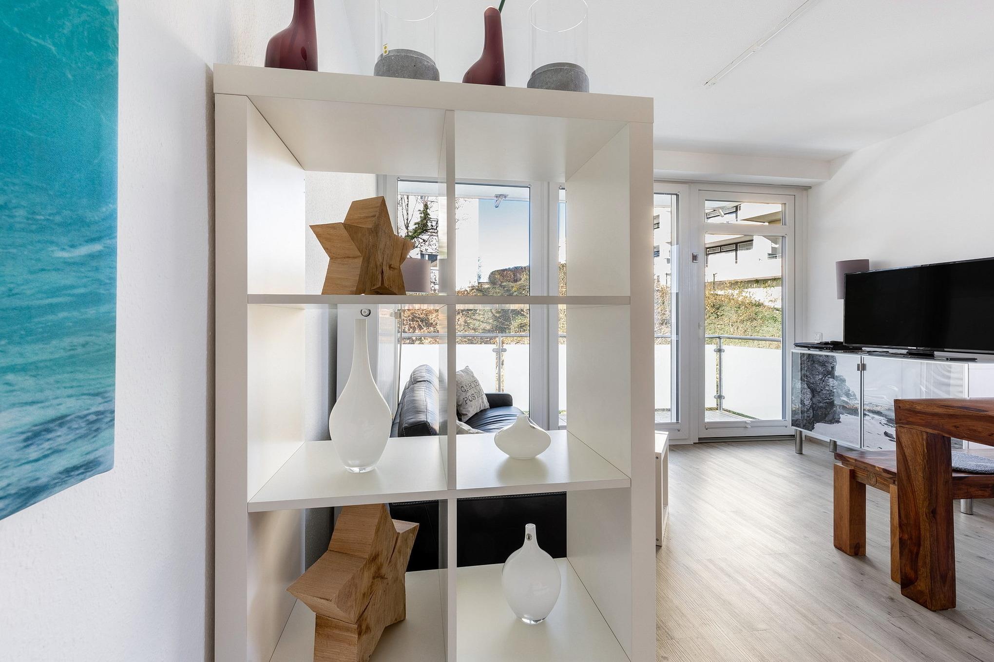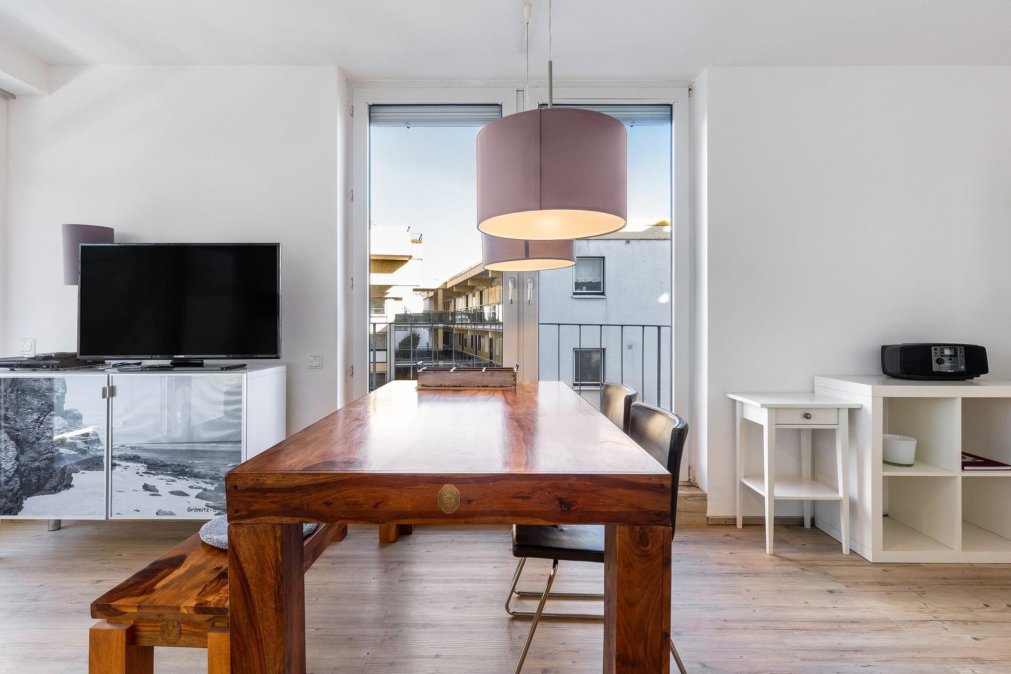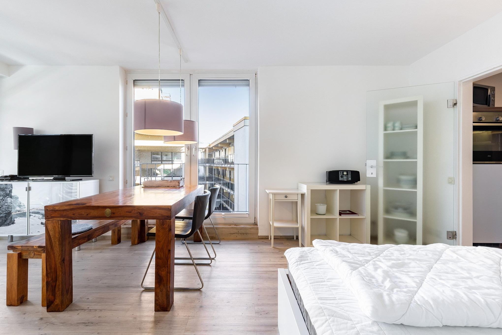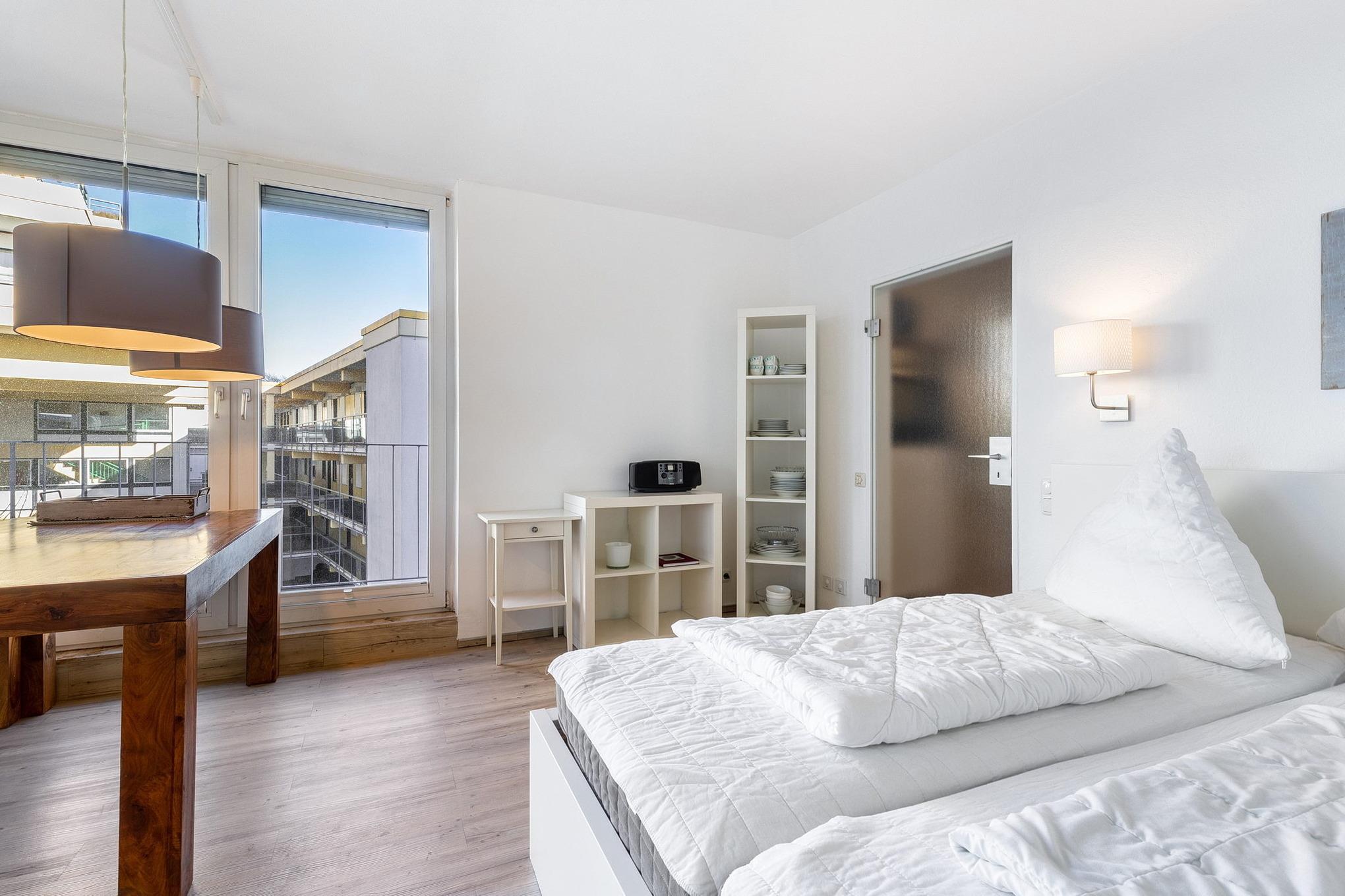 Modern eingerichtetes Wohn- und Schlafzimmer mit direktem Zugang zum Balkon. Das Wohn- und Schlafzimmer ist mit einem Essplatz für 4 Personen, einer Couch, einem Couchtisch, einem Regal und einem Doppelbett (2x 80x200cm) ausgestattet. Ein Schlafsessel (90x205cm), sowie ein Kleiderschrank befinden sich im Vorraum der Wohnung. Zur Unterhaltung stehen ein Flachbildfernseher, ein DVD-Player und ein Radiorecorder mit CD-Player zur Verfügung. Das Wohn- und Schlafzimmer ist mit Designer-Planken ausgelegt. Die Fenster lassen sich durch Vorhänge und einen Außenrolladen vollständig verdunkeln.