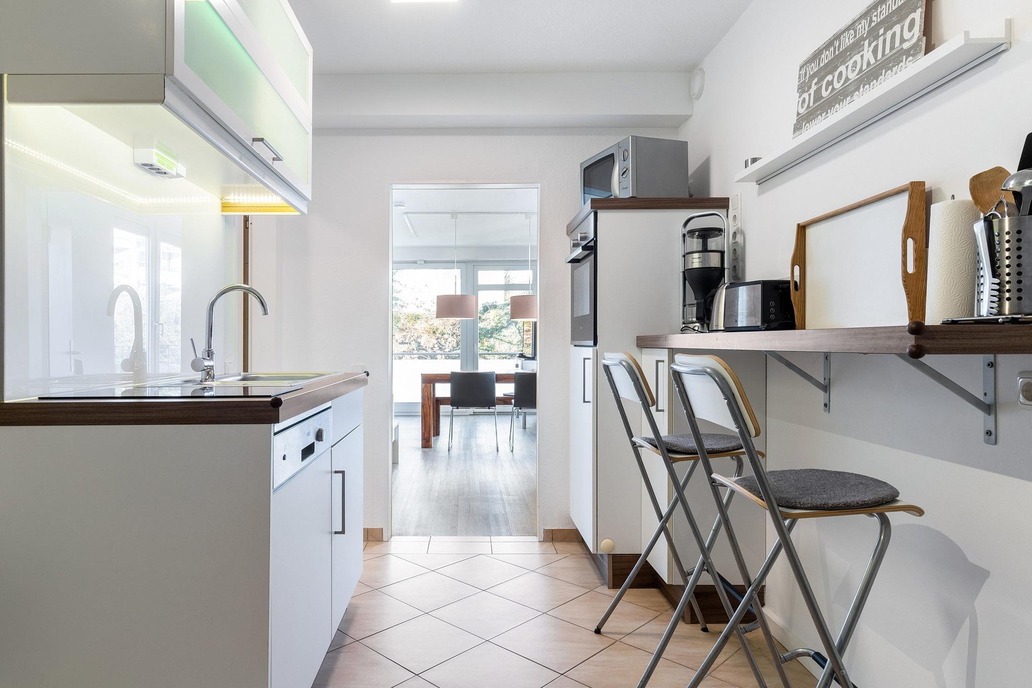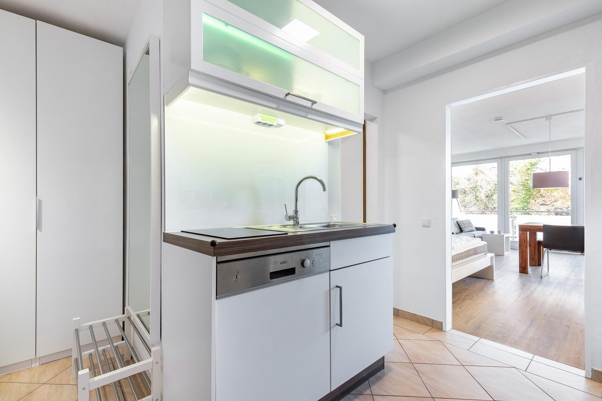 Moderne, komplett eingerichtete Pantryküche mit 2-Platten Cerankochfeld, Backofen, Spülmaschine, Kühlschrank mit kleinem 3-Sterne Gefrierfach, Mikrowelle, Toaster, Kaffeemaschine und Wasserkocher.