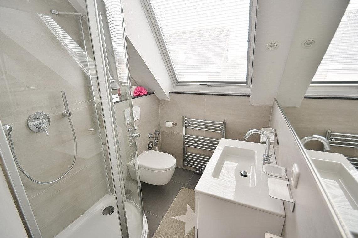 Helles, freundliches Tageslichtbad mit Dusche, WC und Waschbecken.