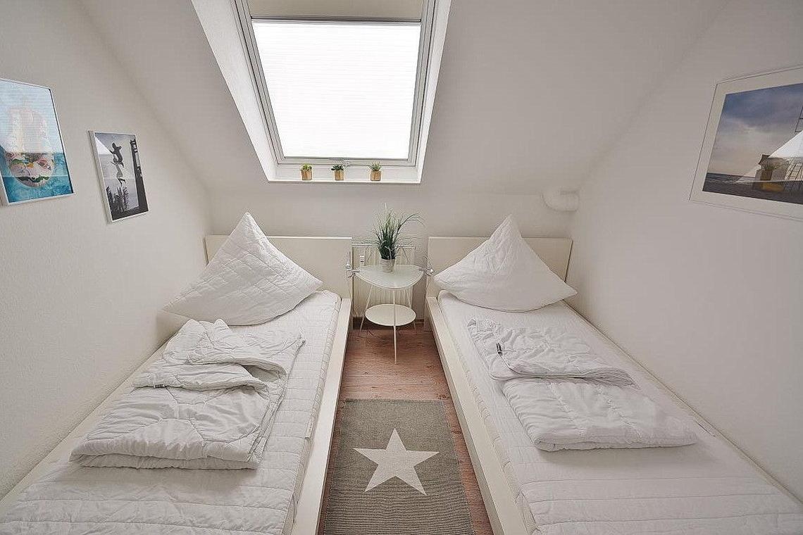 Separates, kleines Kinderzimmer im 1. OG mit 2 Einzelbetten (90x200cm) und einem Kleiderschrank ausgestattet. Das Zimmer ist mit Laminatboden ausgelegt, das Fenster lässt sich durch ein Innenrollo etwas verdunkeln.