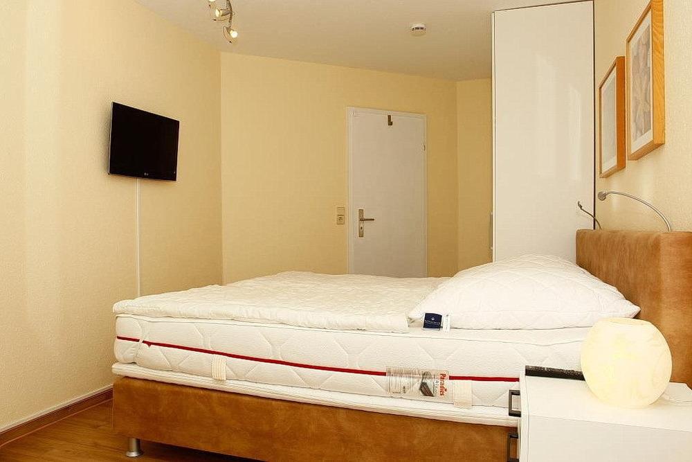 Das gemütliche Schlafzimmer ist mit einem Boxspringbett (180x200cm) und einem Kleiderschrank ausgestattet. Auch hier steht ein Flachbildschirm zur Verfügung. Der Raum ist mit Laminatboden ausgelegt. Die Fenster können durch einen Vorhang verdunkelt werden.