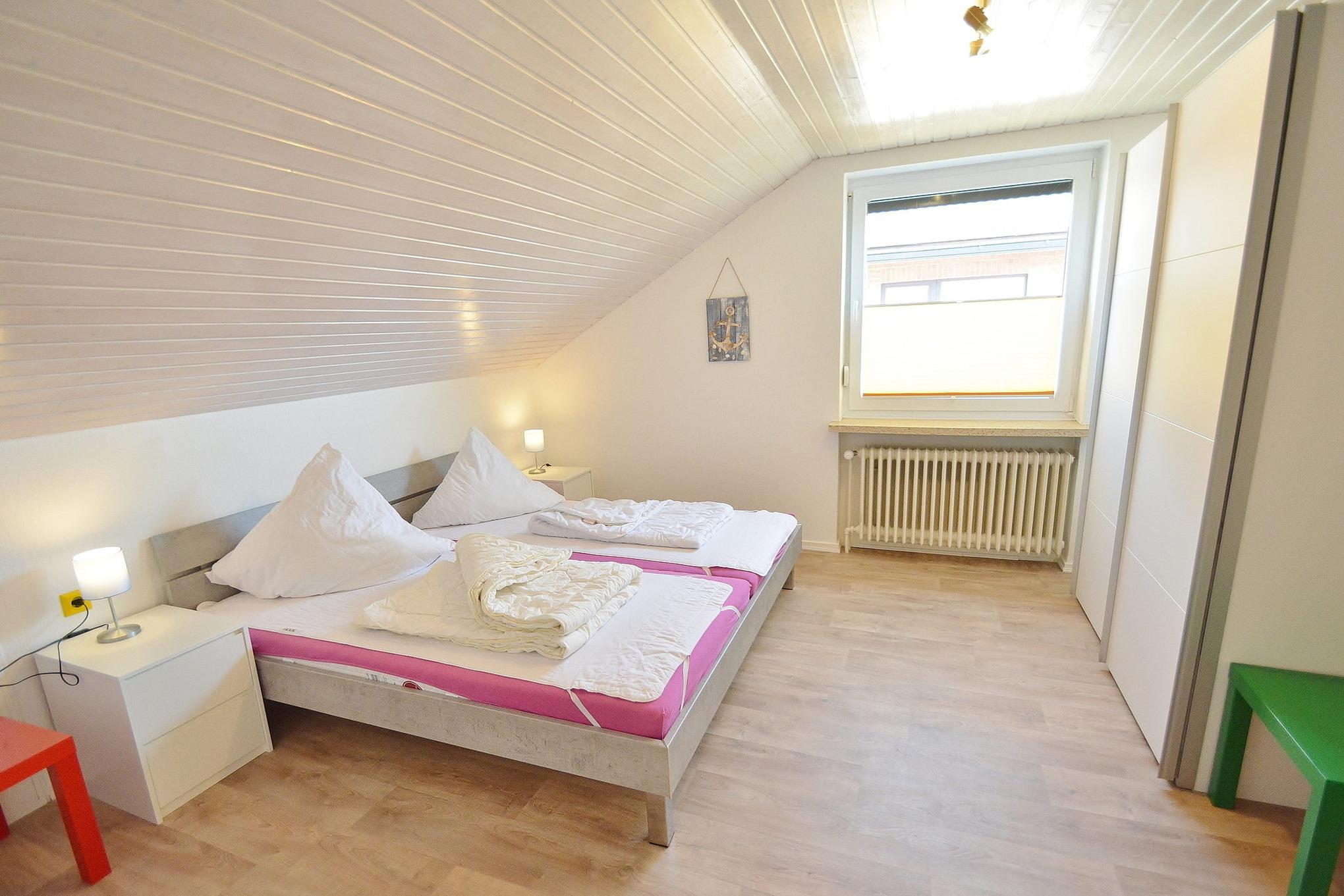 Großzügiges Schlafzimmer mit Doppelbett (2x 100x200cm) und einem Kleiderschrank. Das Schlafzimmer ist mit Vinylboden ausgelegt. Das Fenster lässt sich durch ein Außenrollo verdunkeln.