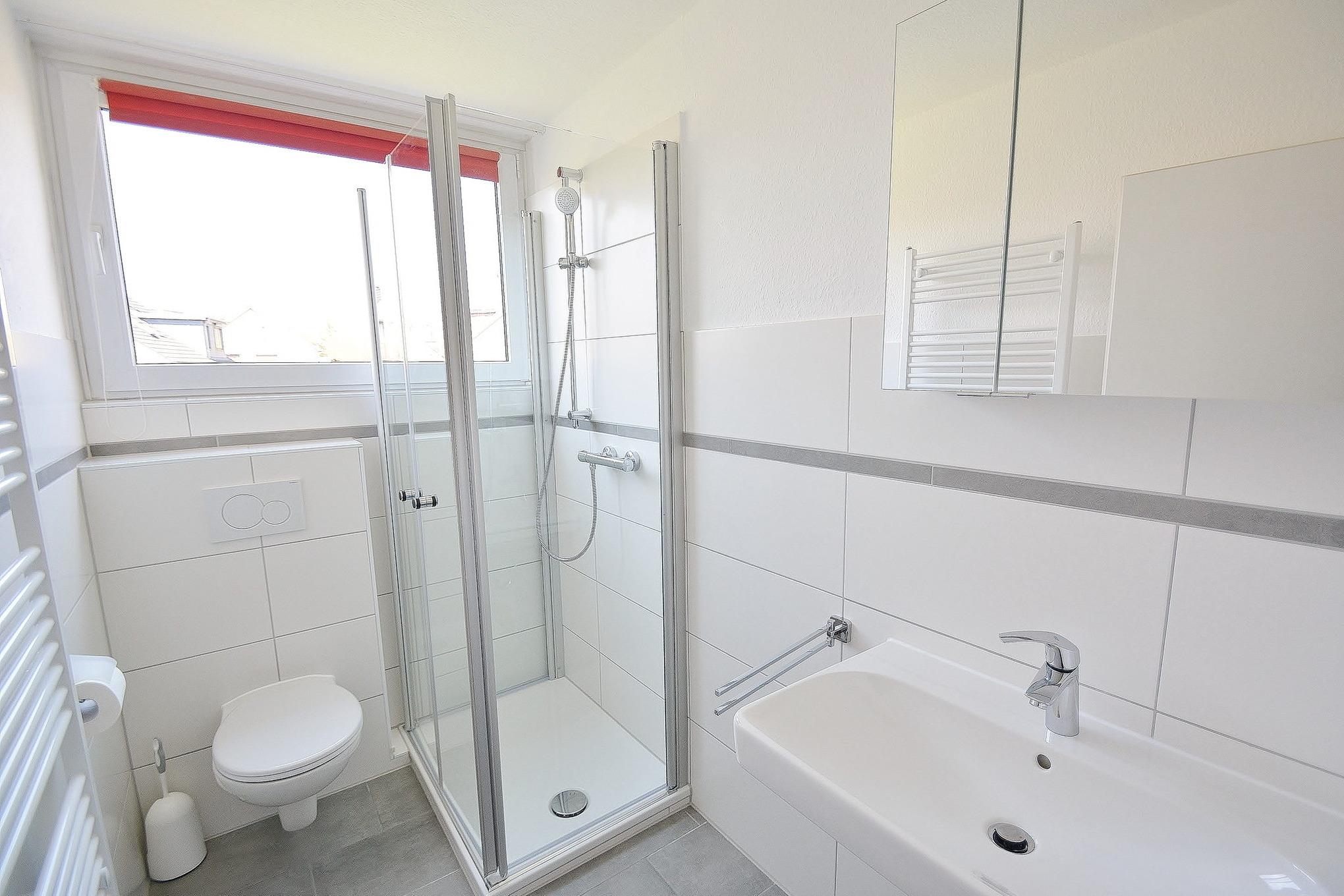 Modernes Tageslichtbad, mit Dusche, Waschbecken und Toilette.