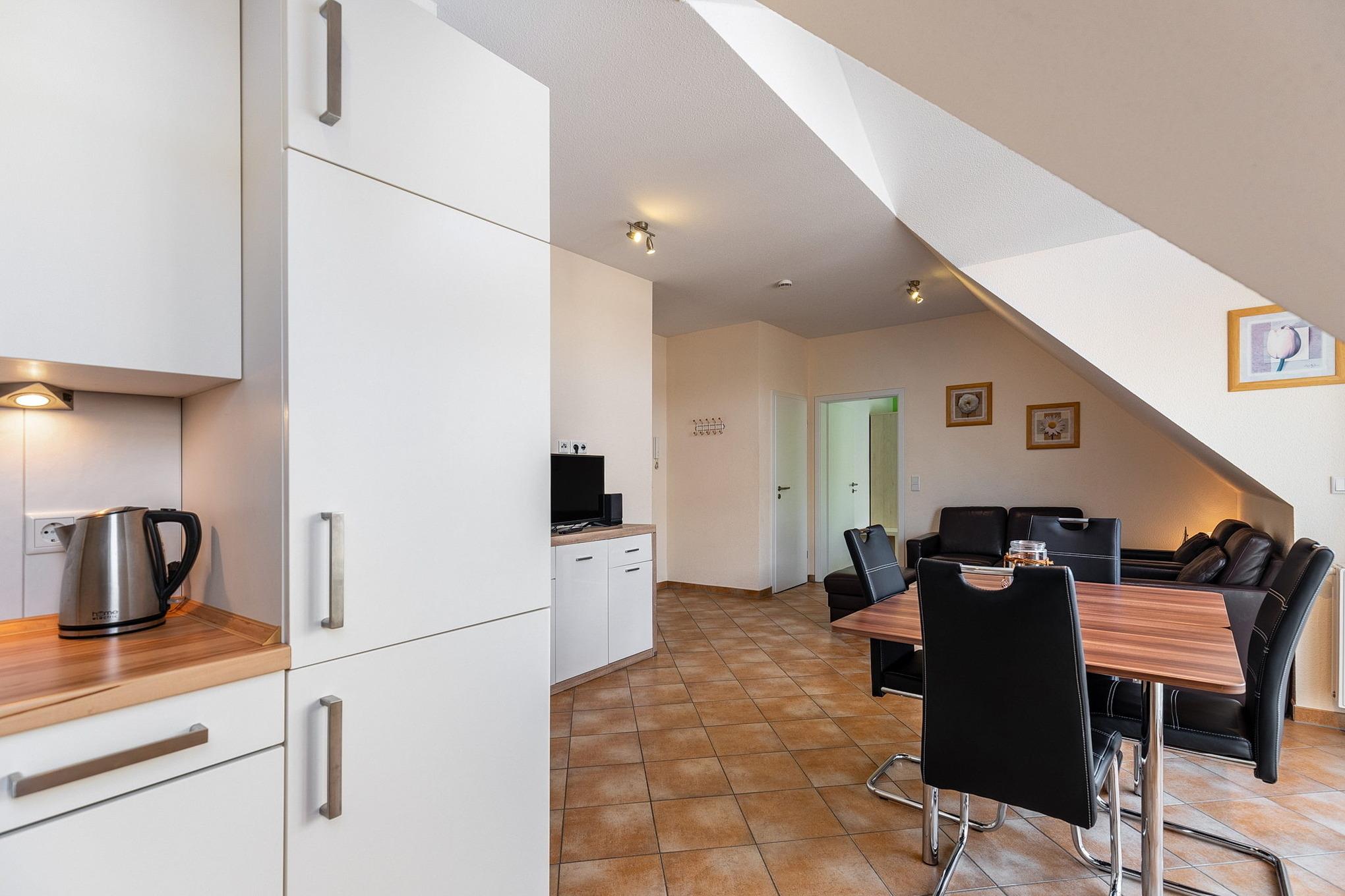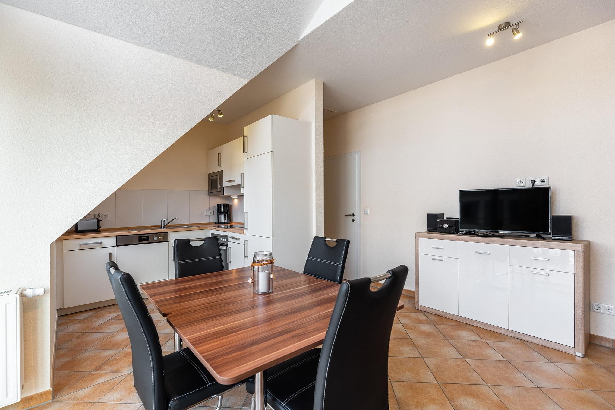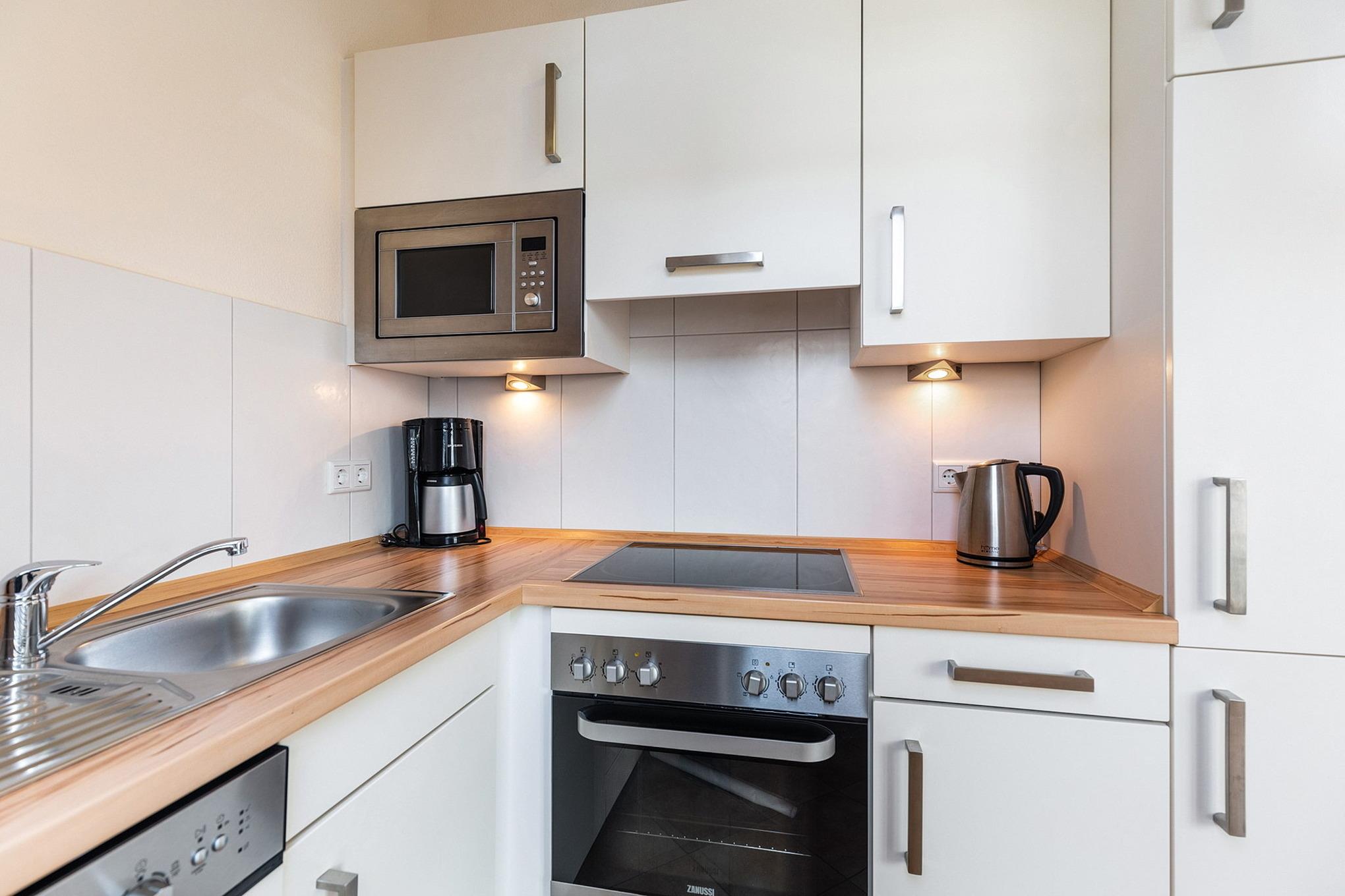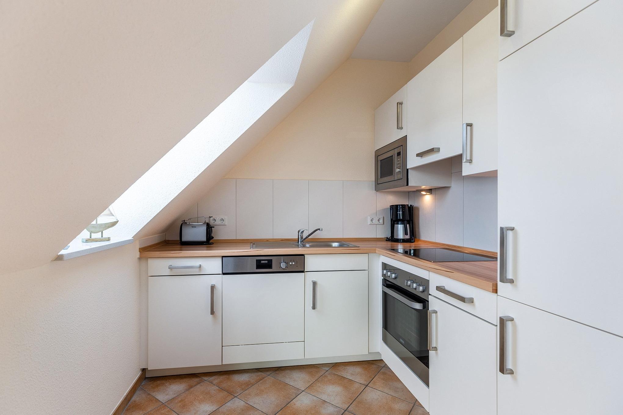 Moderne, komplett ausgestattete, zum Wohn- und Essbereich offene Küche. Die Küche verfügt über ein 4-Platten Cerankochfeld, einen Backofen, einer Spülmaschine, einen Kühlschrank mit 3-Sterne Gefrierfach, einer Mikrowelle, einen Toaster, einen Wasserkocher und einer Kaffeemaschine.