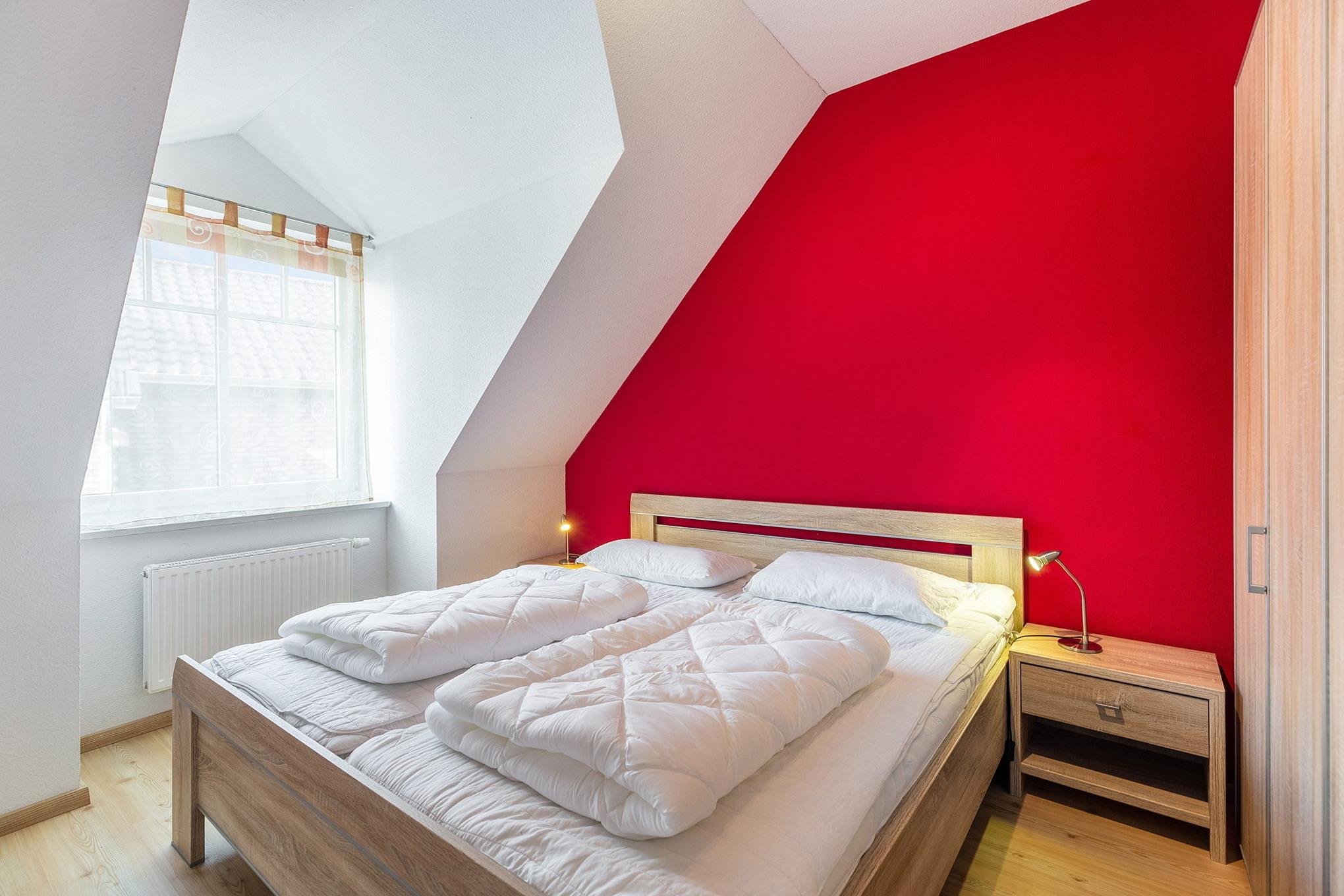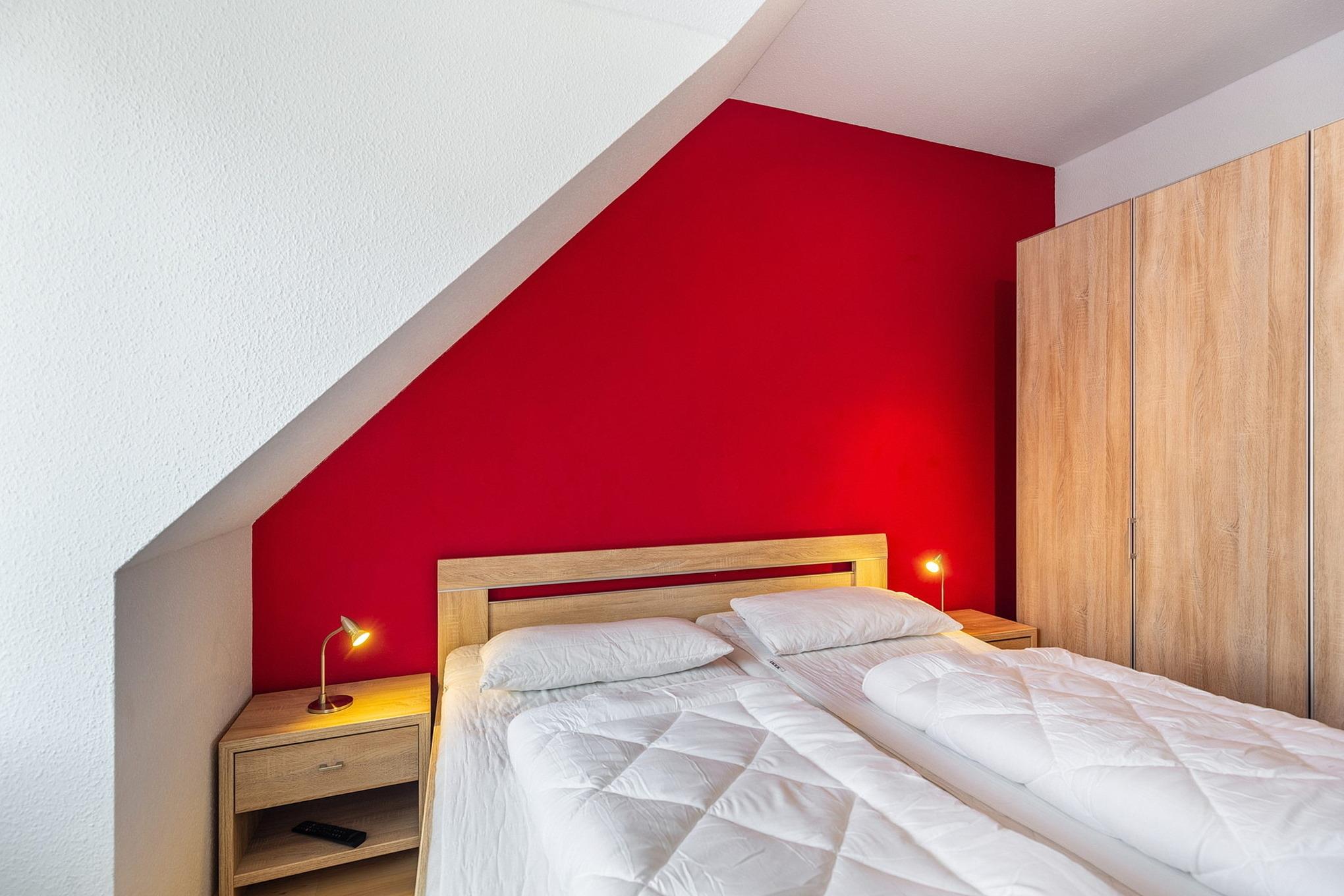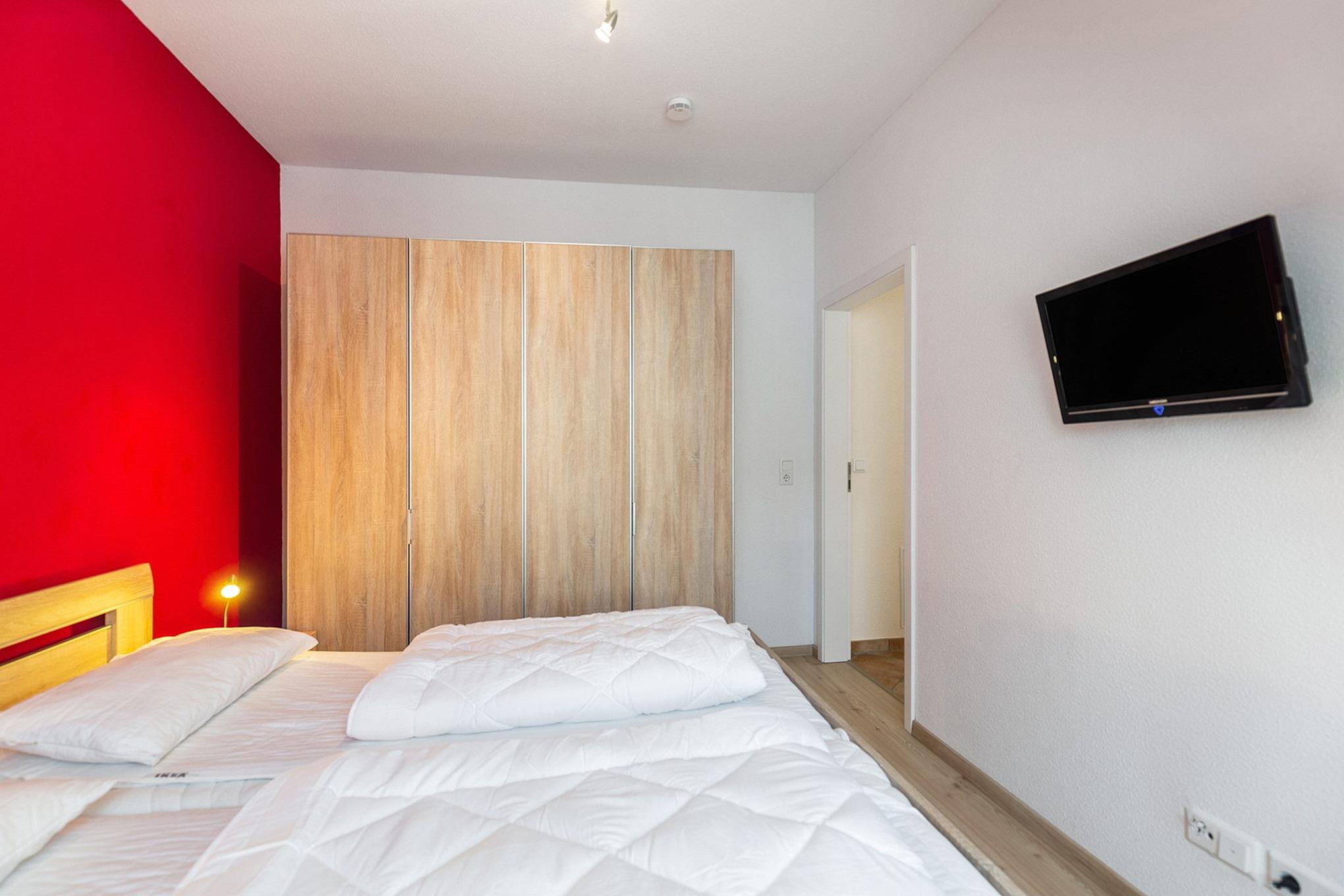 Das modern ausgestattete Schlafzimmer ist mit einem Doppelbett (2x 90x200cm), 2 Nachttischen und einem 4-türigen Kleiderschrank ausgestattet. Zur Unterhaltung steht ein Flachbildschirm zur Verfügung. Das Zimmer ist mit Designerplanken ausgelegt, das Fenster lässt sich durch ein Innenrollo verdunkeln.