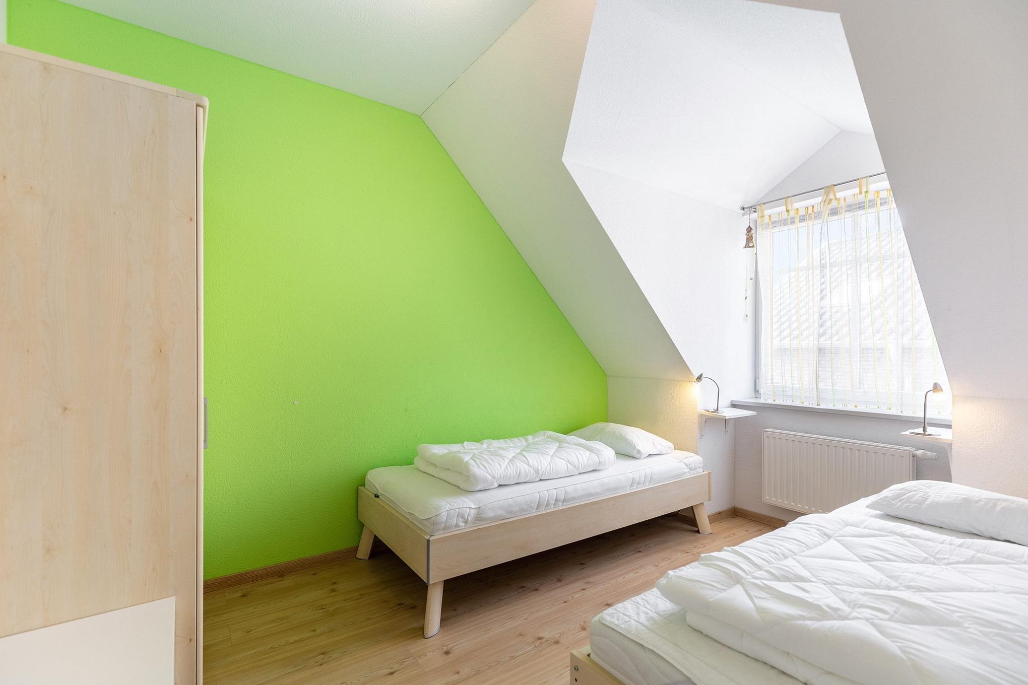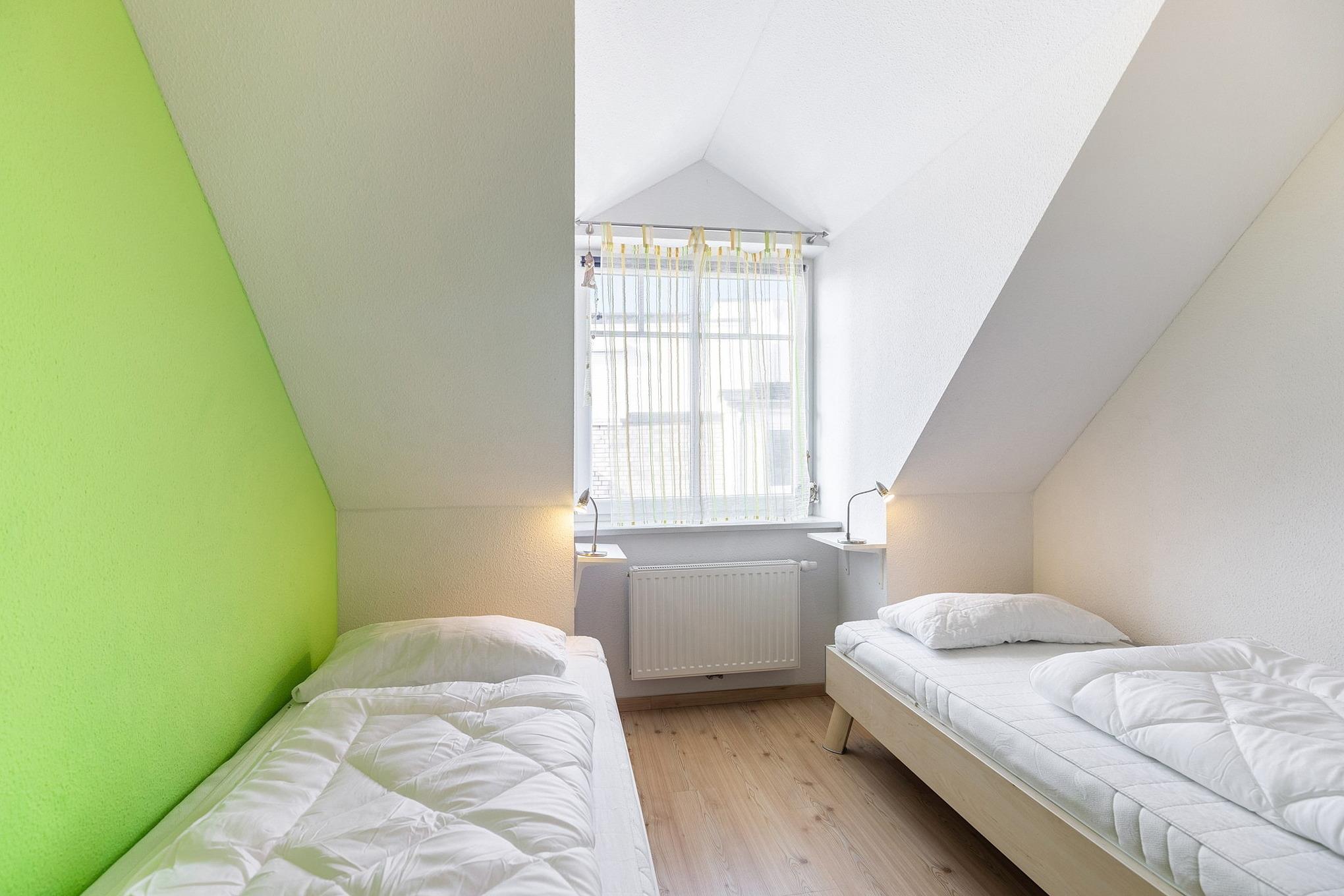 Das separate, modern ausgestattete Zimmer ist mit 2 Einzelbetten (90x200cm) und einem 2-türigen Kleiderschrank ausgestattet. Das Zimmer ist mit Designerplanken ausgelegt.