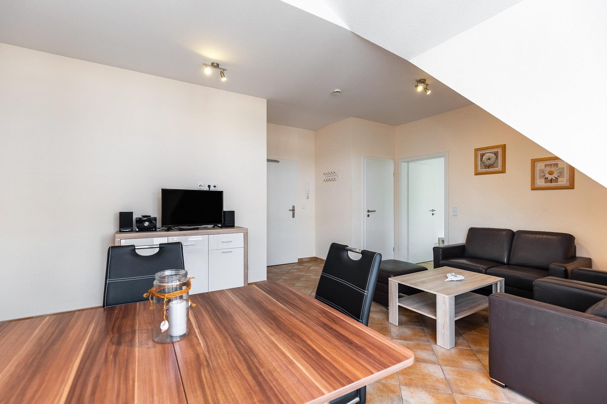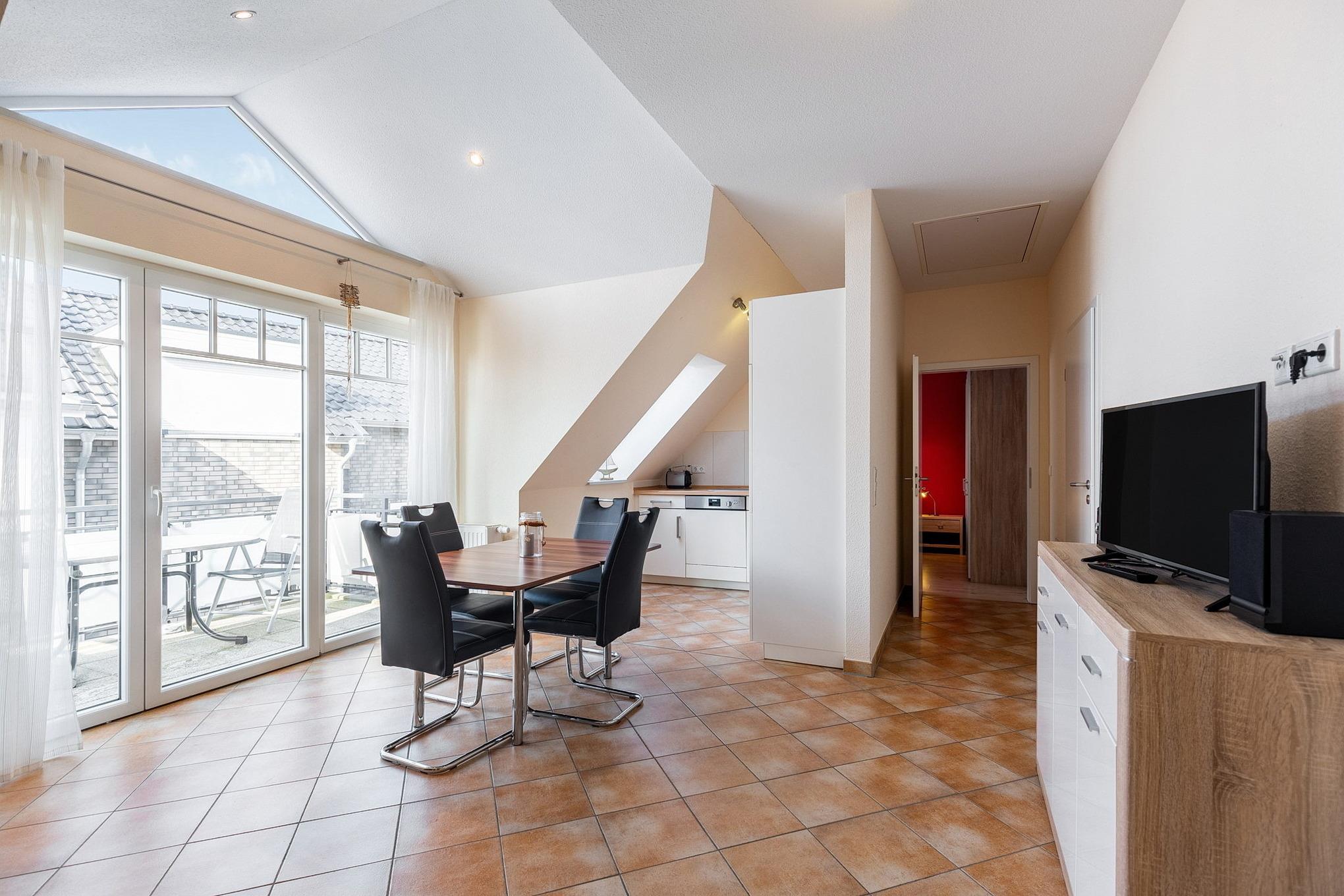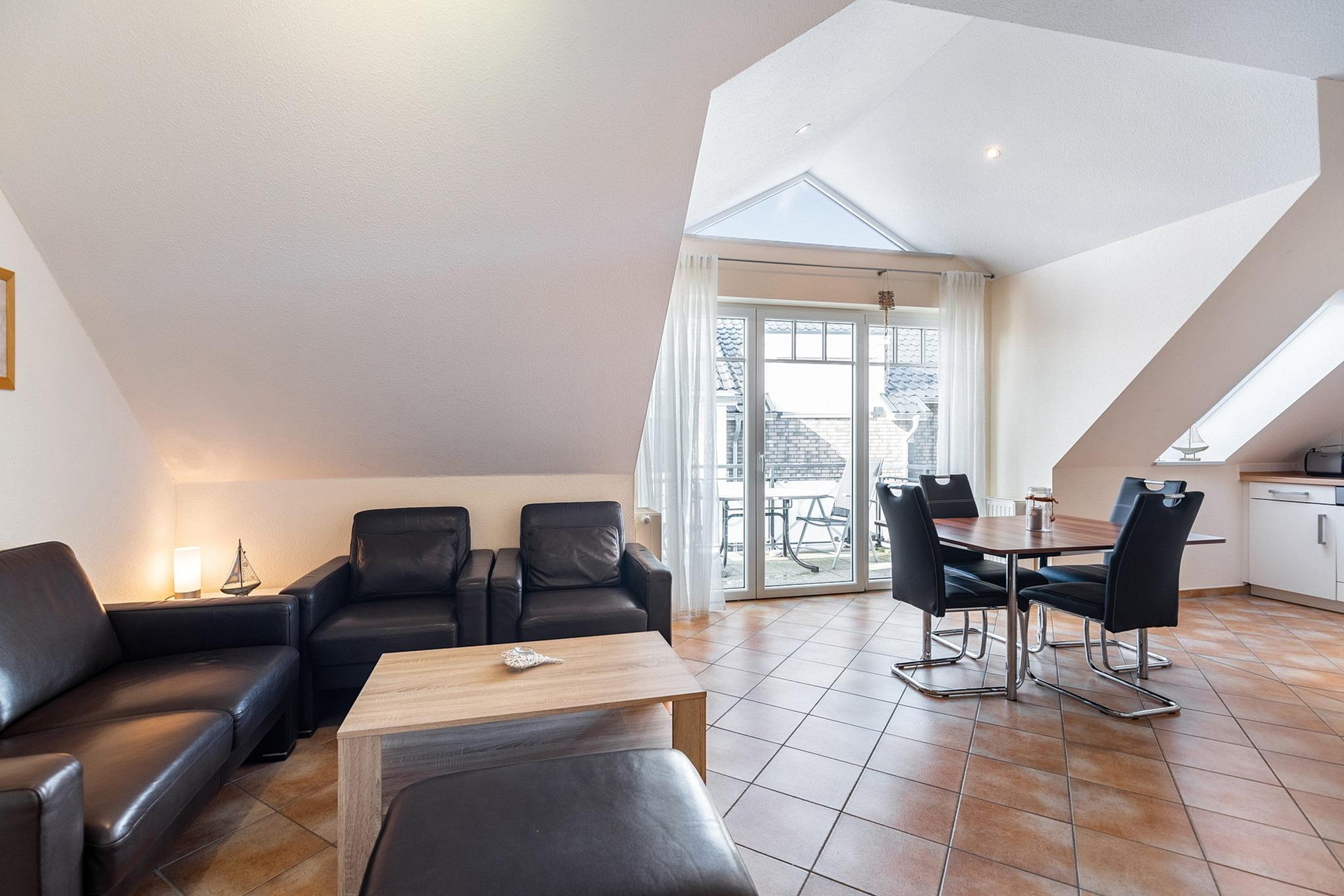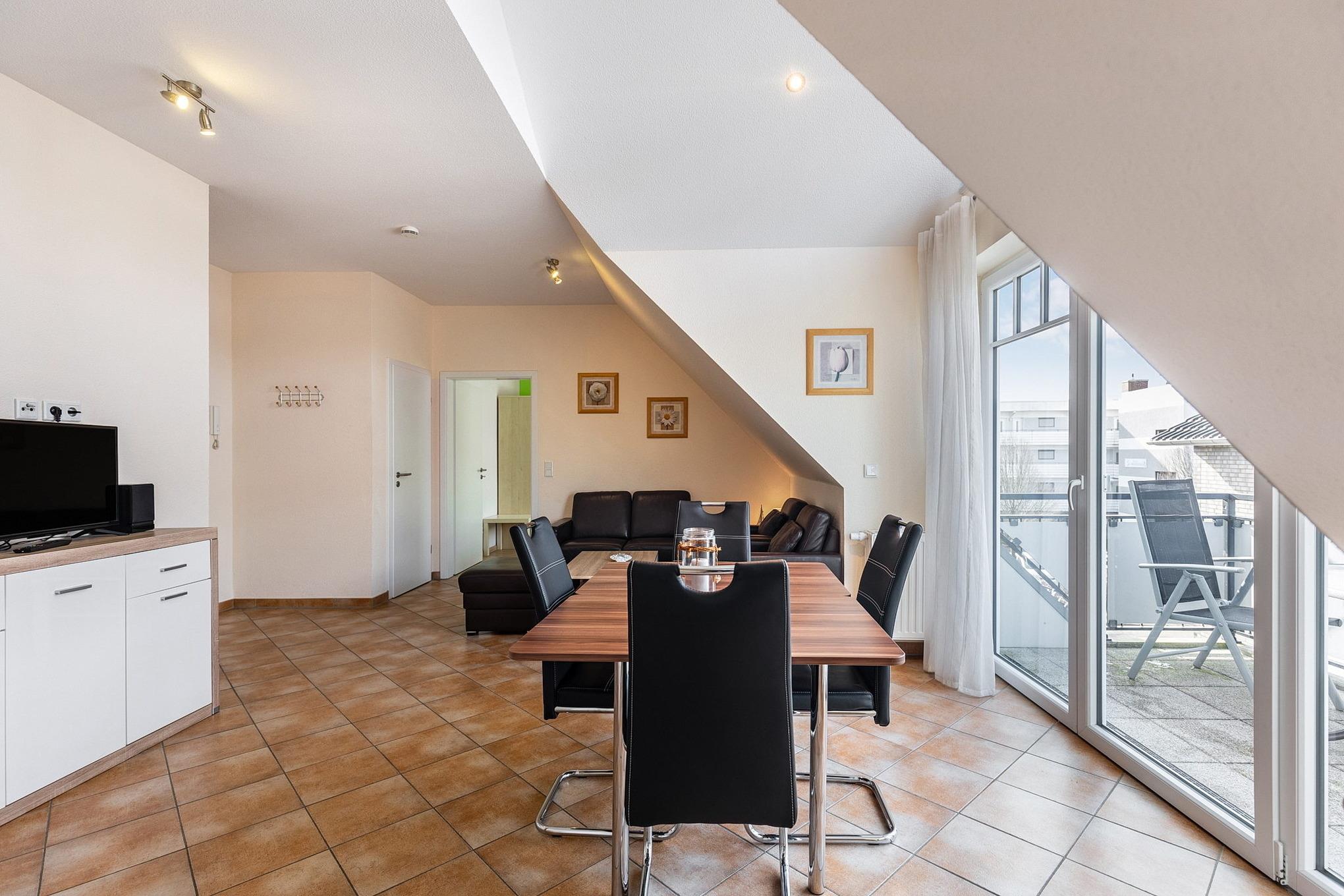 Modern eingerichtetes Wohn- und Esszimmer mit direktem Zugang zum Balkon. Das Wohn- und Esszimmer ist mit einem Essplatz für 4 Personen, einer Ledercouch und 2 Ledersessel, einem Couchtisch und einer Kommode ausgestattet. Zur Unterhaltung stehen ein Flachbildschirm und eine Mini-Stereoanlage zur Verfügung. Das Wohn- und Esszimmer ist gefliest.