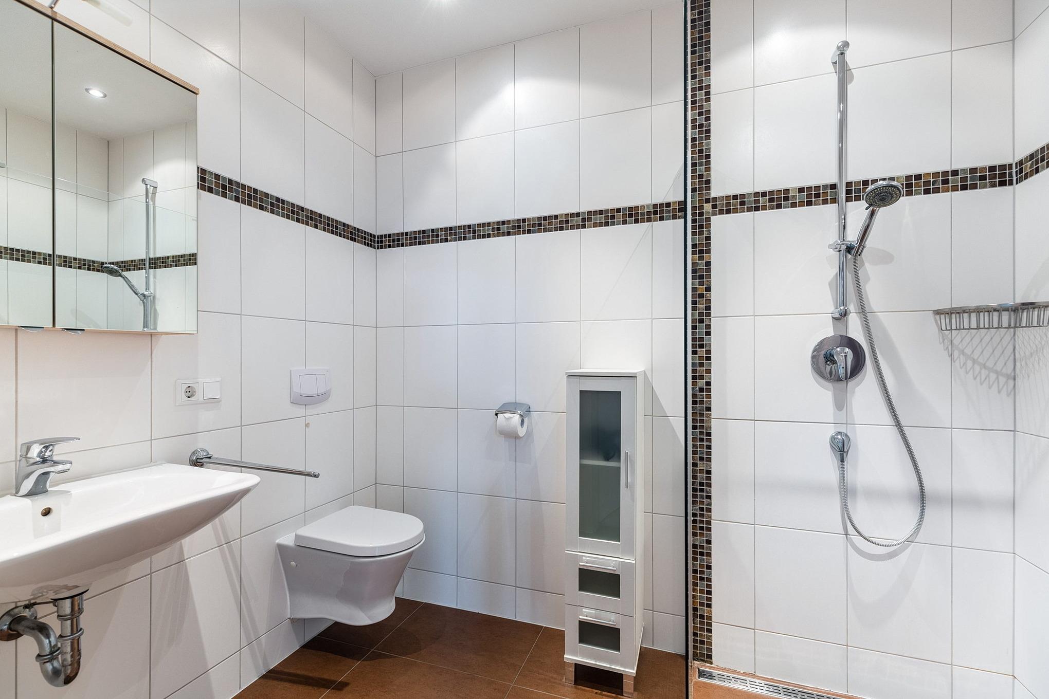 Modernes, hell gefliestes Bad mit ebenerdiger Dusche, WC und Waschbecken.