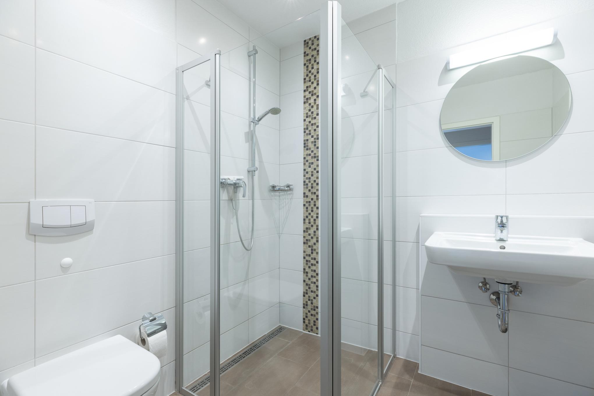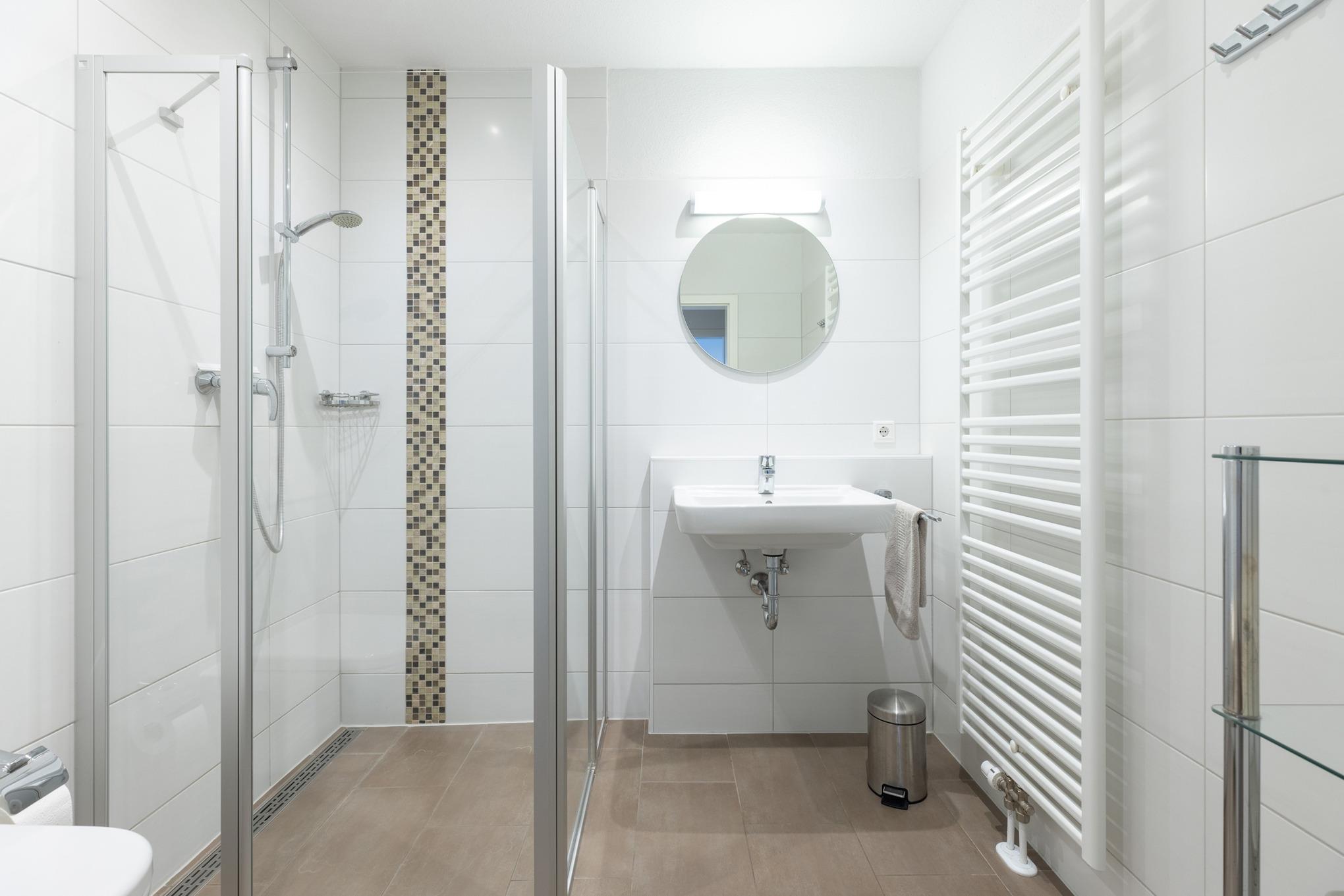 Hell gefliestes Bad mit ebenerdiger Dusche, WC und Waschbecken. Die Fußbodenheizung und die Handtuchheizung sorgen für angenehme Wärme.