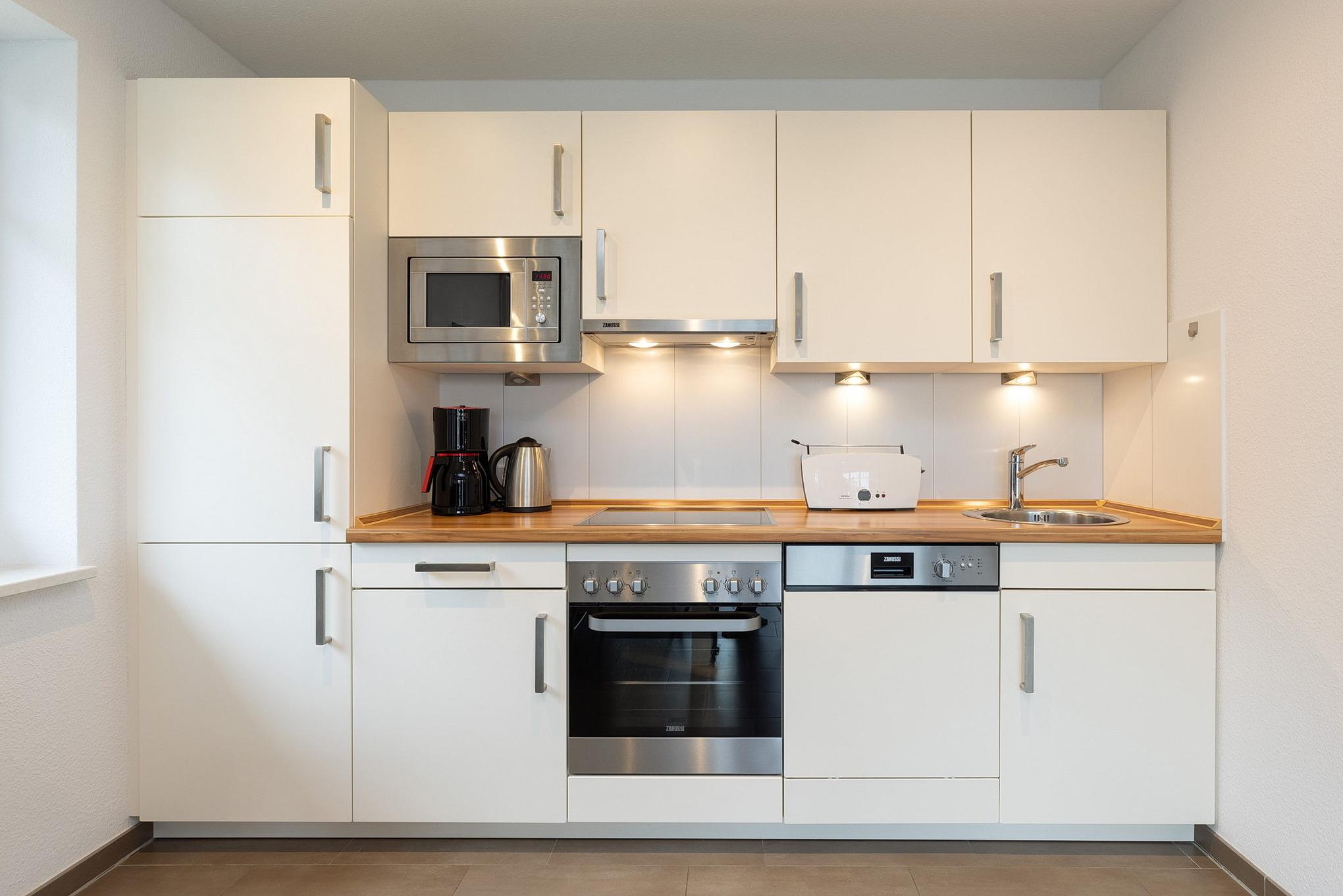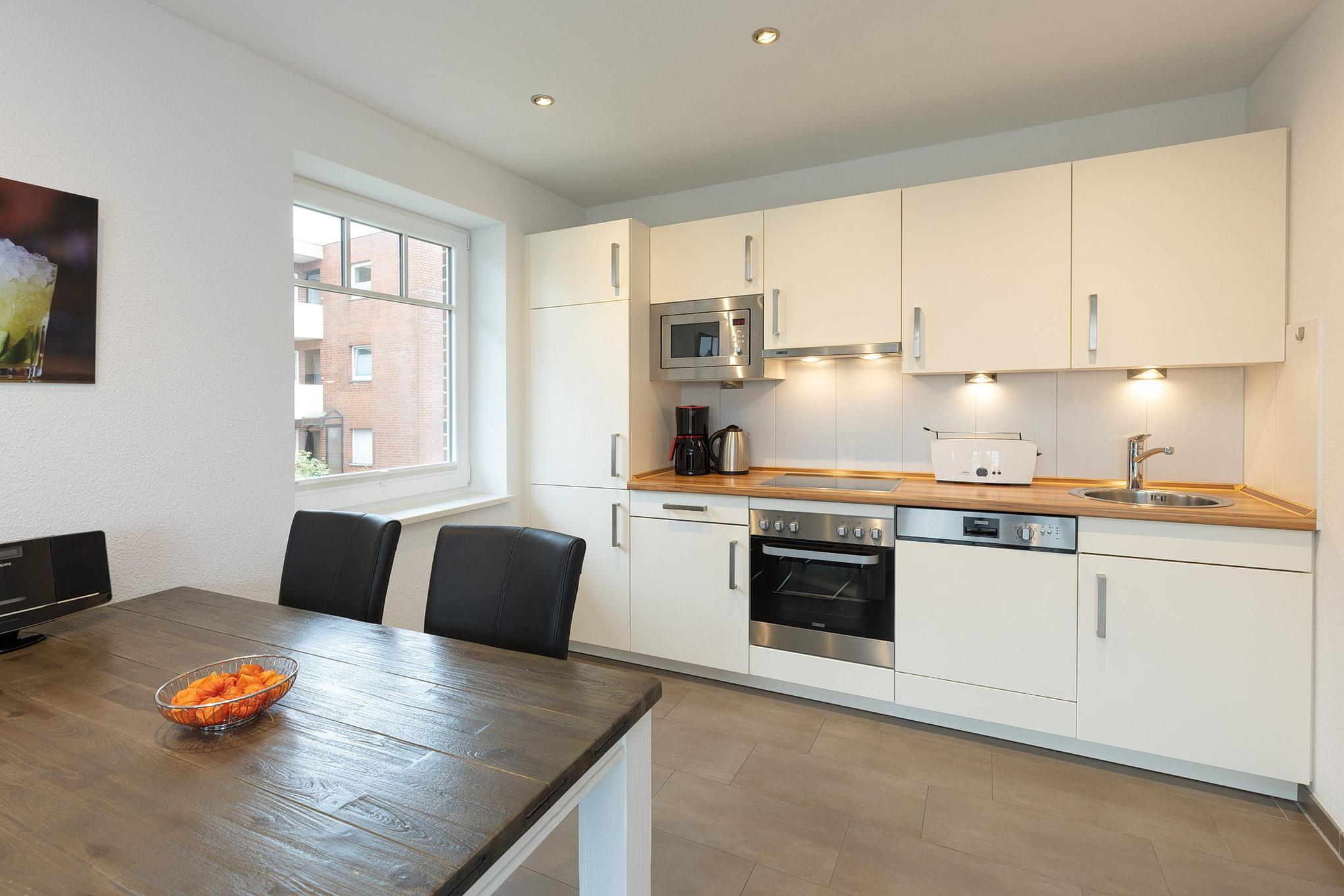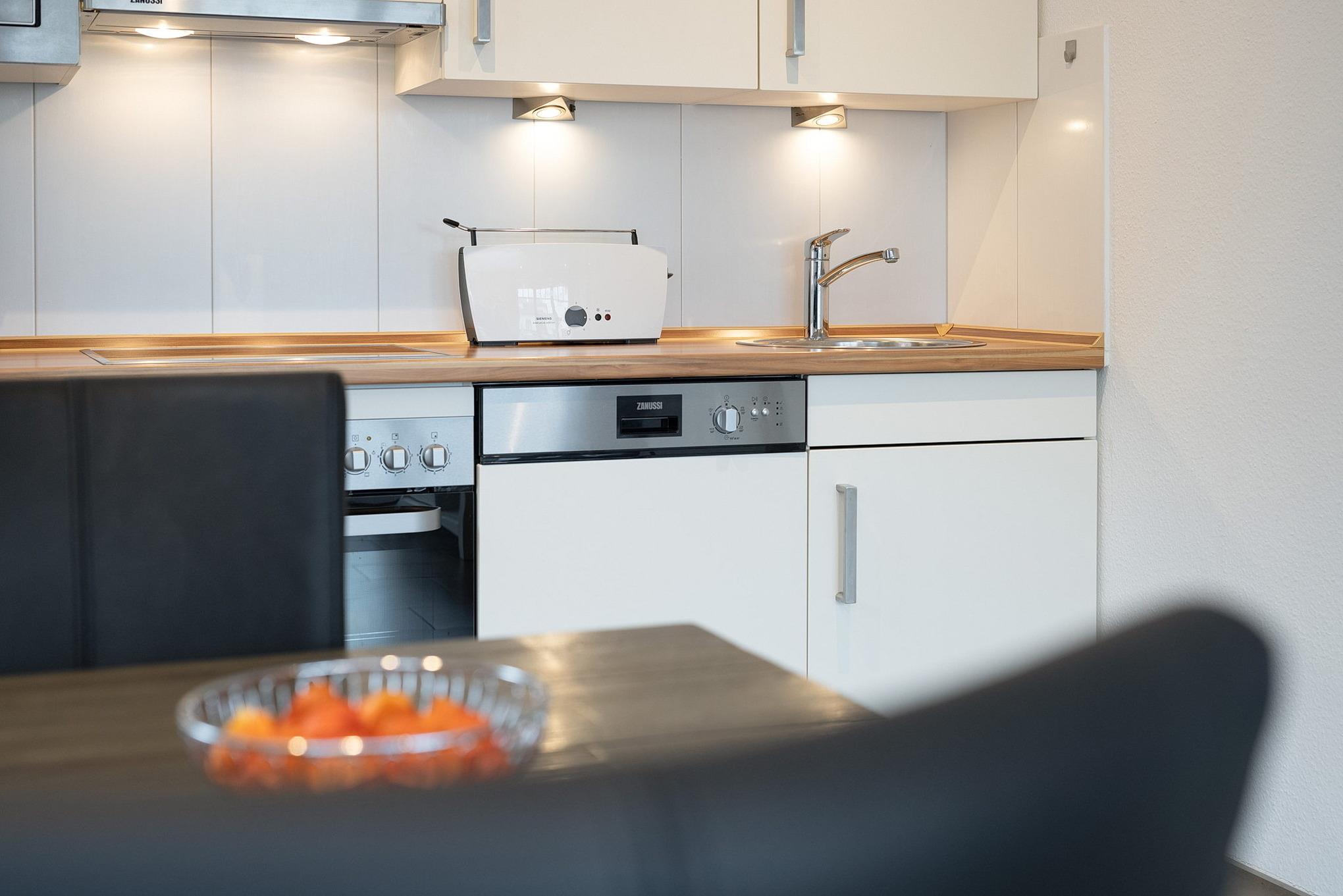 Moderne, zum Wohn- und Esszimmer offene Küchenzeile. Sie ist mit einem 4-Platten Cerankochfeld, einem Backofen, einem Kühlschrank mit kleinem 3-Sterne Gefrierfach, einer Spülmaschine, einem Toaster, Eierkocher, Wasserkocher, einer Mikrowelle und einer Kaffeemaschine ausgestattet.