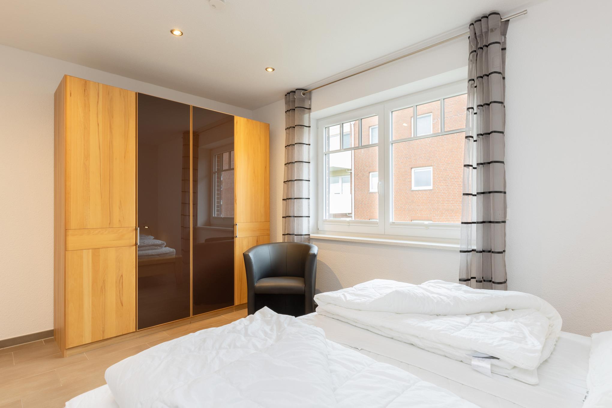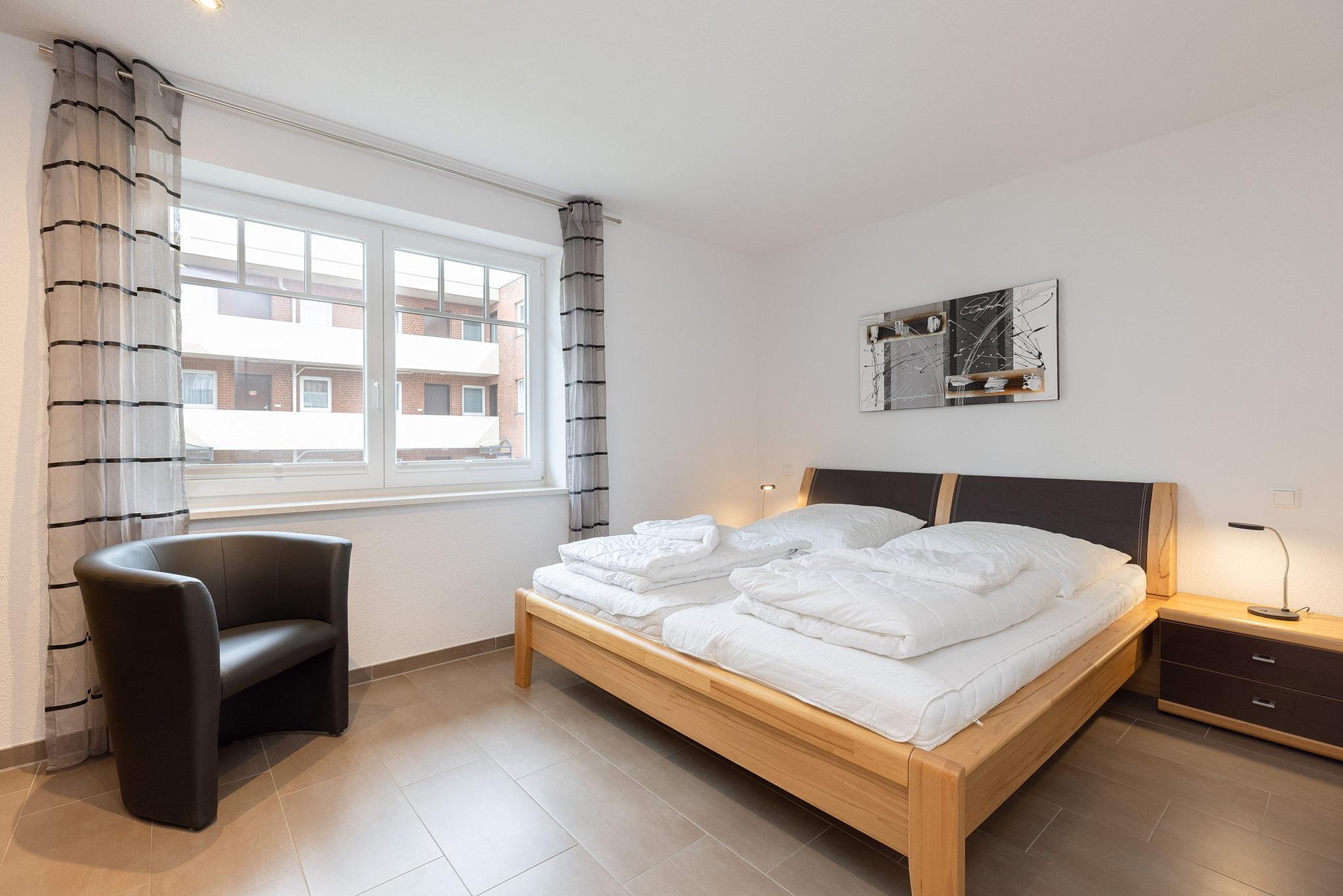 Separates, modern ausgestattetes Schlafzimmer mit einem Doppelbett und einem geräumigen Kleiderschrank. Das Fenster lässt sich durch einen elektrischen Außenrolladen vollständig verdunkeln, ein Fliegenschutzgitter ist vorhanden. Das Schlafzimmer ist gefliest (Fußbodenheizung).