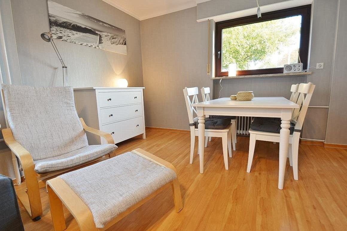Helles, freundliches Wohn- und Esszimmer mit direktem Zugang zum Balkon. Das Wohn- und Esszimmer ist mit einer Couch, einem Sessel und einem Essplatz für 4 Personen ausgestattet. Das Wohn- und Esszimmer ist mit Laminatboden ausgelegt. Zur Unterhaltung stehen ein Fernseher, ein DVD-Player und ein Radio zur Verfügung.