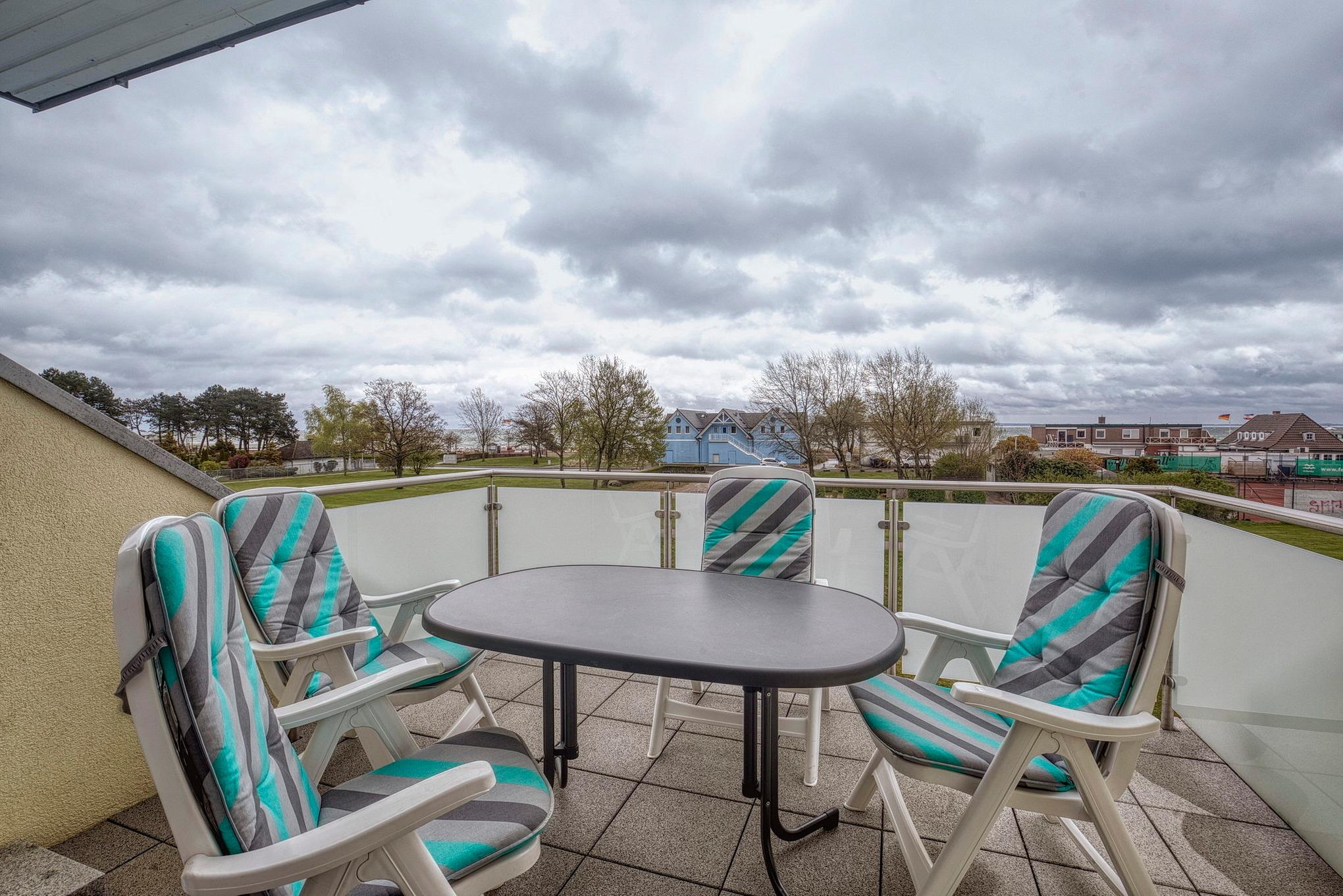 Moderne Ferienwohnung in Grömitz mit zwei Balkonen und Teilmeerblick, zentral und ruhig hinter dem Deich gelegen.