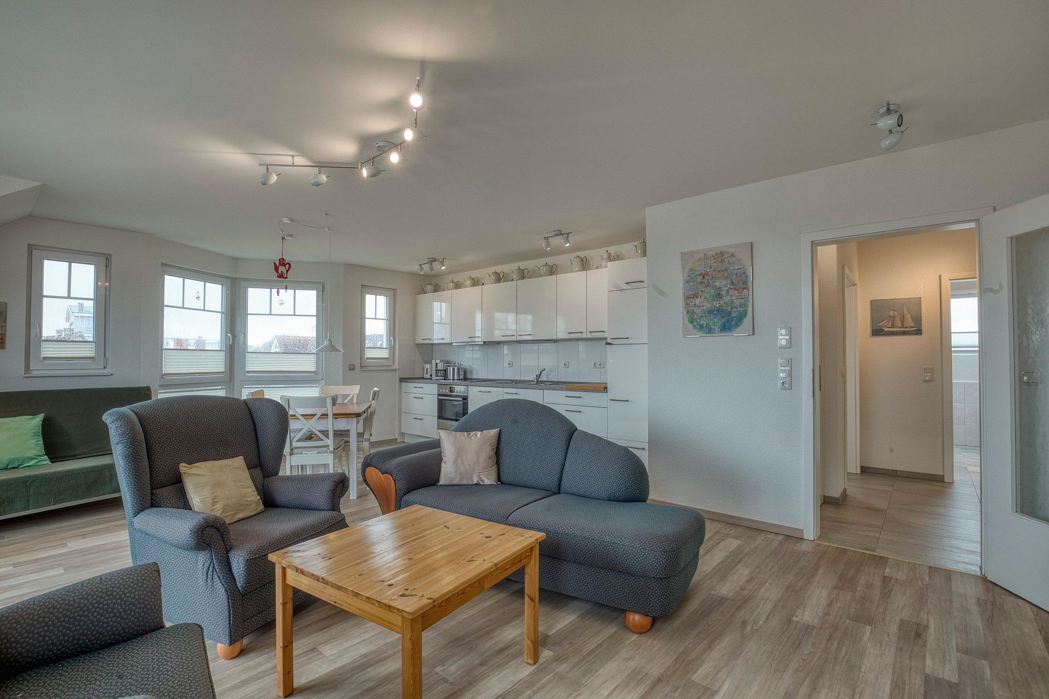 Das helle, geräumige Wohn- und Esszimmer ist mit einem Essplatz, eine Sitzecke (zwei Ohrensessel, eine Recamiere, Hocker) einem Kiefer-Couchtisch und Schlafsofa (140x200cm) ausgestattet. Vom Wohnbereich direkter Zugang zum ersten Balkon ( Süd-Ost Lage) mit Blick auf den Deich, Promenade und aufs Meer. Das Zimmer ist mit speziellen rutschgehemmten Laminat ausgelegt, die Fenster lassen sich durch elektrische Außenrollos vollständig verdunkeln. Zur Unterhaltung stehen ein Fernseher und eine Micro-Hi-Fi Anlage zur Verfügung.