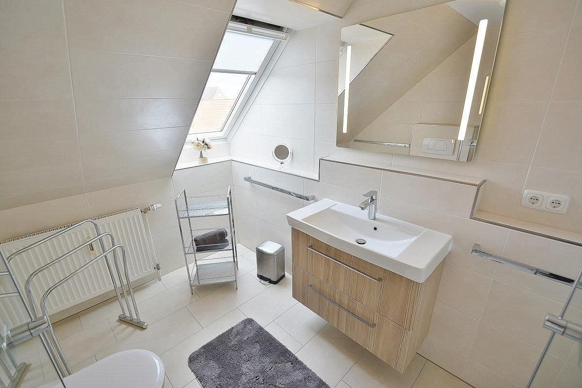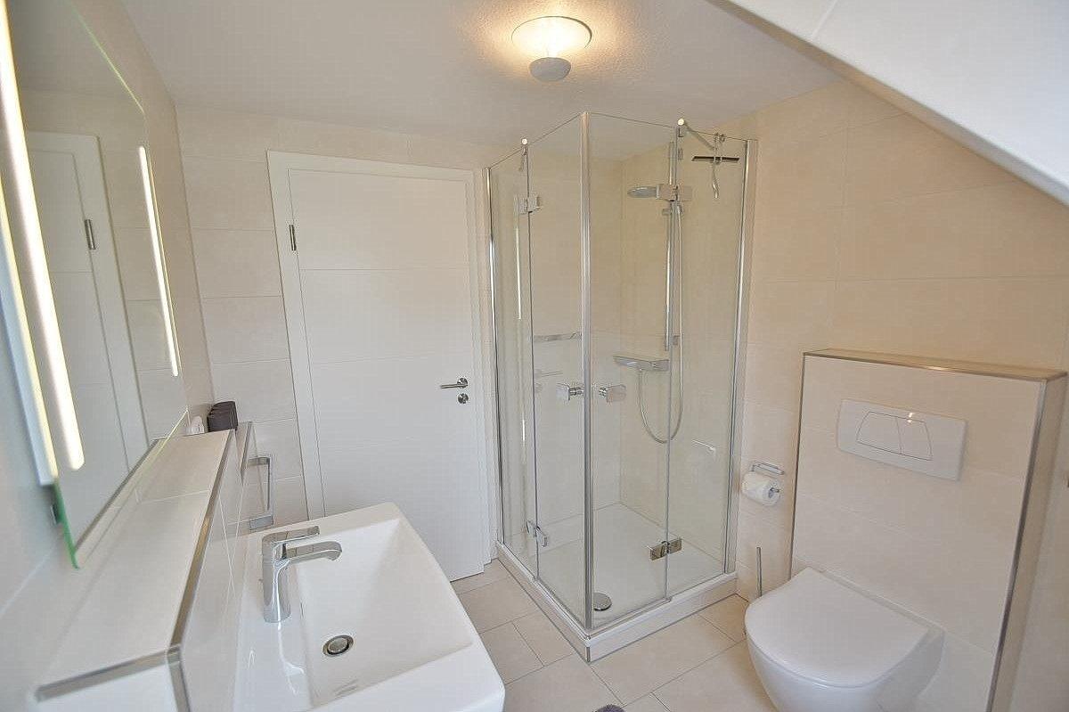 Modernes, hell gefliestes Tageslichtbad im 2.OG. Das Bad verfügt über eine Dusche, Waschbecken und WC. Ein weiteres modernes WC befindet sich im 1. OG.