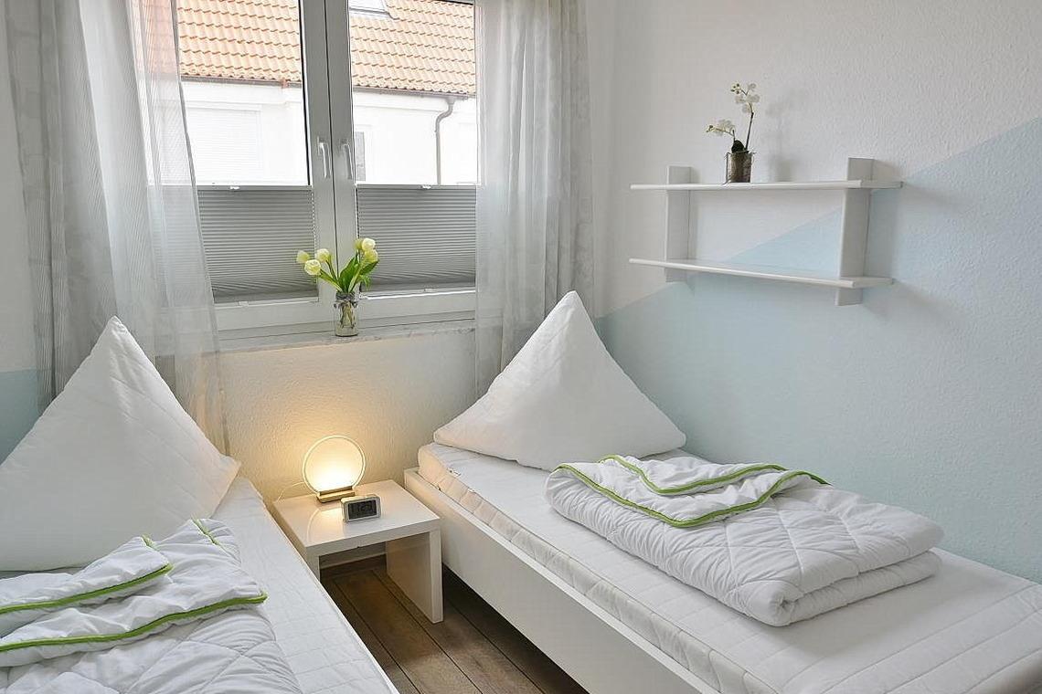 Das modern eingerichtete Schlafzimmer im 2. OG ist mit einem Doppelbett (2x 90x200cm), 2 Nachttischen und einem 2-türigen Kleiderschrank ausgestattet. Das Schlafzimmer ist mit Designer-Planken ausgelegt. Das Fenster lässt sich durch ein Plissee vollständig verdunkeln.
