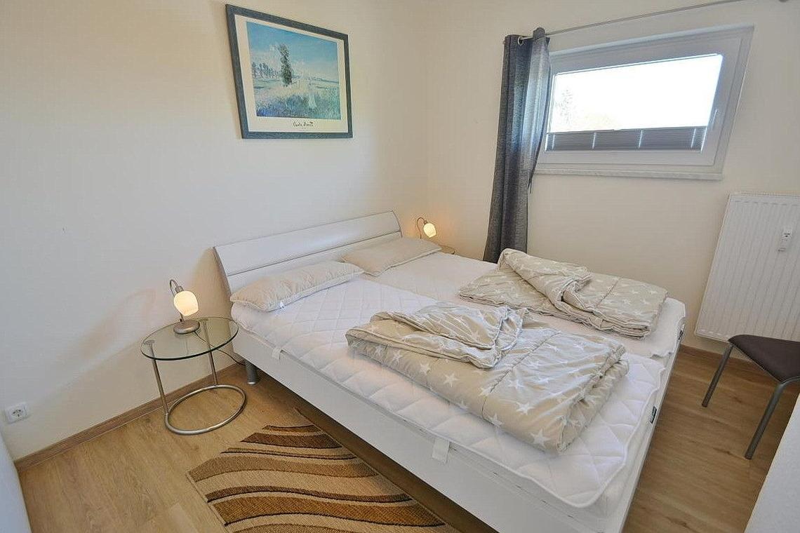 Das freundliche Schlafzimmer verfügt über ein Doppelbett (2x90x200cm) und einen 3-türigen Kleiderschrank. Der Schlafbereich ist mit Designerplanken ausgelegt. Das Fenster lässt sich durch ein Plissee verdunkeln.