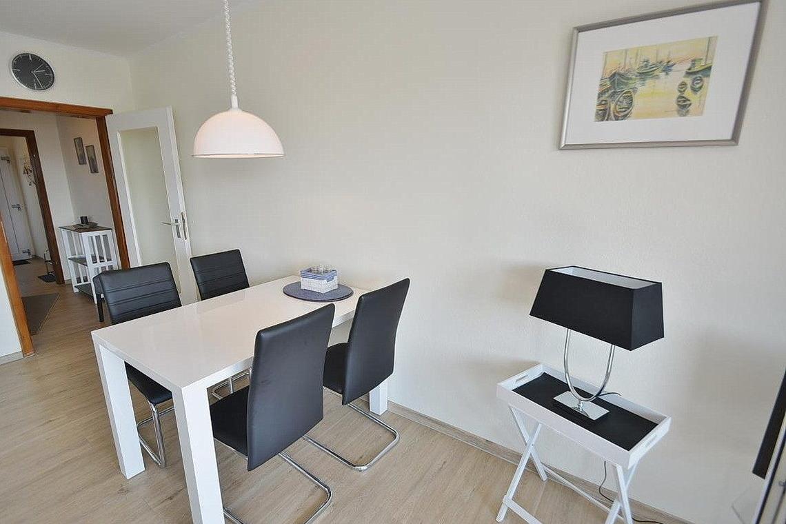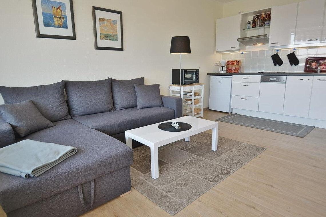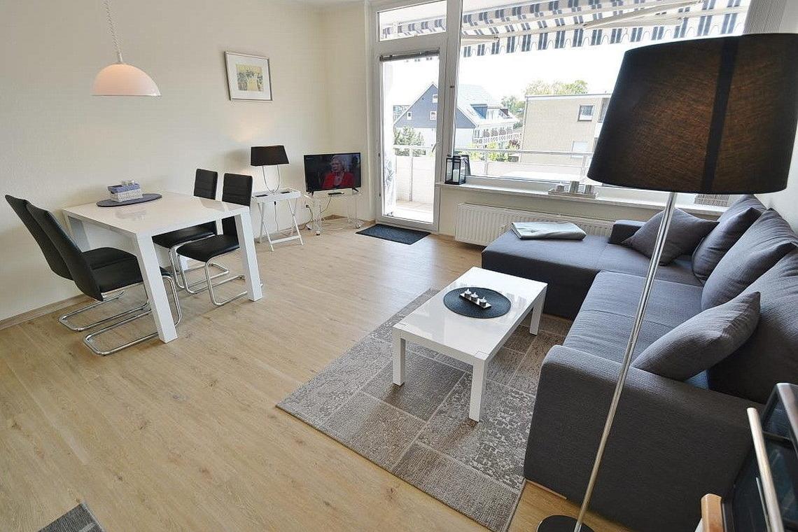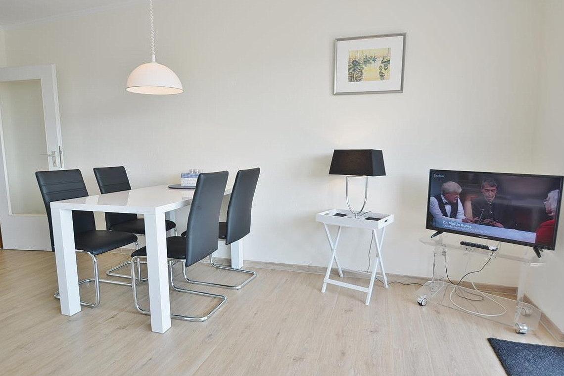 Moderner heller Wohnbereich mit direktem Zugang zum Balkon. Das Wohnzimmer ist mit einem Sofa mit Schlaffunktion sowie einem Essbereich für 4 Personen ausgestattet. Zur Unterhaltung steht ein Flachbildfernseher zur Verfügung. Der Raum ist mit Designerplanken ausgelegt. Die Fenster lassen sich durch Lamellen verdunkeln.