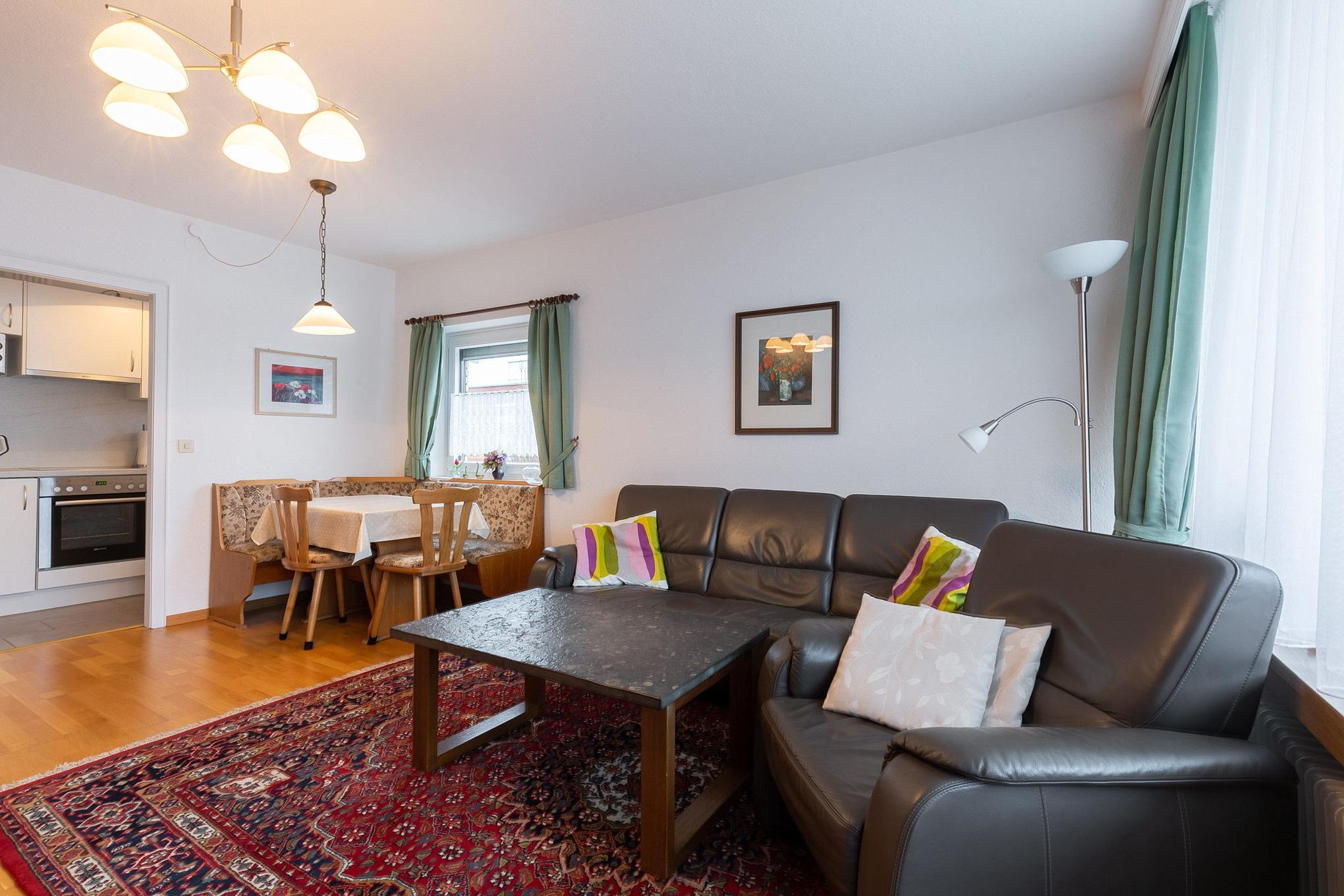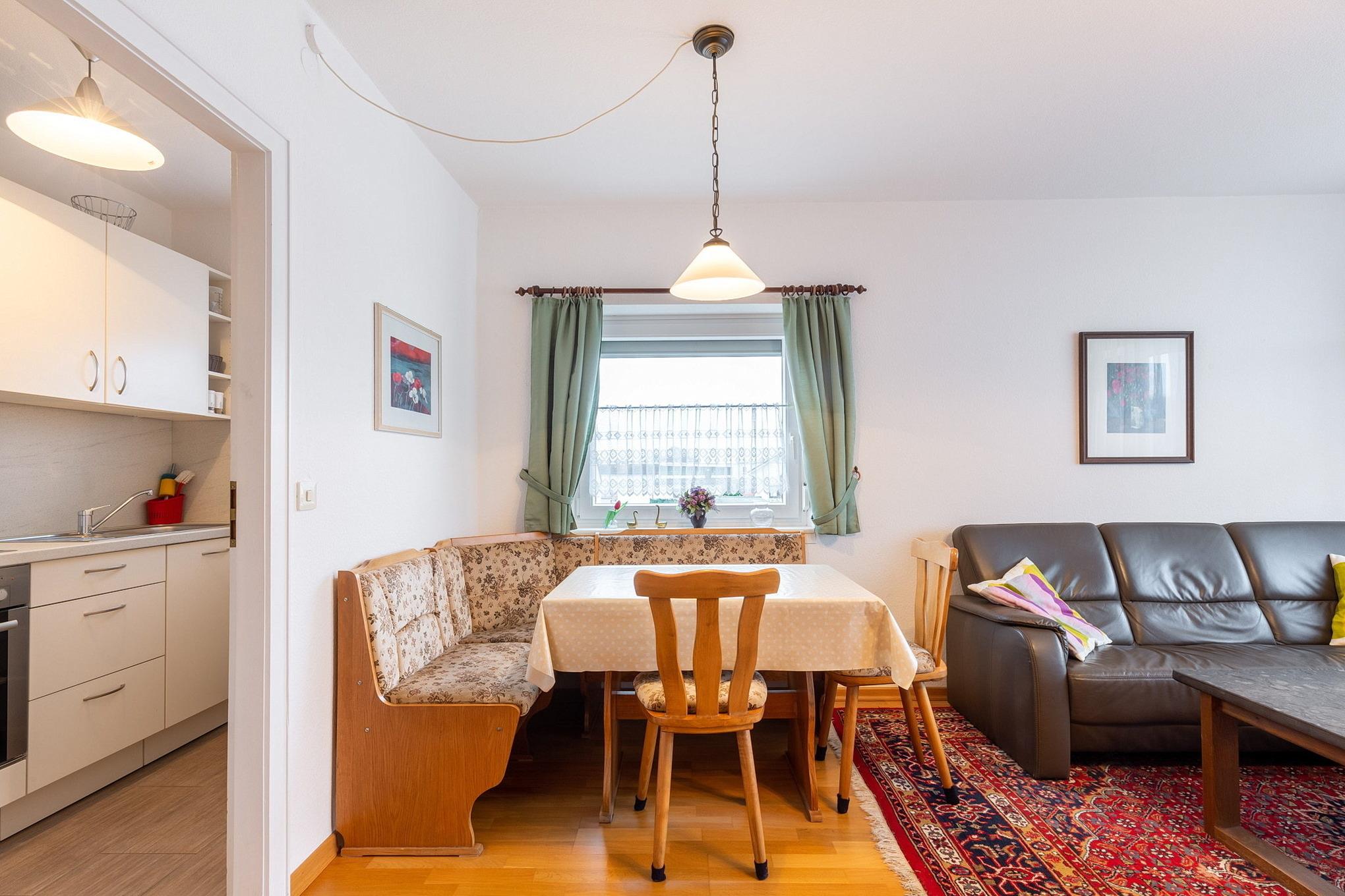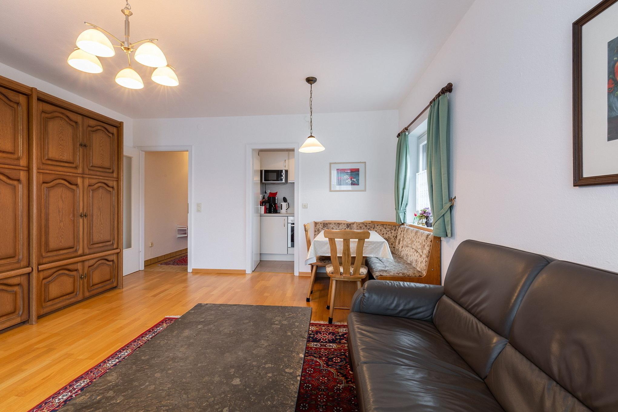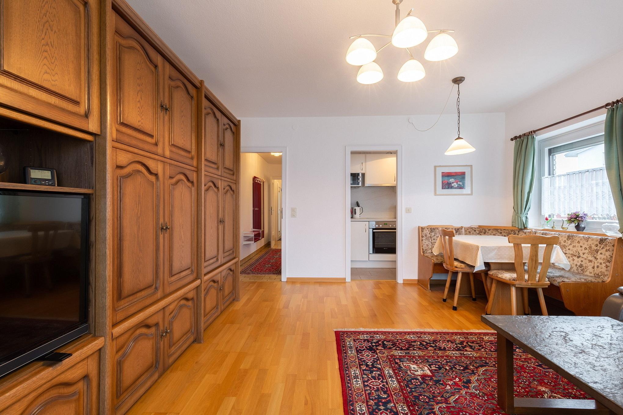 Helles, freundliches Wohn- und Esszimmer mit direktem Zugang zum Balkon. Das Wohn- und Esszimmer ist mit einer Ledercouch, einem Sessel, einem Couchtisch, einer Schrankwand mit Schrankbetten (2x 90x200cm) und einem Essplatz für 4 Personen ausgestattet. Zur Unterhaltung stehen ein TV-Flachbildschirm und ein Radio zur Verfügung. Das Wohn- und Esszimmer ist mit Echtholz-Parkettboden ausgelegt. Die Fenster lassen sich durch einen Vorhang und ein Innenrollo sowie einem Außenrollo am kleinen Fenster verdunkeln.