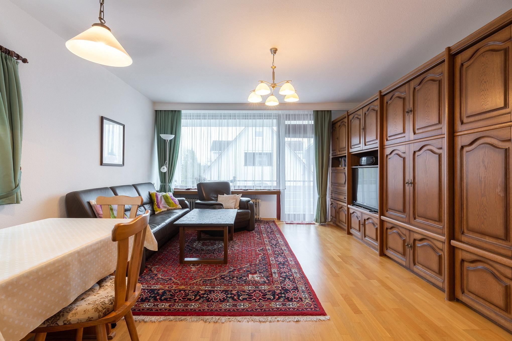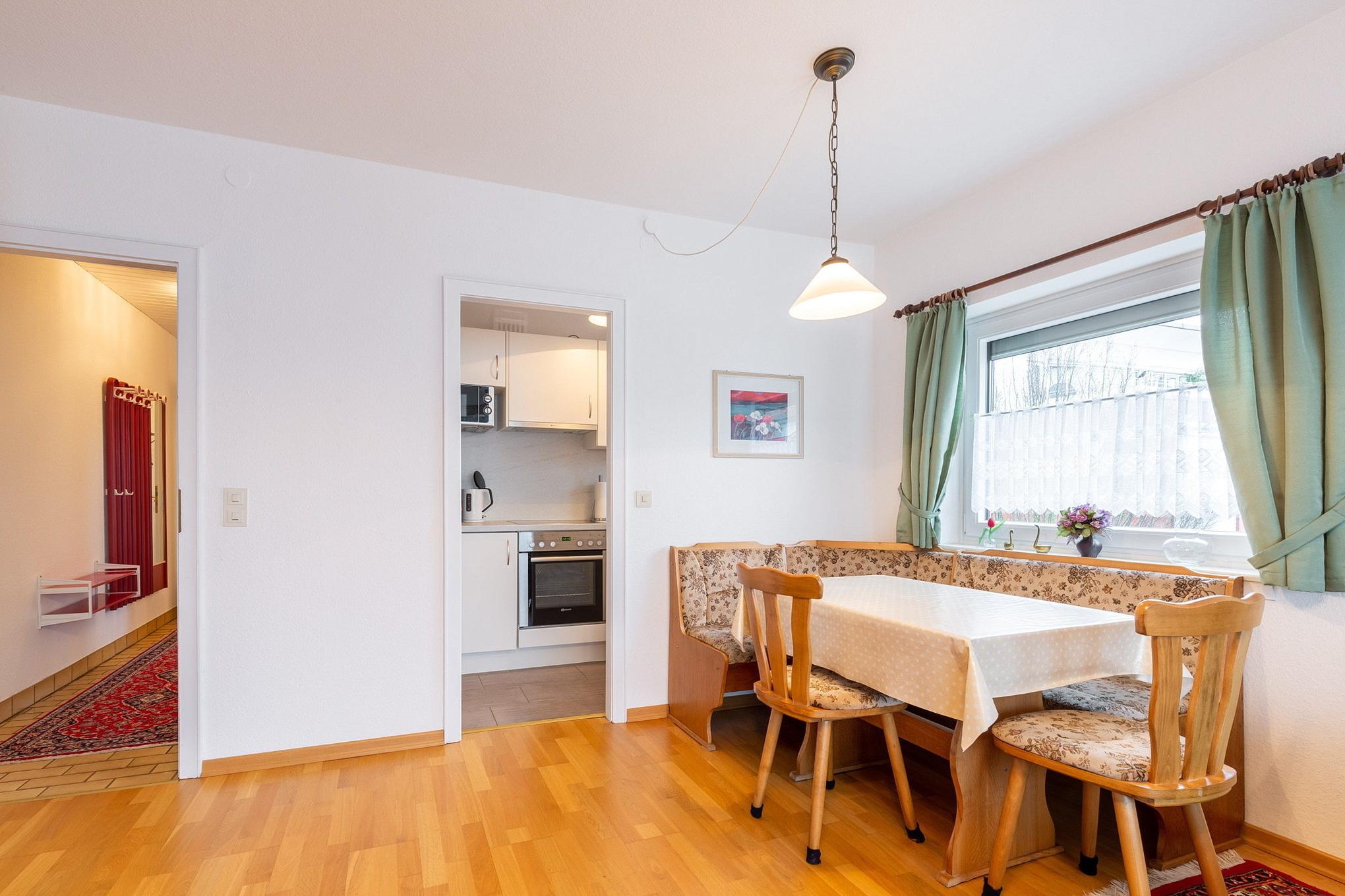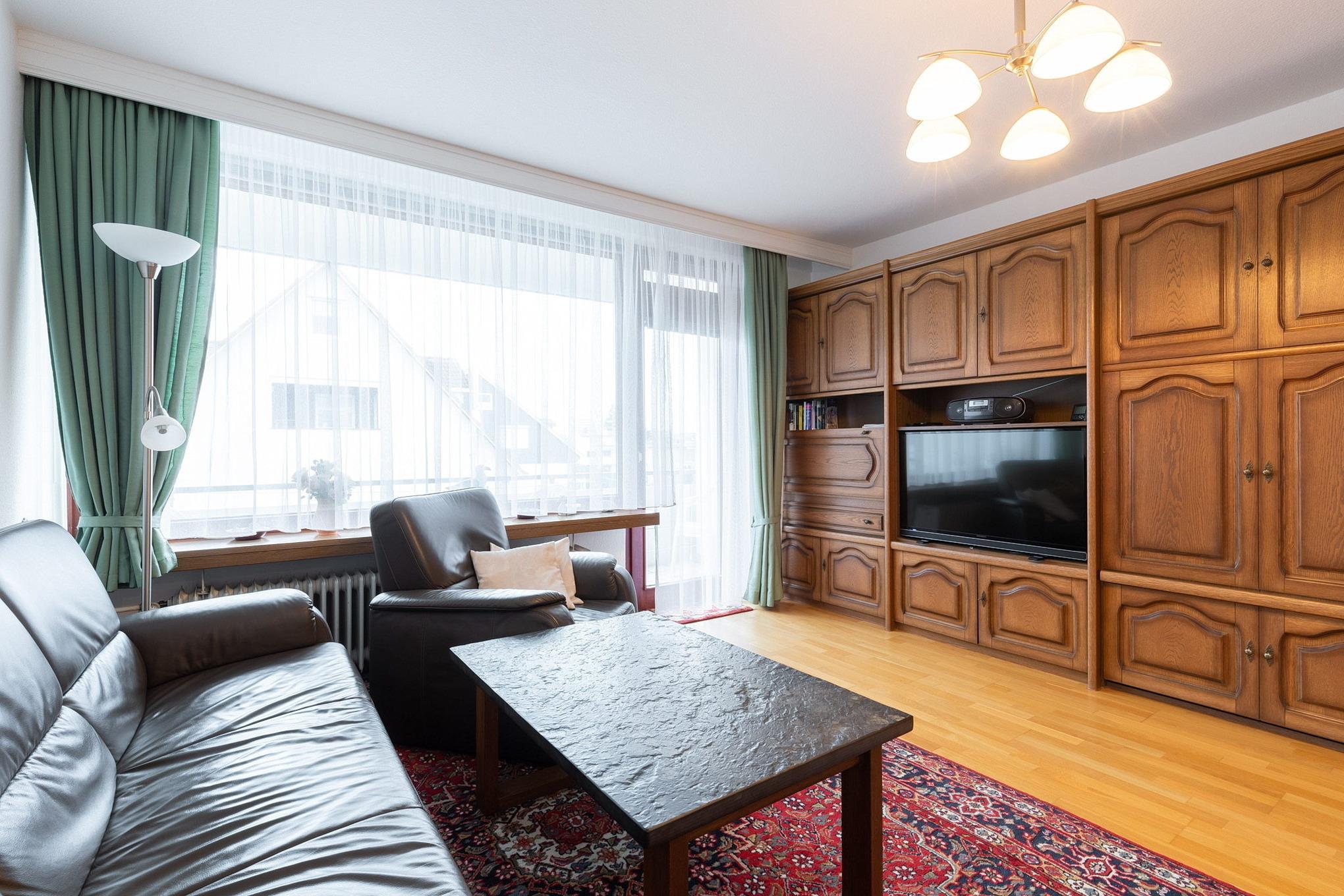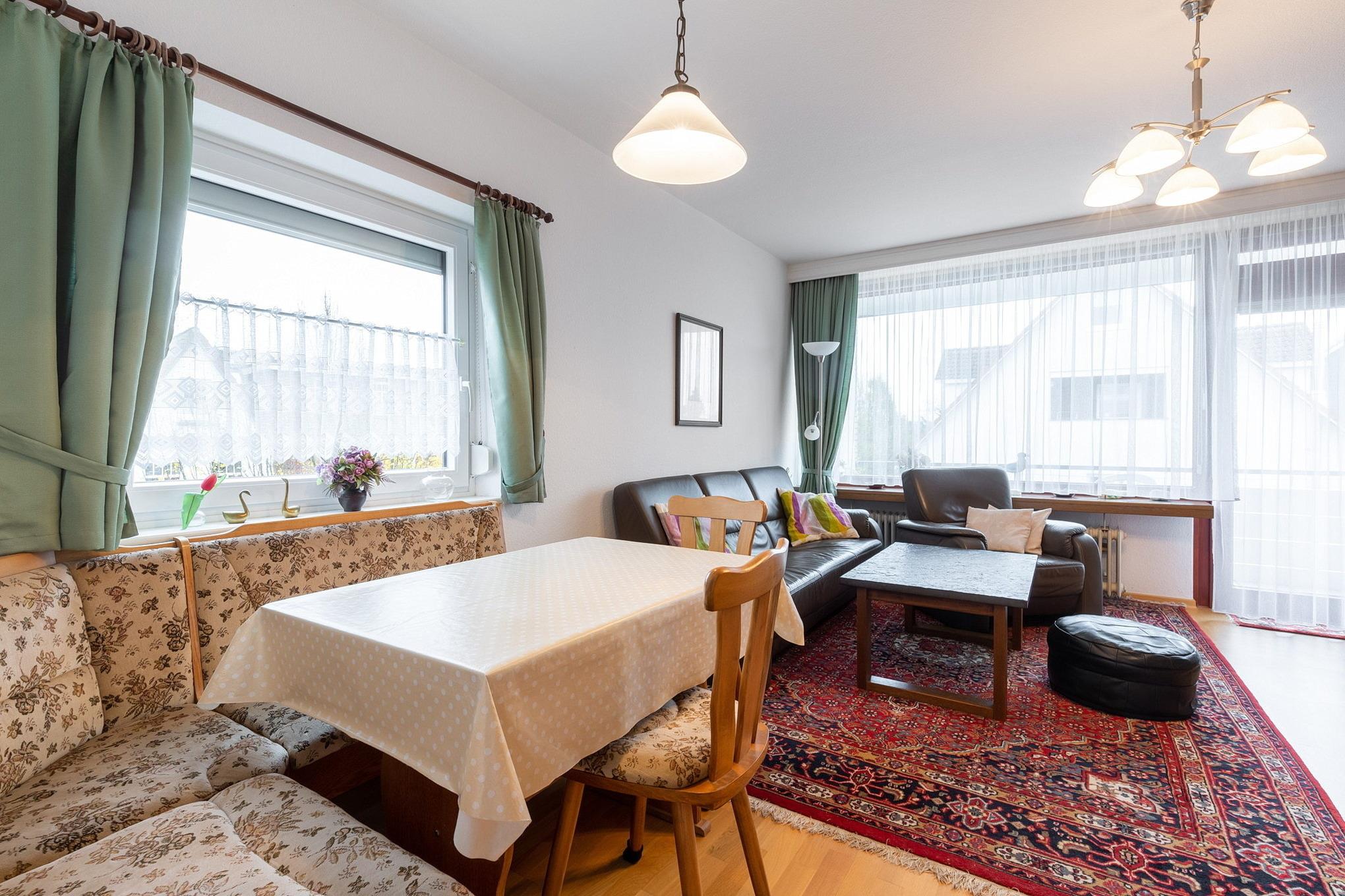 Helles, freundliches Wohn- und Esszimmer mit direktem Zugang zum Balkon. Das Wohn- und Esszimmer ist mit einer Ledercouch, einem Sessel, einem Couchtisch, einer Schrankwand mit Schrankbetten (2x 90x200cm) und einem Essplatz für 4 Personen ausgestattet. Zur Unterhaltung stehen ein TV-Flachbildschirm und ein Radio zur Verfügung. Das Wohn- und Esszimmer ist mit Echtholz-Parkettboden ausgelegt. Die Fenster lassen sich durch einen Vorhang und ein Innenrollo sowie einem Außenrollo am kleinen Fenster verdunkeln.
