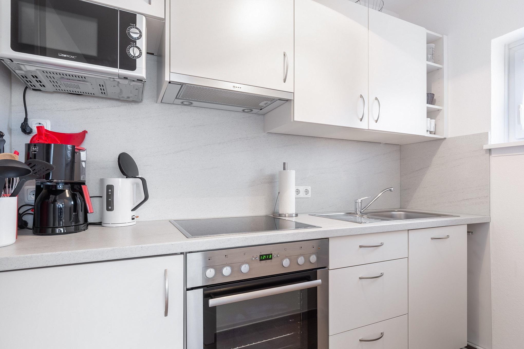Neue, moderne, komplett eingerichtete, separate Küche mit Fenster. Die Küche ist mit einem 4-Platten Cerankochfeld, einem Umluftbackofen, einem Kühlschrank mit kleinem 3-Sterne Gefrierfach, einer Kaffeemaschine, einer Mikrowelle, einem Toaster, Wasserkocher und Eierkocher ausgestattet.