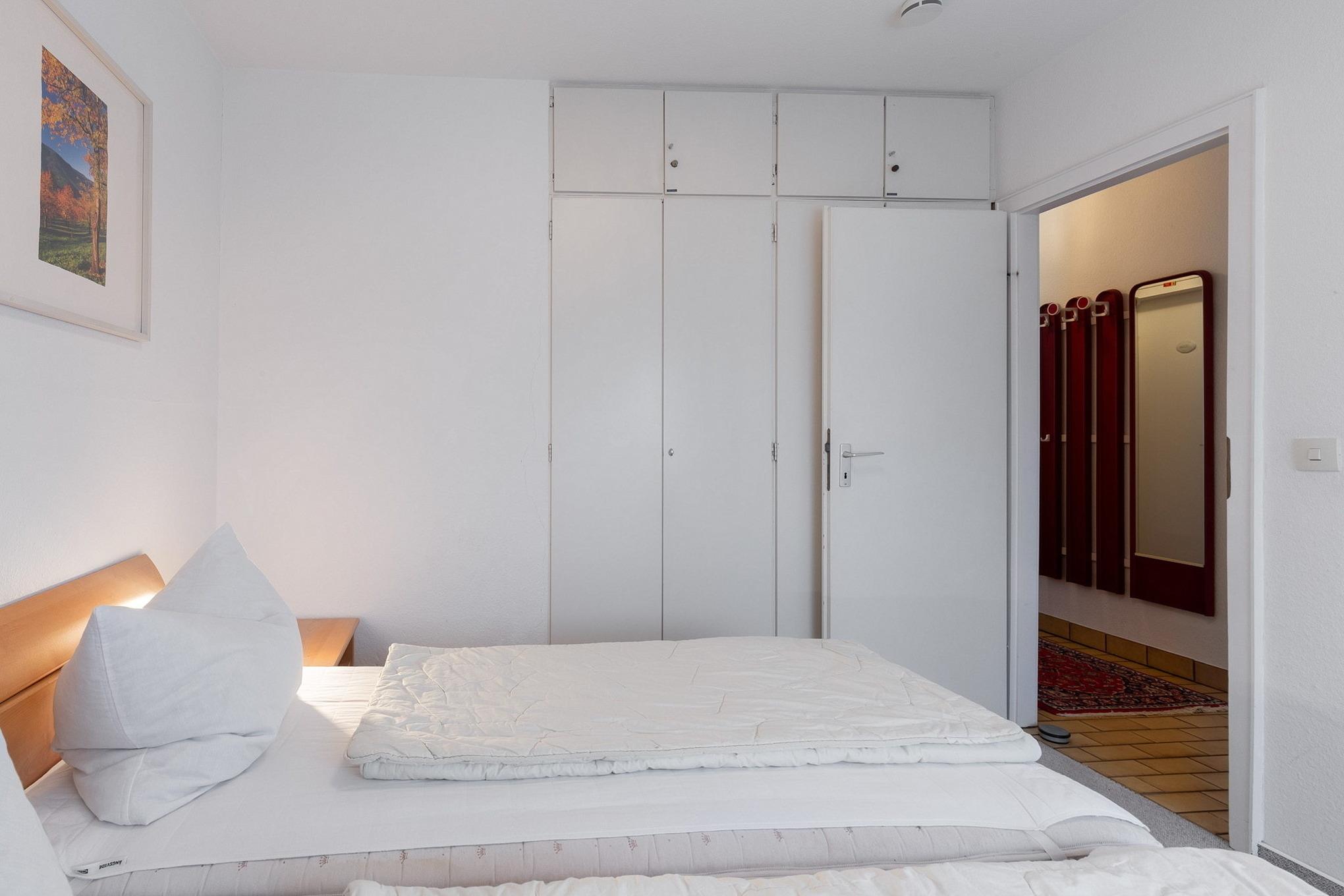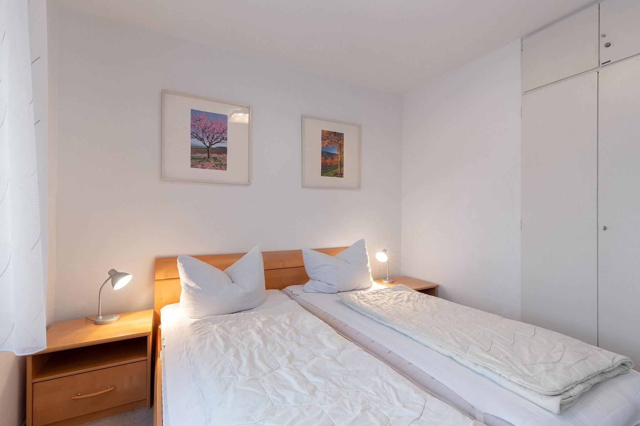 Freundliches, separates Schlafzimmer mit einem Doppelbett (2x 90x200cm), einem Einbaukleiderschrank und 2 Nachttischen. Das Schlafzimmer ist mit Teppichboden ausgelegt. Das Fenster lässt sich durch ein Außenrollo vollständig verdunkeln.